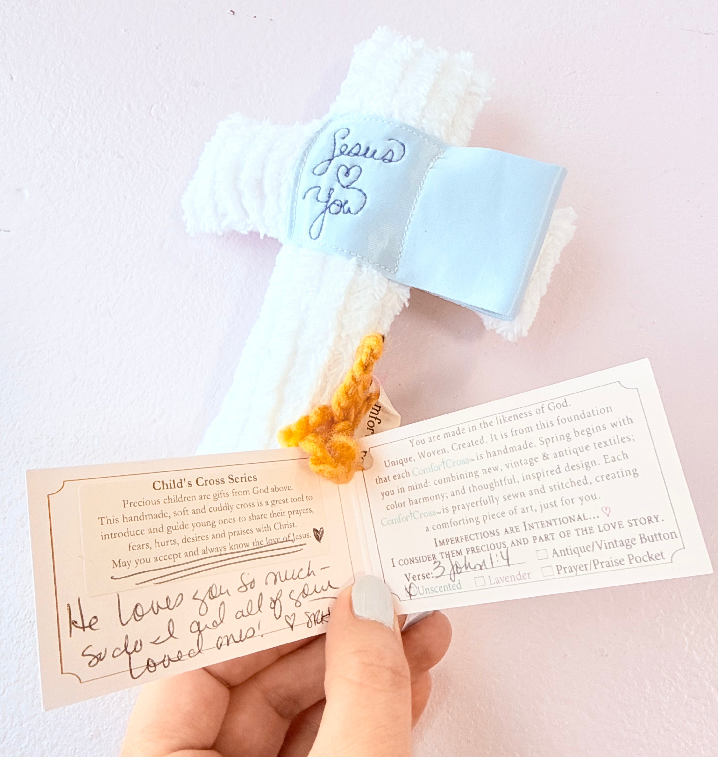 Child Cross - Comfort Cross (White Satin Tag/Blue Wording)