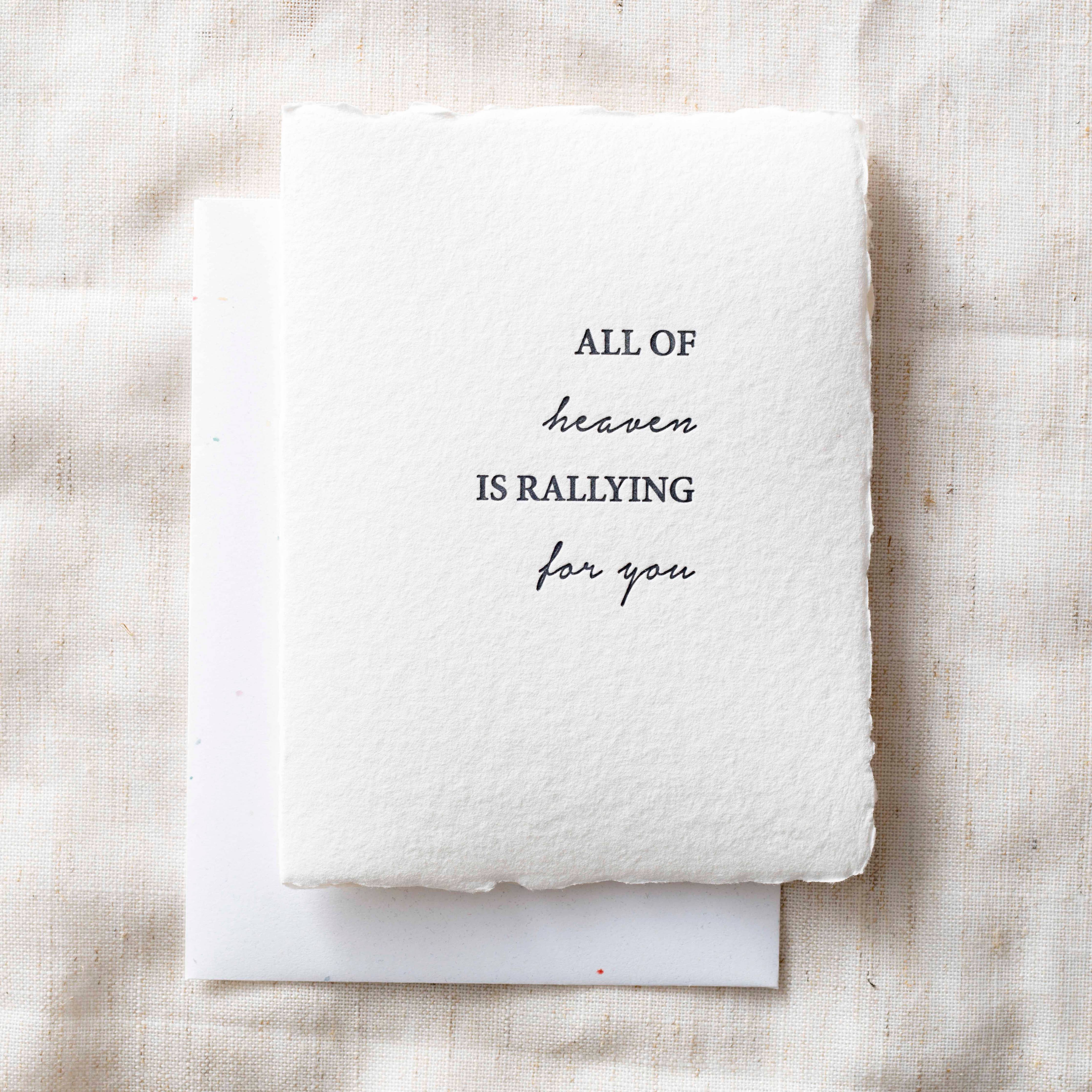 Created with care, “All of Heaven is Rallying for You” card is letterpress printed on handmade deckled edge paper—crafted to be kept, framed, and cherished. Printed in grey ink and paired with an off-white recycled envelope, this card carries a message of quiet strength and encouragement.