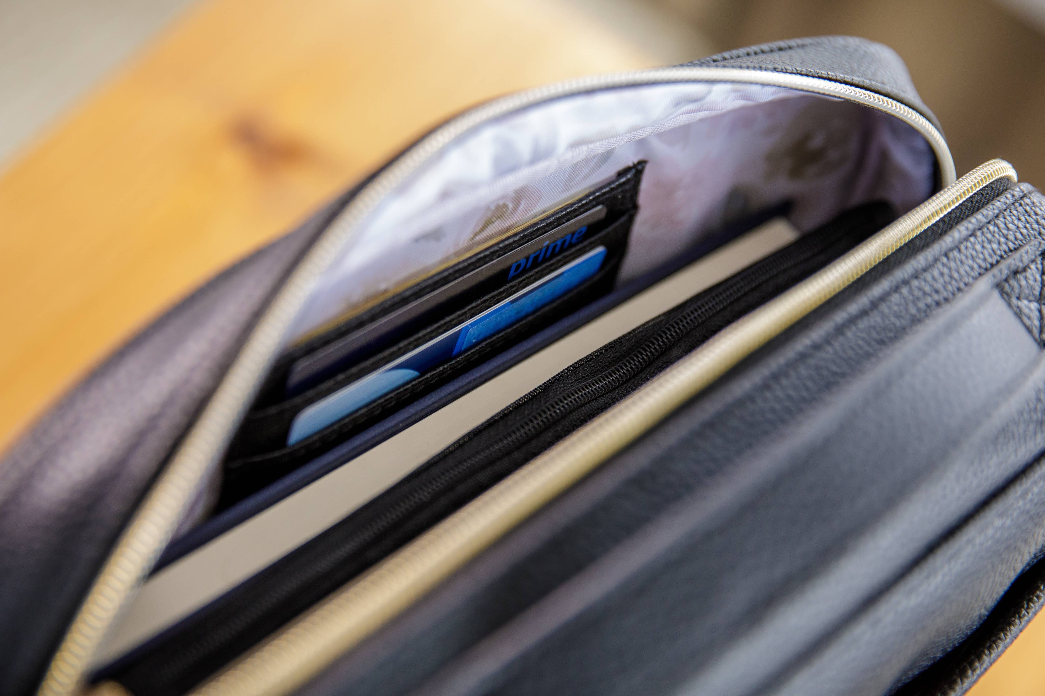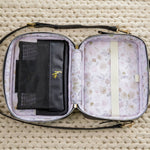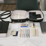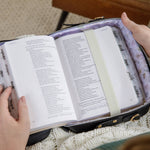 This Bible Bag is for the women who like to carry the essentials with plenty of room for all their Bible study supplies. The Bible Bag is equipped with a detachable crossbody strap for an effortless carry, and a convenient spine handle. The interior boasts of a beautiful floral design, credit card slots, notebook pouch, detachable pen (and supply) holder, an elastic Bible bookmark, and a pen slot. This Bible Bag is crafted from Premium water-resistant Vegan Leather, complimented with beautiful gold accents and a heat-stamped gold foil floral design on the front.