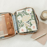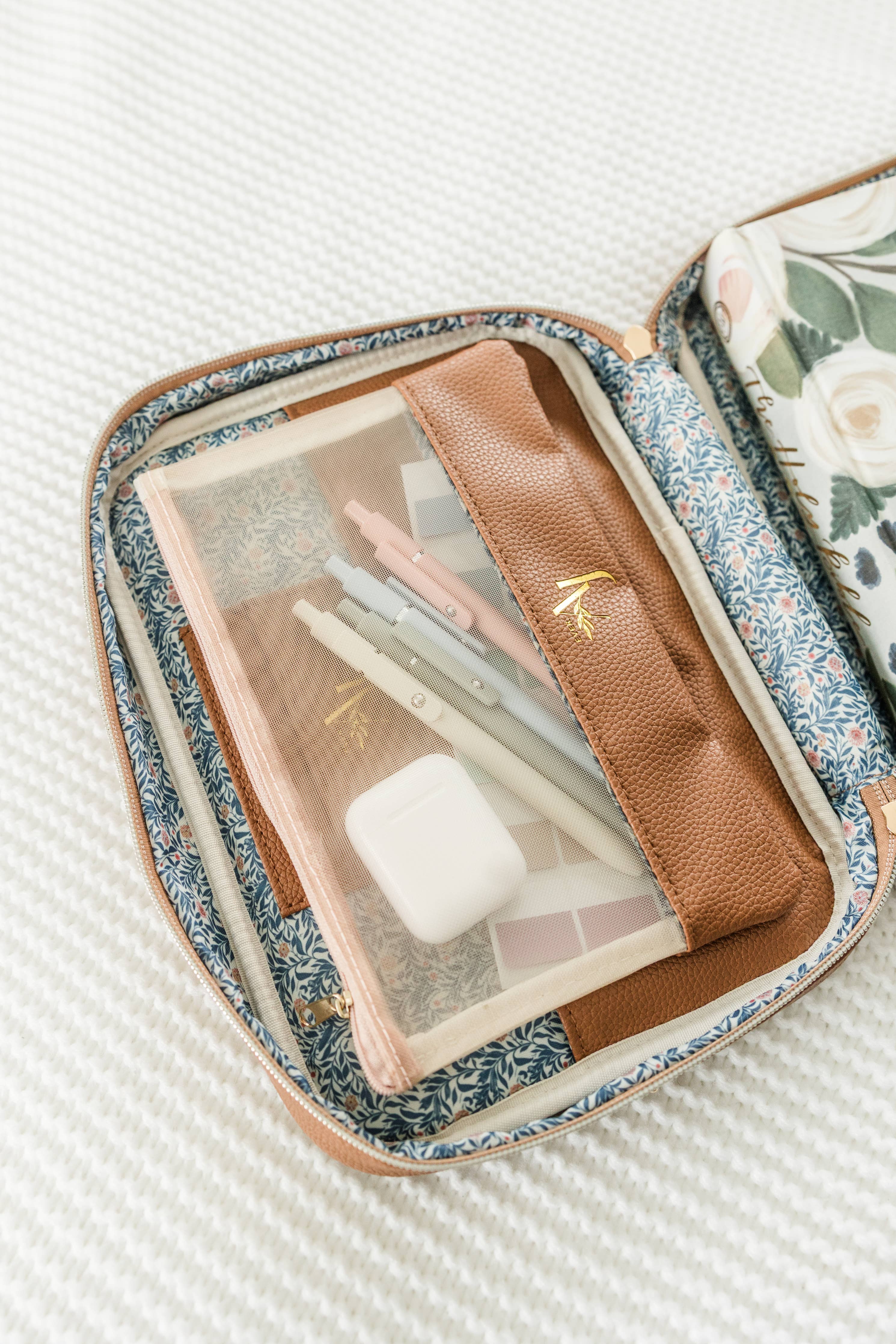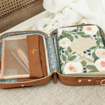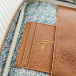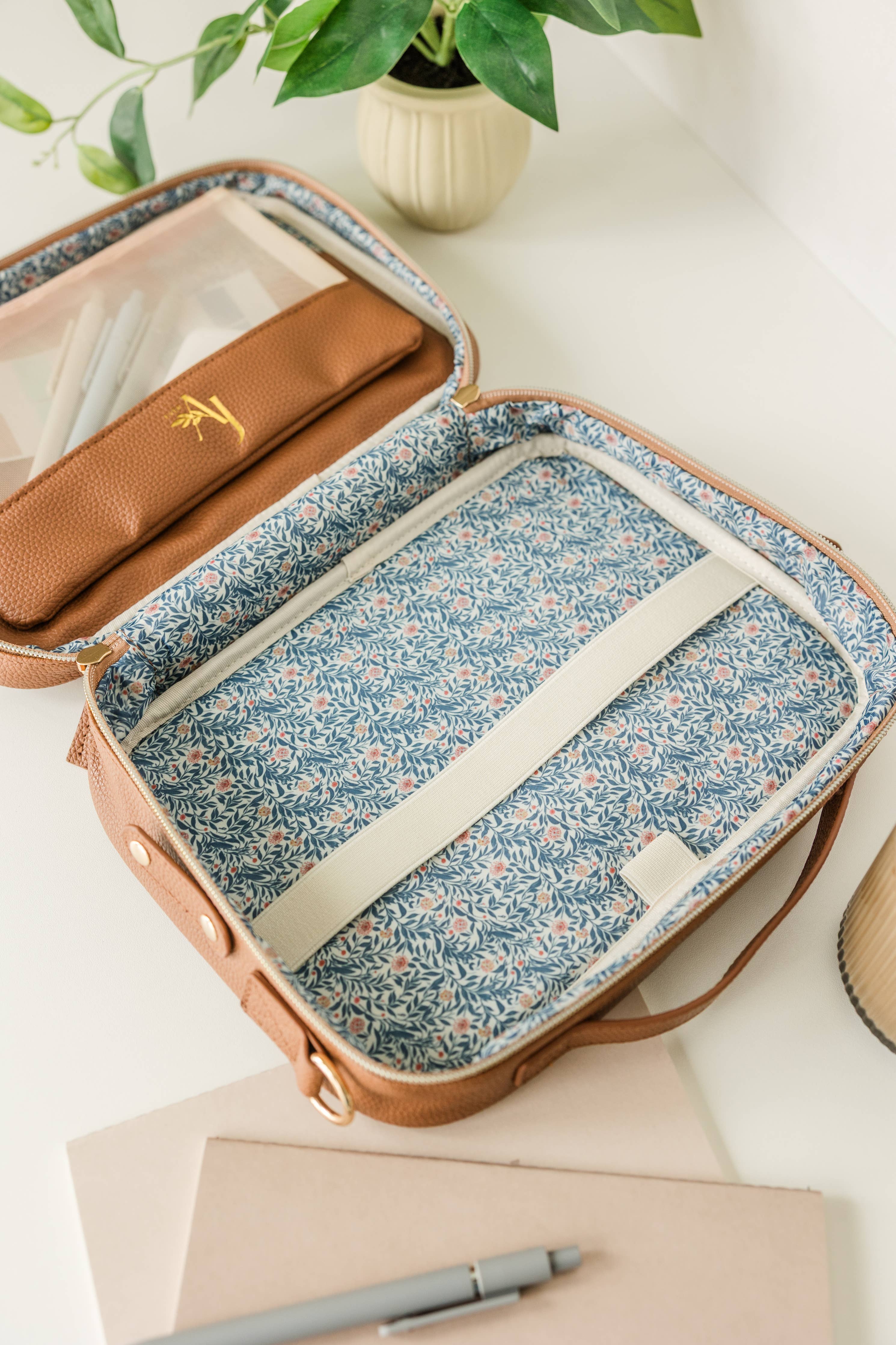 This Bible Bag in Mocha is for the women who like to carry the essentials with plenty of room for all their Bible study supplies. This vegan leather Bible bag is equipped with a detachable crossbody strap for an effortless carry, and a convenient spine handle. The interior boasts of a beautiful floral design, credit card slots, notebook pouch, detachable pen holder, an elastic Bible bookmark, and a pen slot.