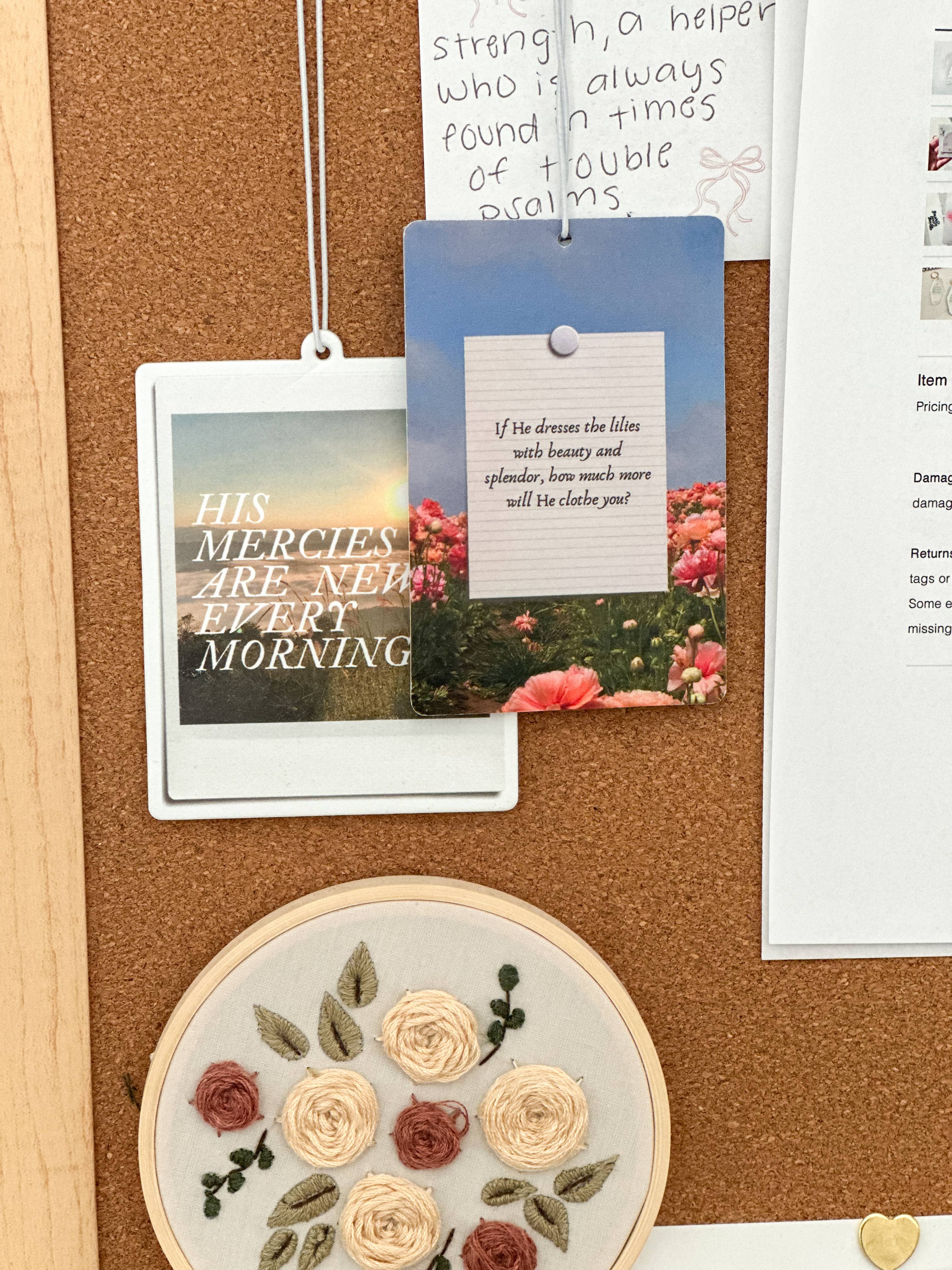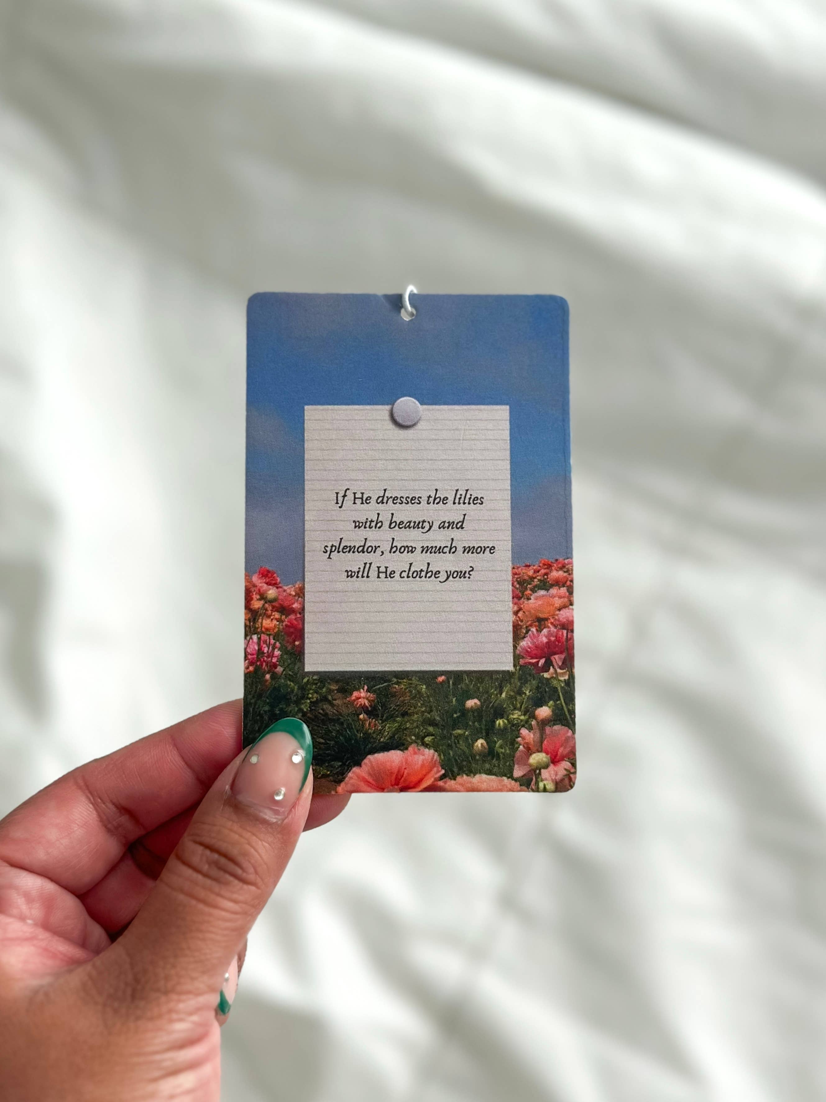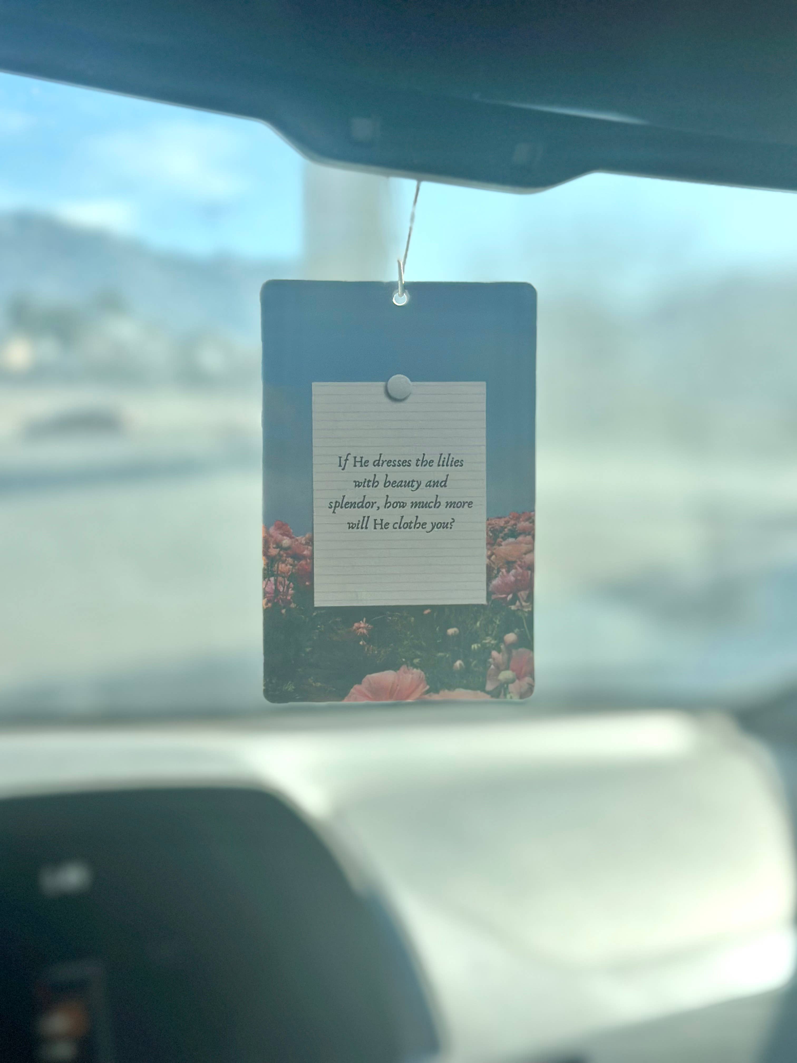 Car Air freshener with the Bible verse; "If he dresses the lilies with beauty and splendor, How much more will He clothe you?" Matthew 6:28 Great reminder to have in your car everyday! The Lord's mercies are new, His love is constant for YOU! Scent: Melon Size: 4 in x 3 in Double sided
