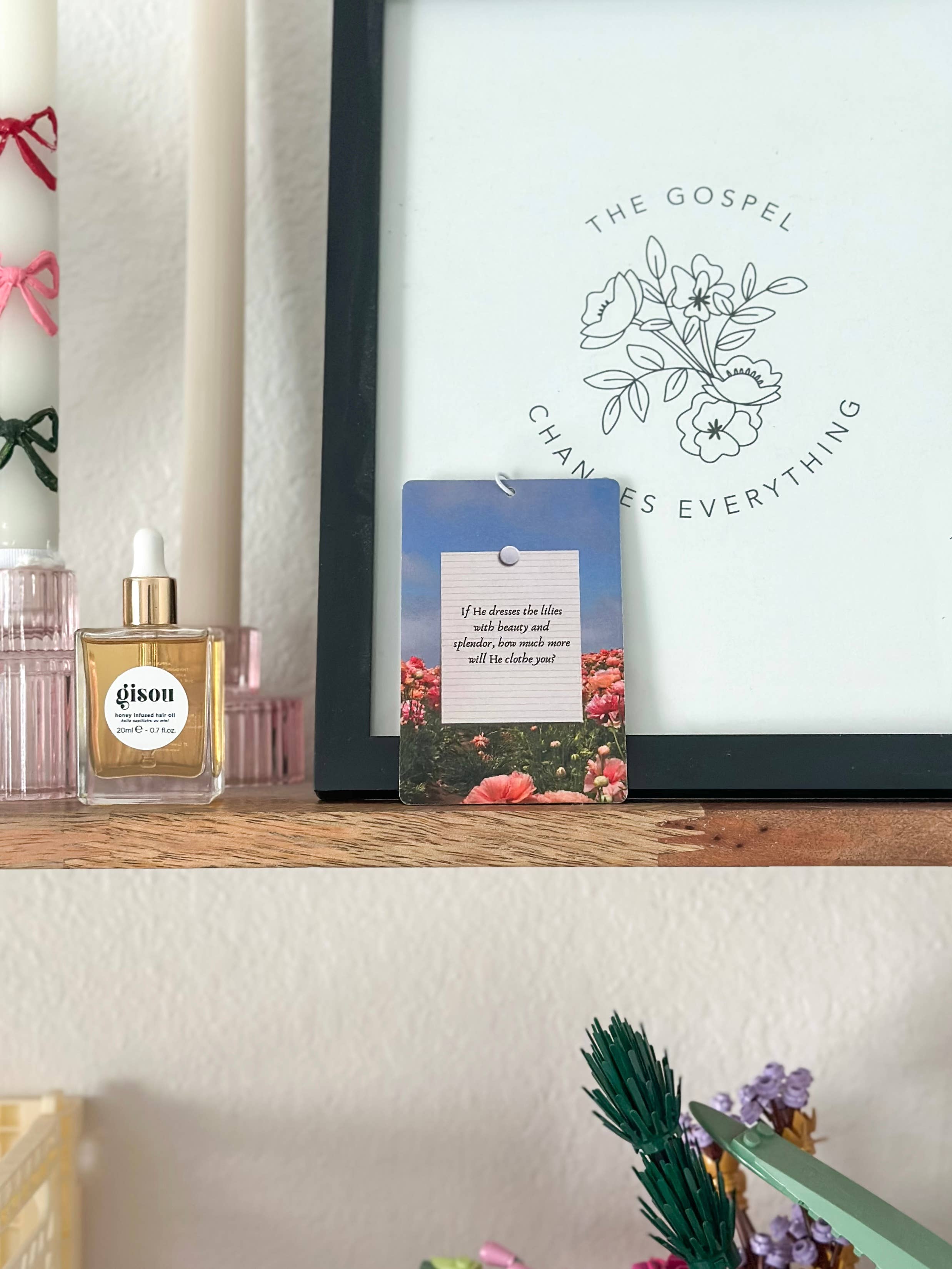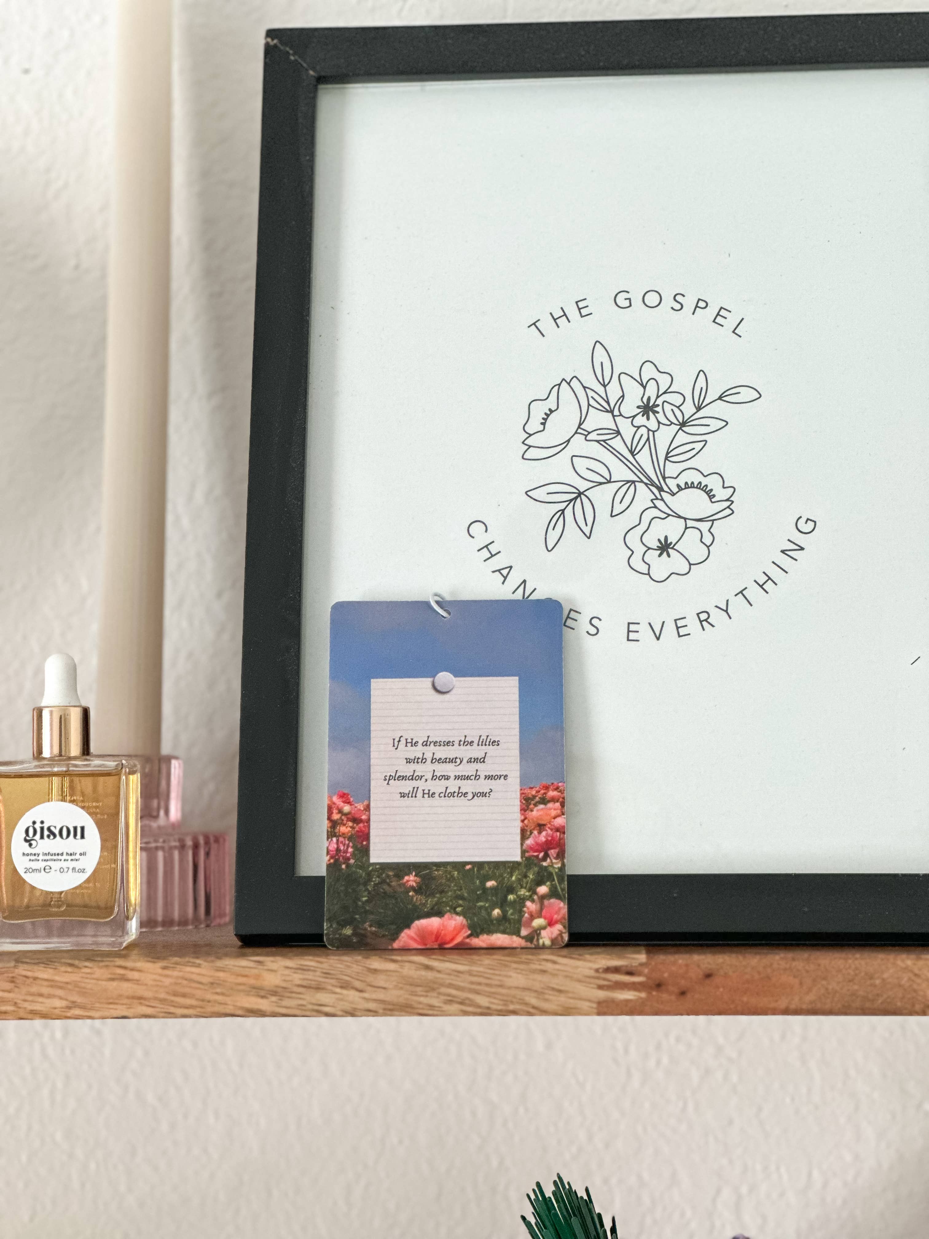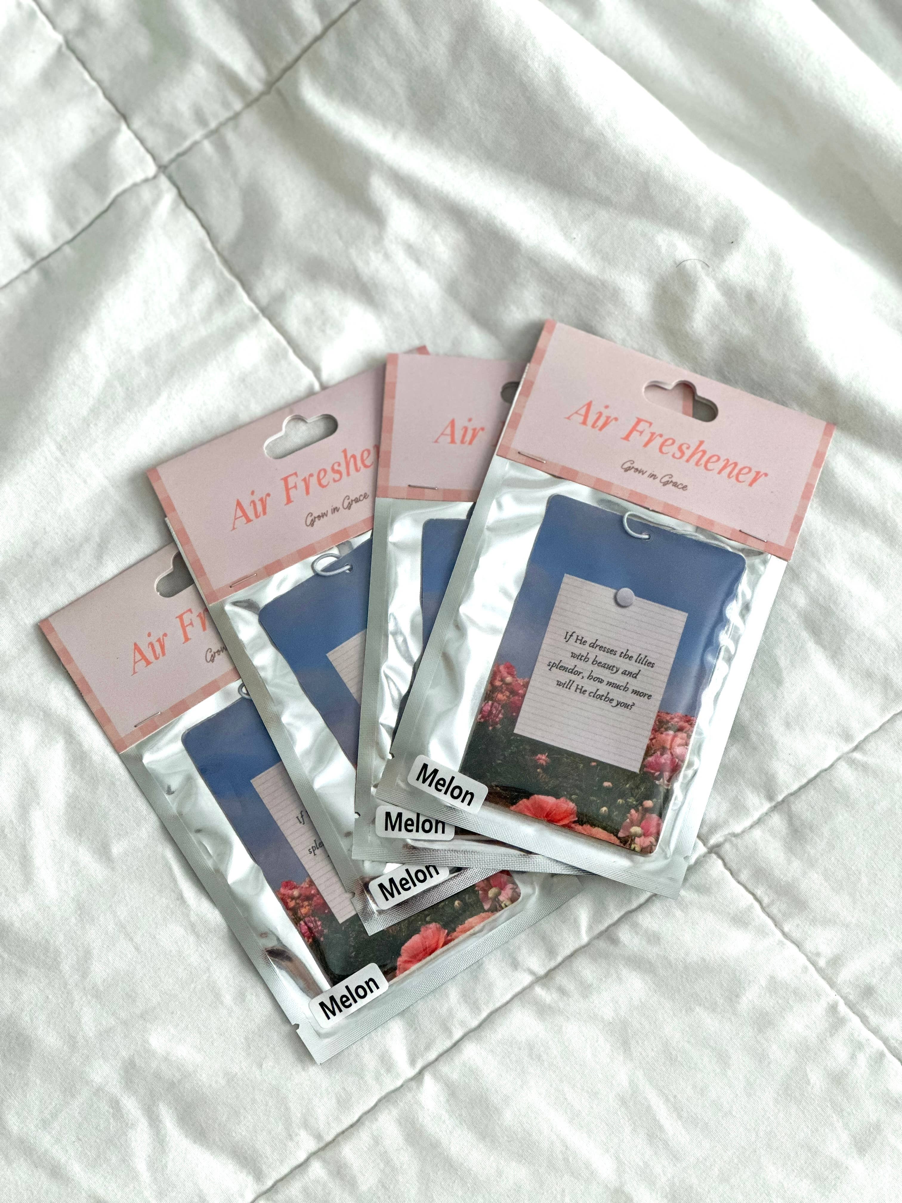 Car Air freshener with the Bible verse; "If he dresses the lilies with beauty and splendor, How much more will He clothe you?" Matthew 6:28 Great reminder to have in your car everyday! The Lord's mercies are new, His love is constant for YOU! Scent: Melon Size: 4 in x 3 in Double sided