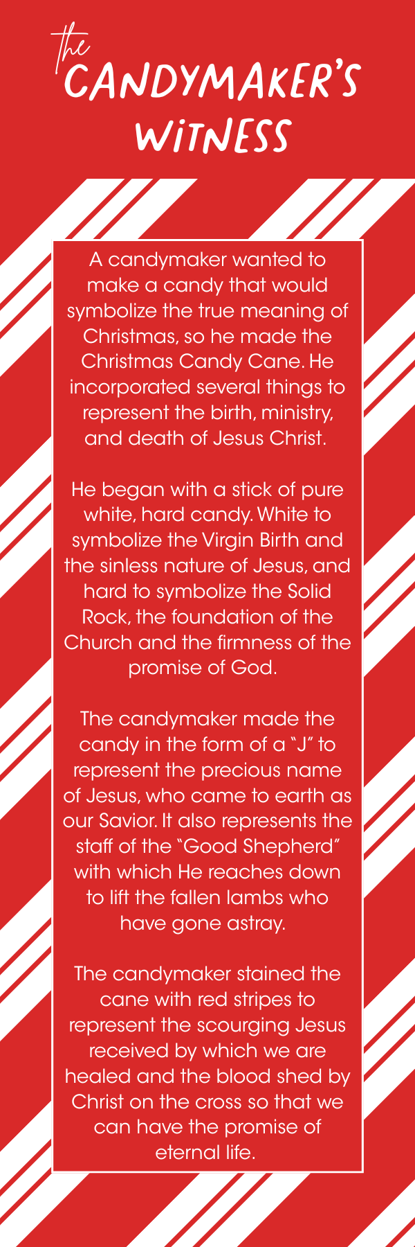 These bookmarks include a Candy Cane with the story of the Candymaker's Witness. The packaged Candy Cane is easily removed from the bookmark to leave you with a keepsake bookmark that you can use. Printed on quality cardstock. Perfect for yourself or a gift for Students, Youth Groups, Sunday School, Fundraisers, and More!