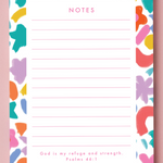 This is our lined page notepad, with a star and floral pattern around the edge of this notepad. With a colour palette of pink and teal. This notepad is a lovely way to record your shopping, leave a note or give as a gift for a birthday, Christmas present or just because you are thinking of someone. Each page of this notepad has the verse from Psalm 46:1, ‘God is my refuge and strength.’ What an encouragement to read daily on your notepad.