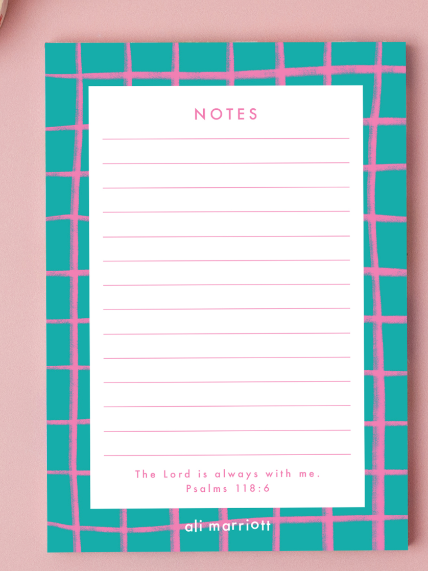 This is our lined page notepad, with a checked pattern around the edge of this notepad. With a colour palette of pink and teal. This notepad is a lovely way to record your shopping, leave a note or give as a gift for a birthday, Christmas present or just because you are thinking of someone. Each page of this notepad has the verse from Psalm 118:6, ‘The Lord is always with me.’ What an encouragement to read daily on your notepad.