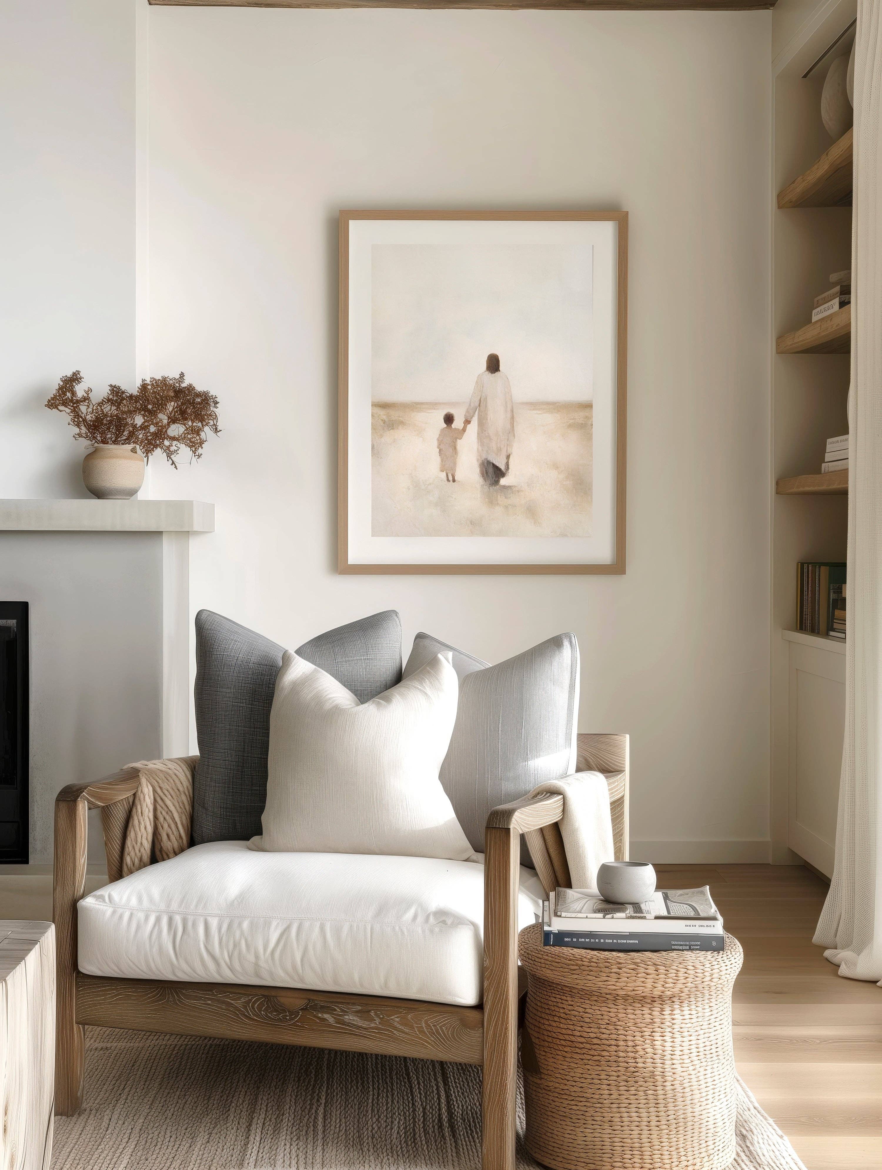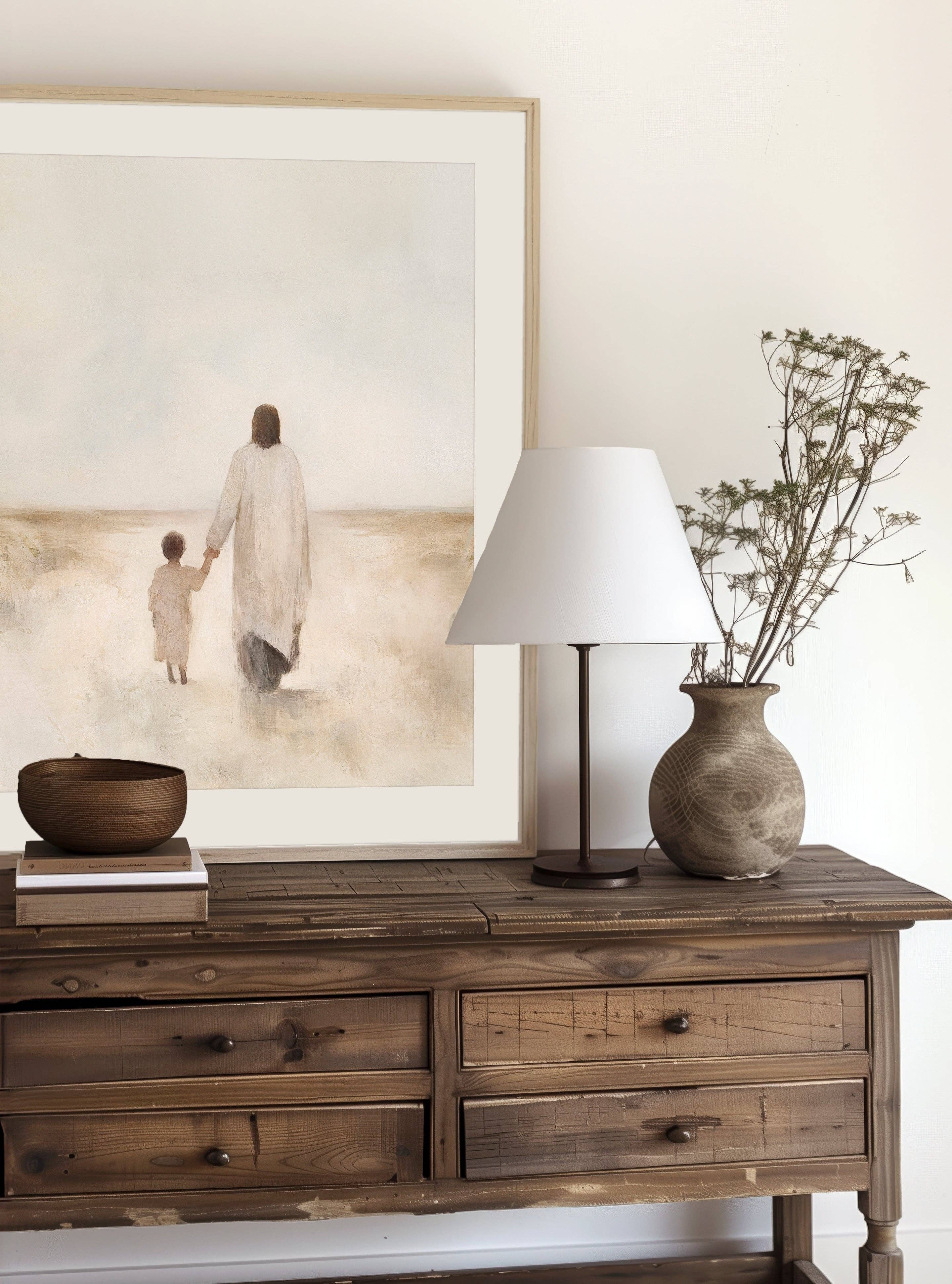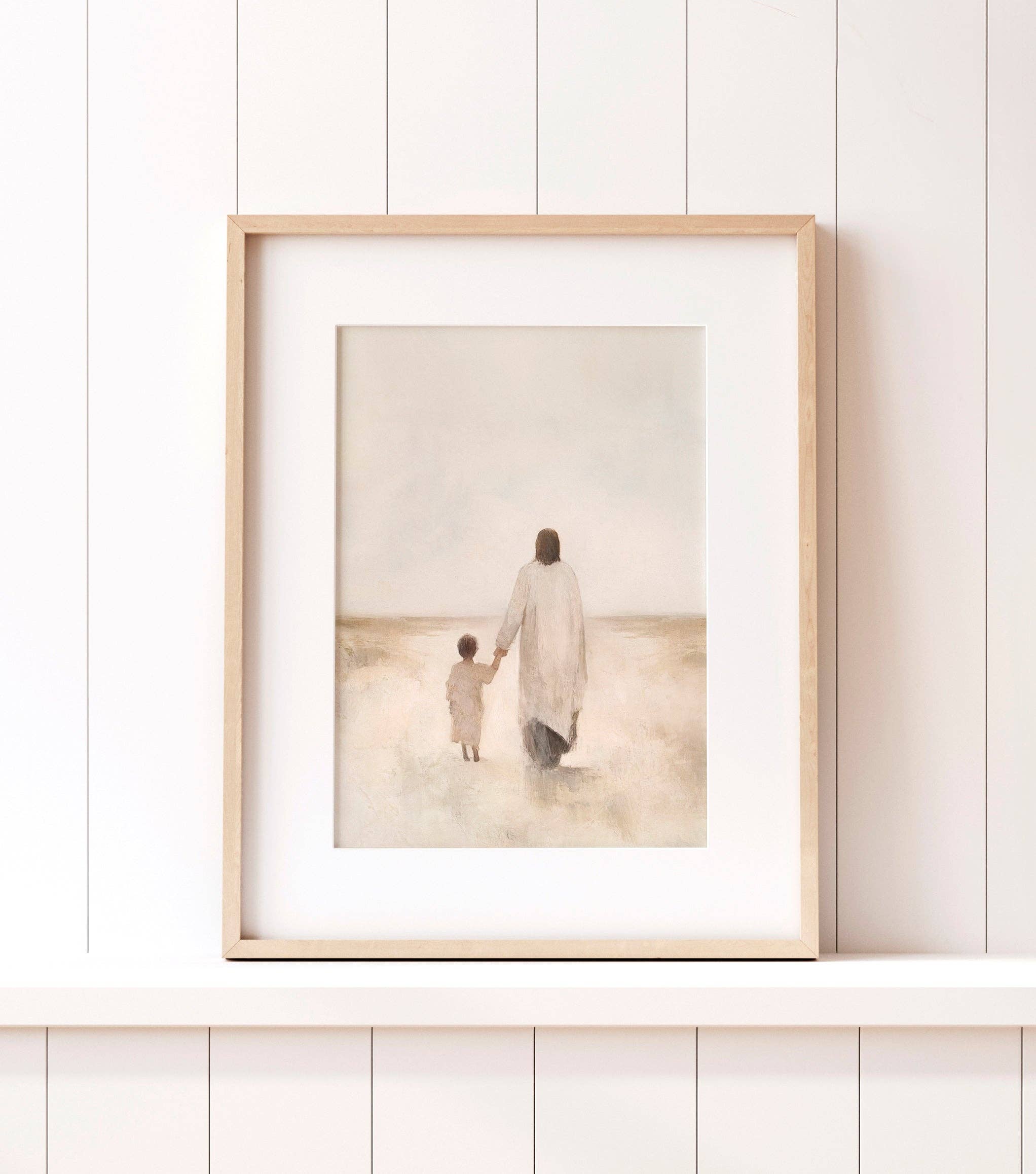 "Let the little children come to me, and do not hinder them, for the kingdom of heaven belongs to such as these." Matthew 19:14 This artwork, "Child with Jesus," is a gentle reminder of the comfort found in knowing that your precious child is in the loving arms of Christ. The image of Jesus walking hand in hand with a child reflects the deep love and care that Jesus has for the little ones, and His promise that the kingdom of heaven belongs to them. For parents who have experienced the unimaginable pain of loss, this piece is intended to bring peace and hope. While the ache of missing your child will always be felt, there is assurance in knowing that they are safe, surrounded by love, and embraced by Jesus Himself.