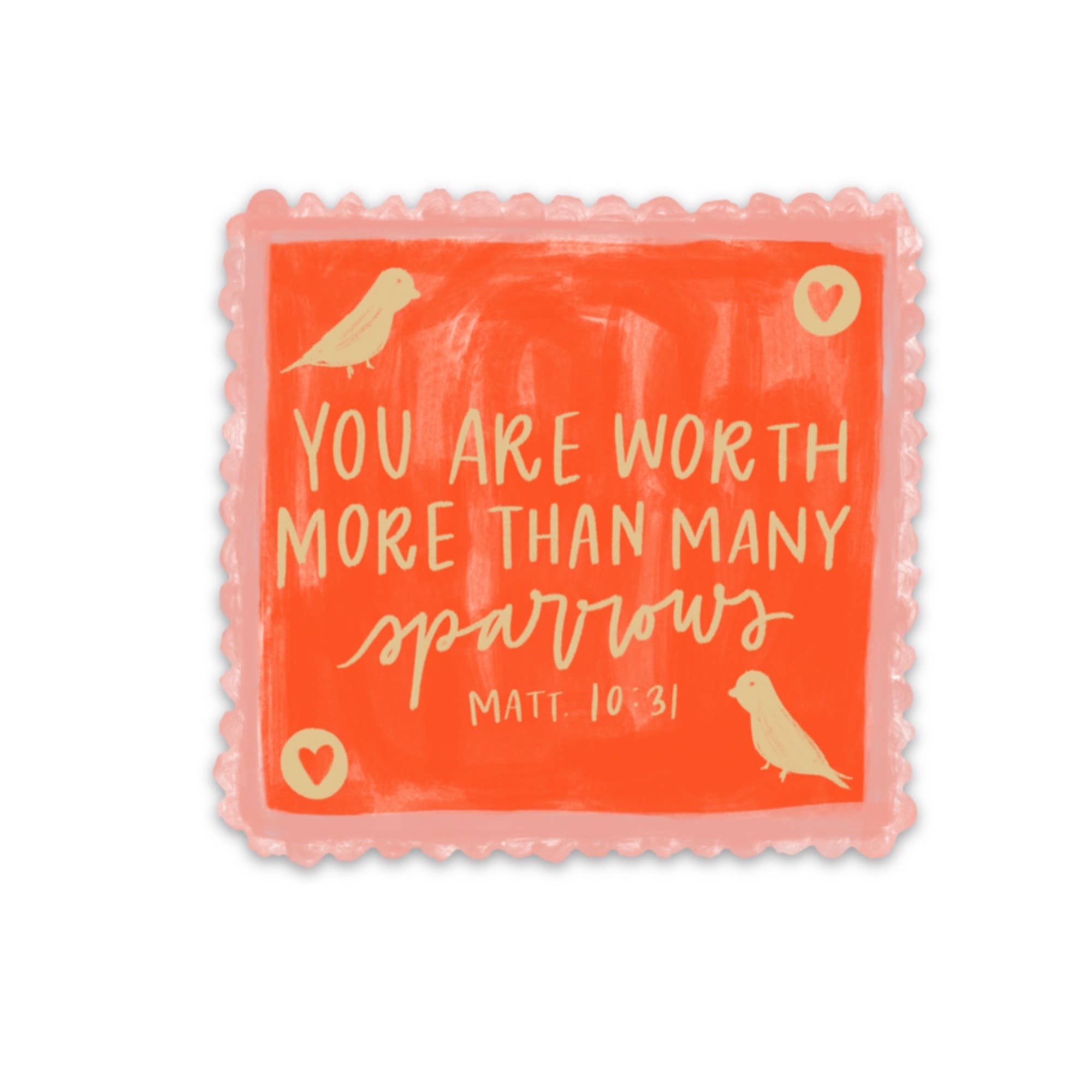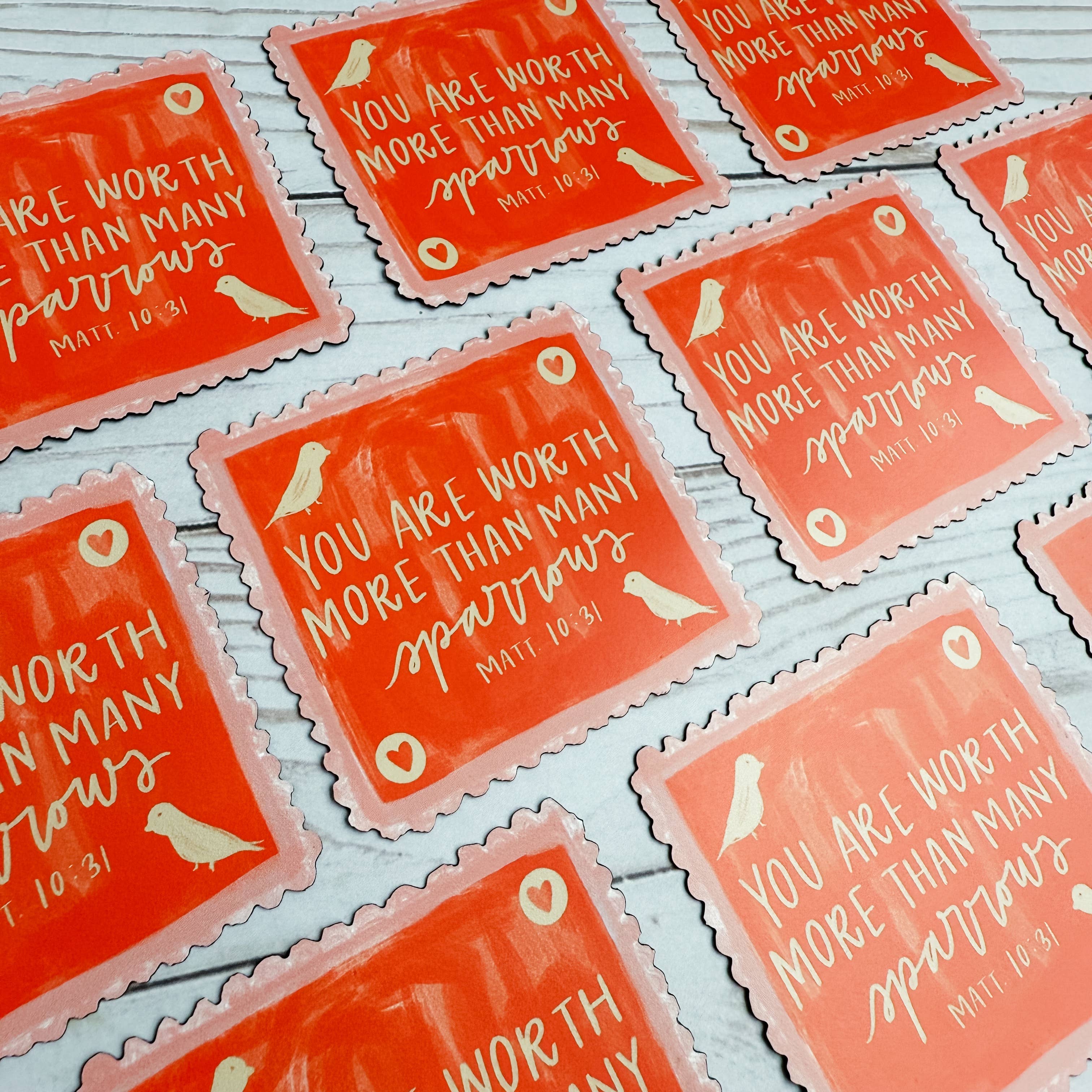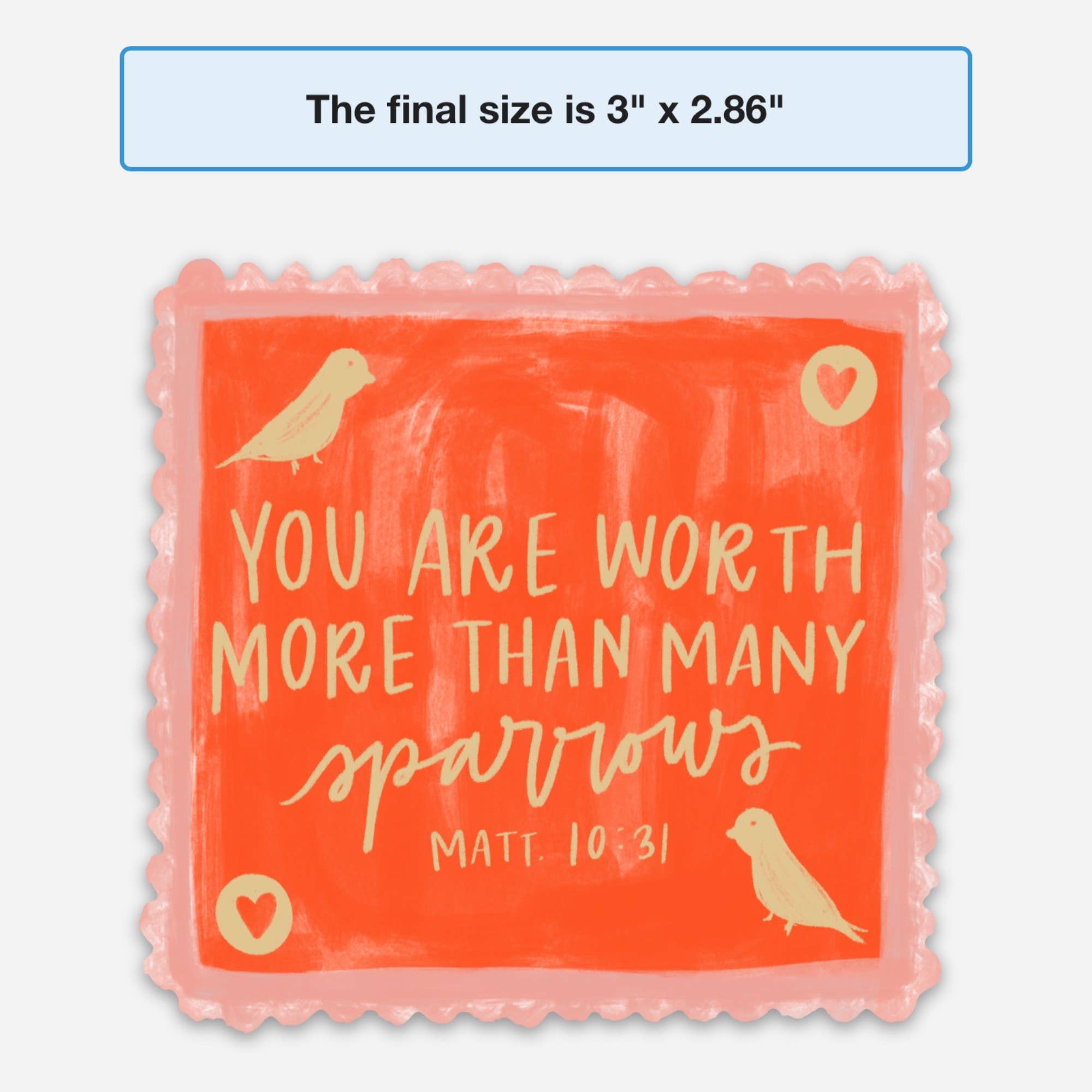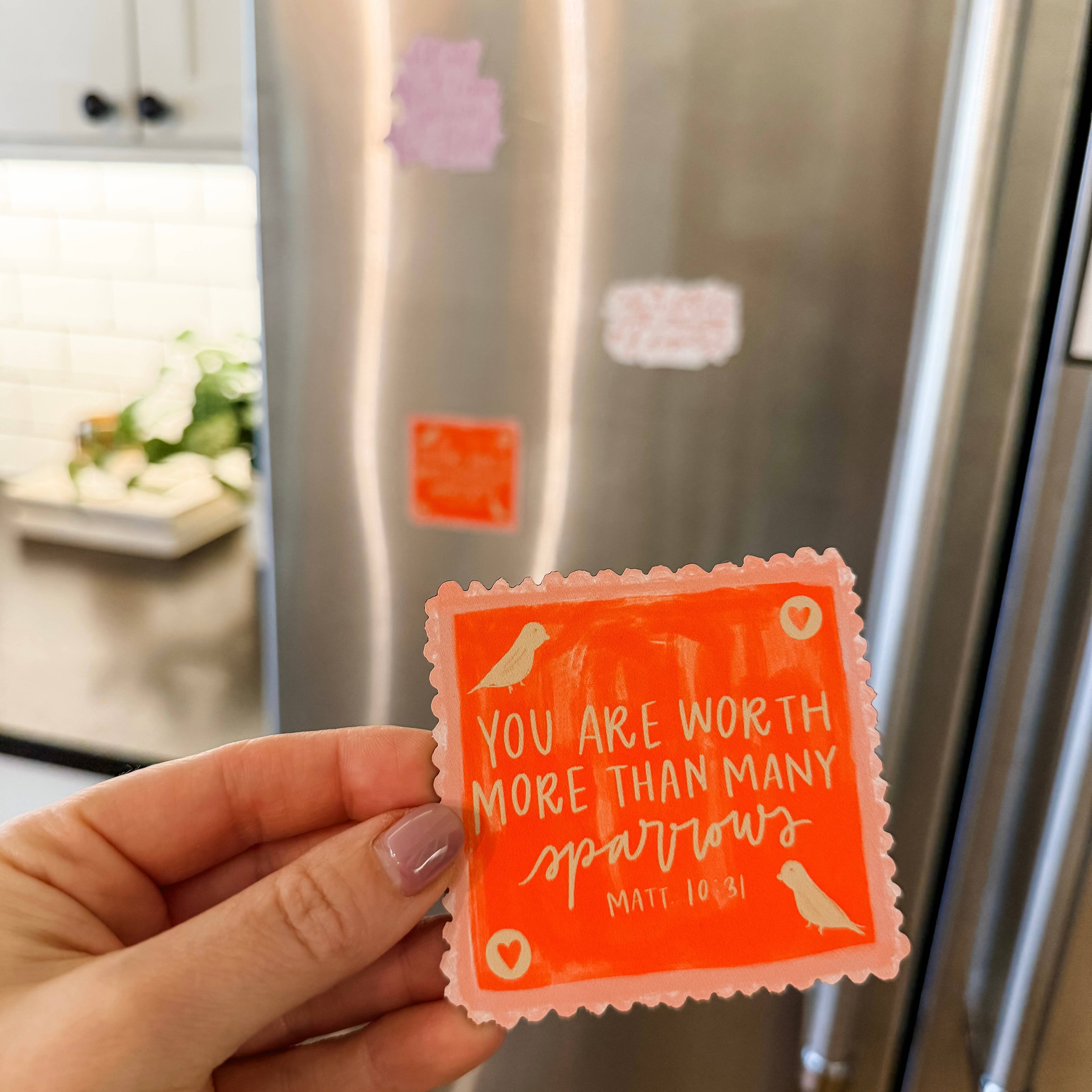 This Bible verse magnet is perfect for your fridge or Stanley cup. With the verse from Matthew 10:31 that says, "you are worth more than many sparrows." This design is meant to look like a postage stamp with not uniform background coloring for details that are authentic and unique.