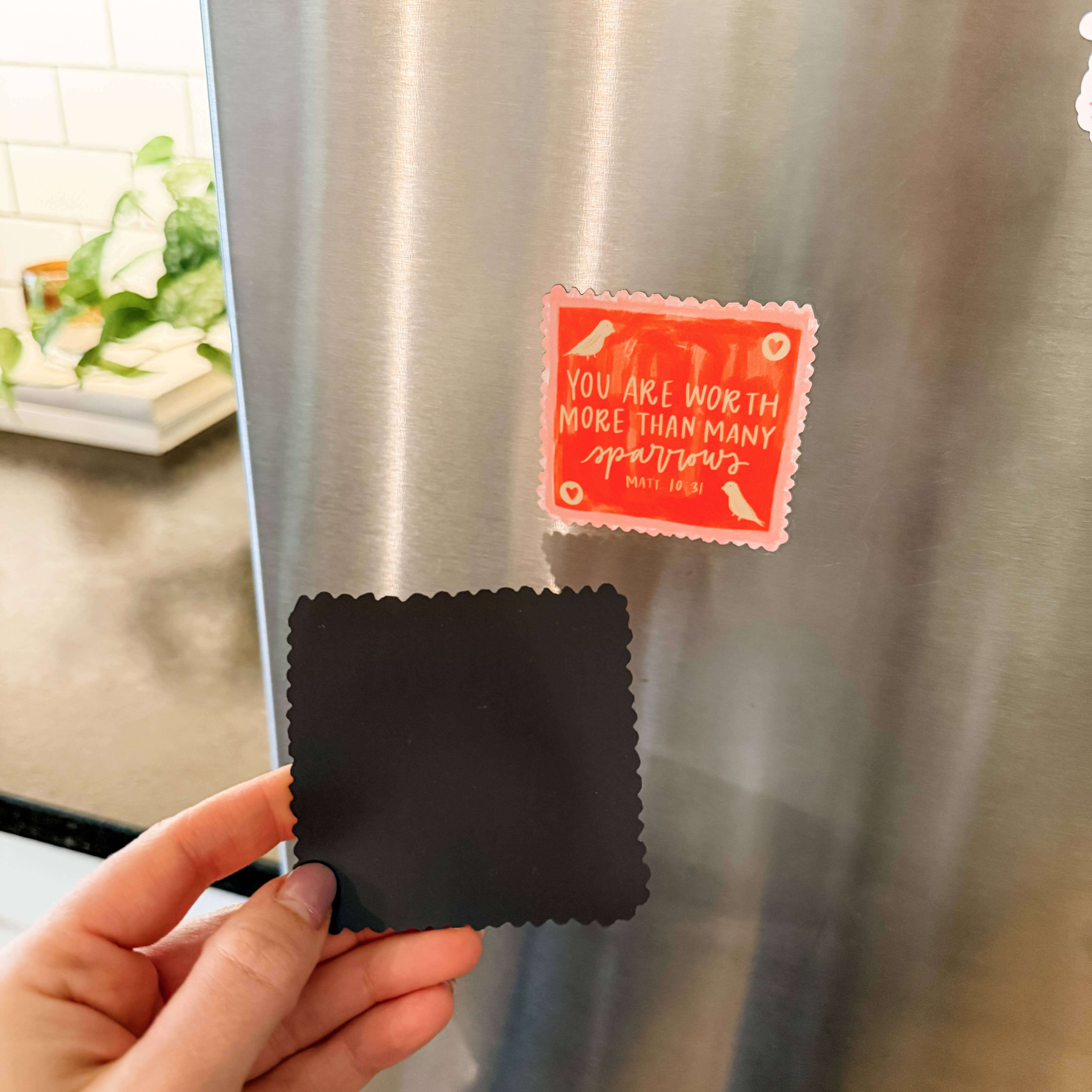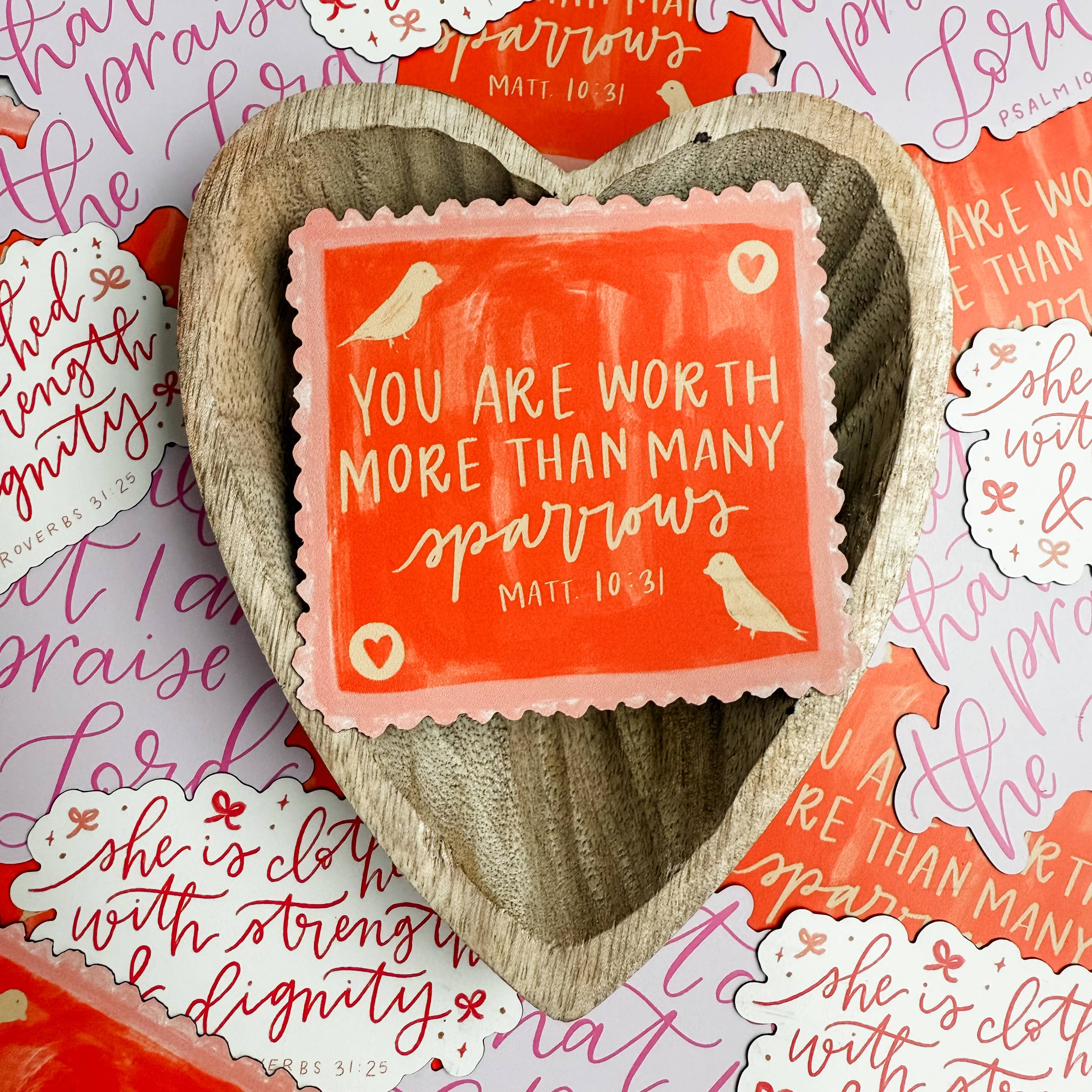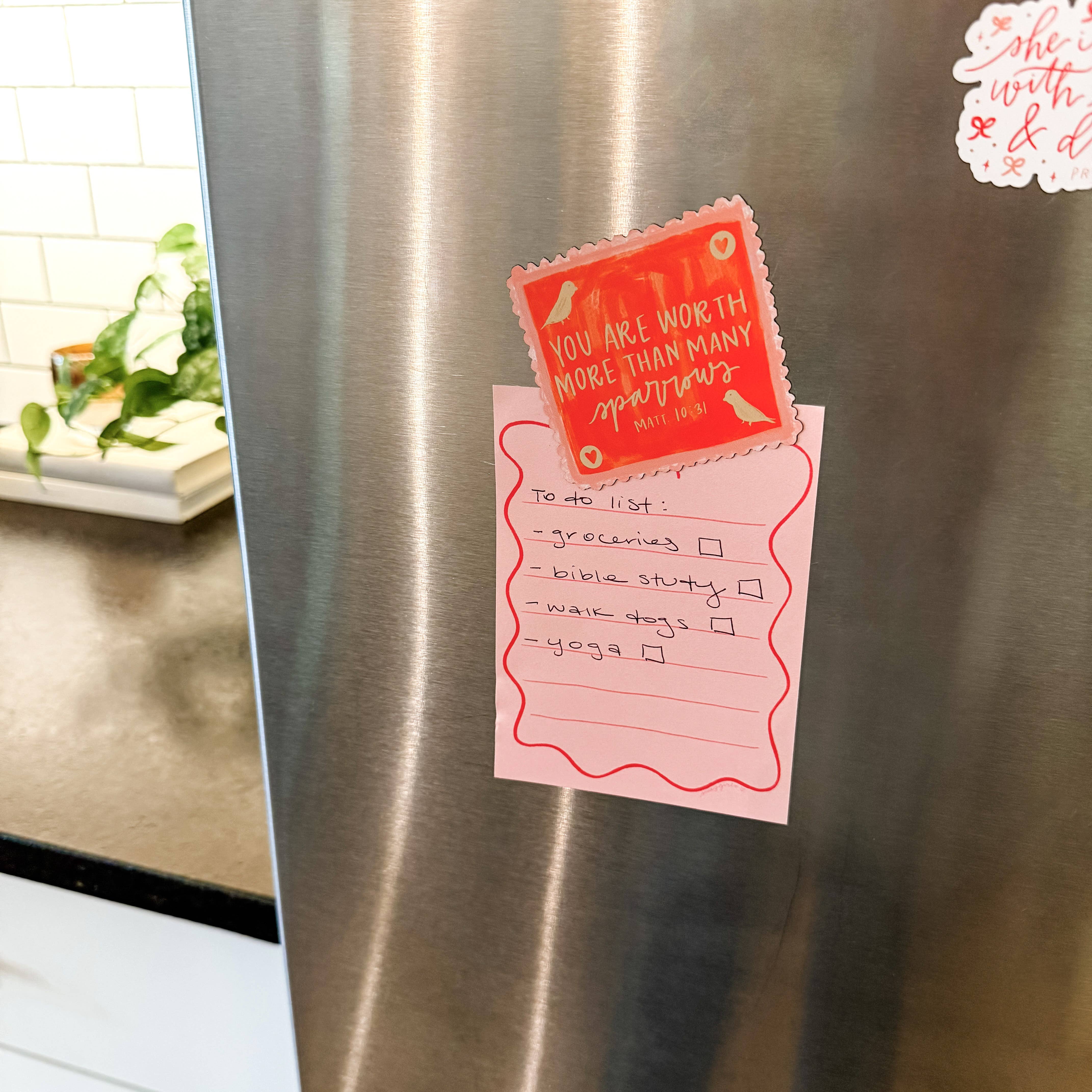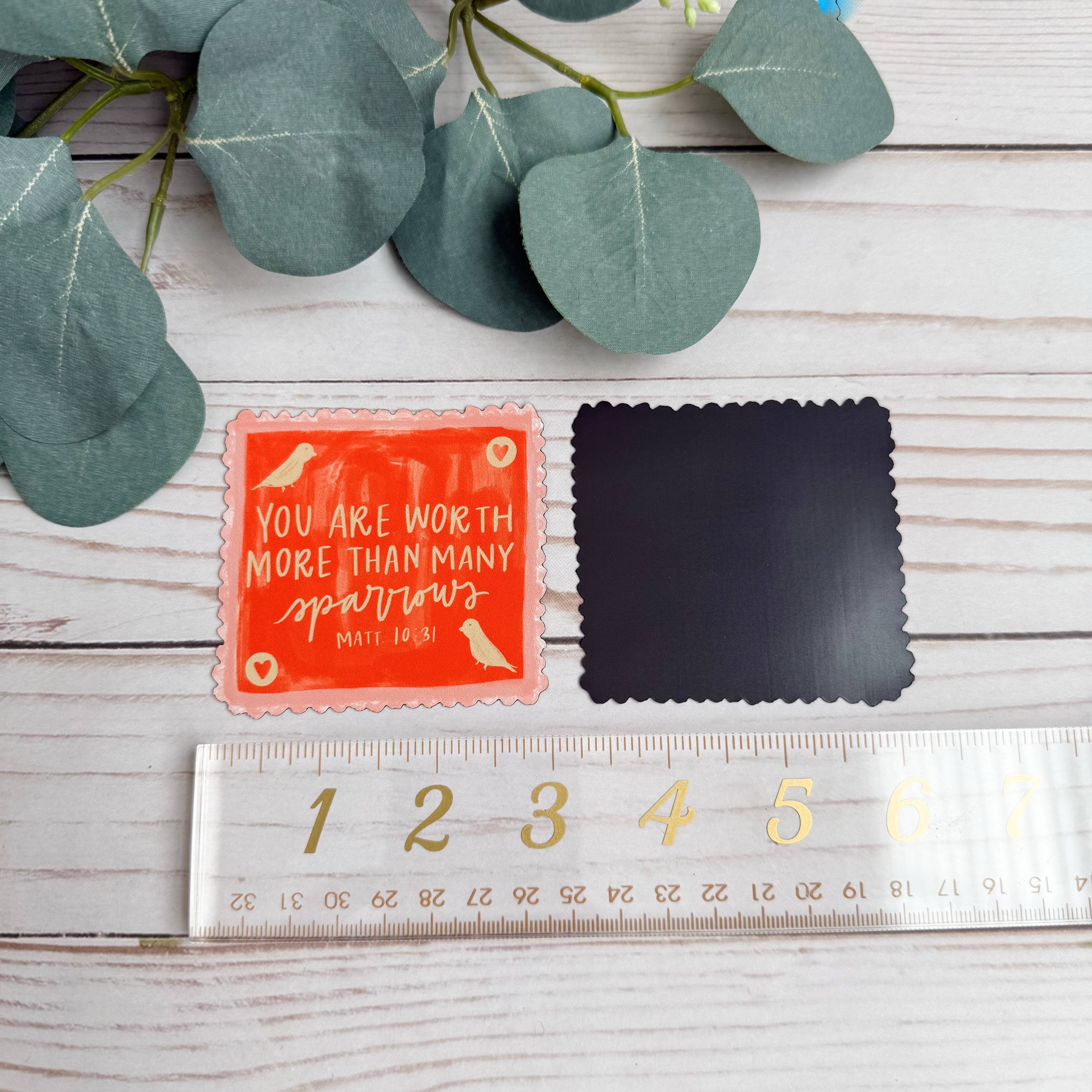 This Bible verse magnet is perfect for your fridge or Stanley cup. With the verse from Matthew 10:31 that says, "you are worth more than many sparrows." This design is meant to look like a postage stamp with not uniform background coloring for details that are authentic and unique.