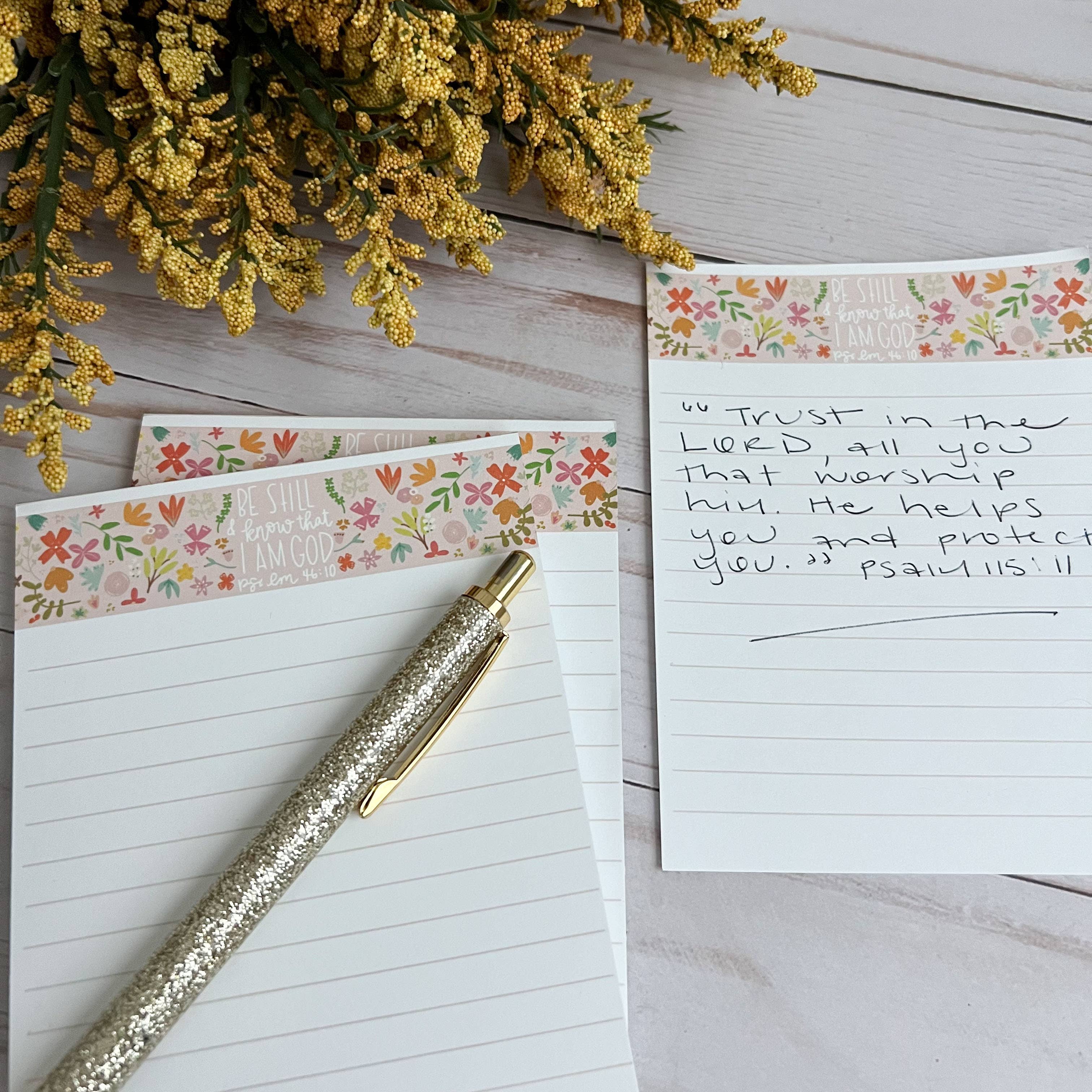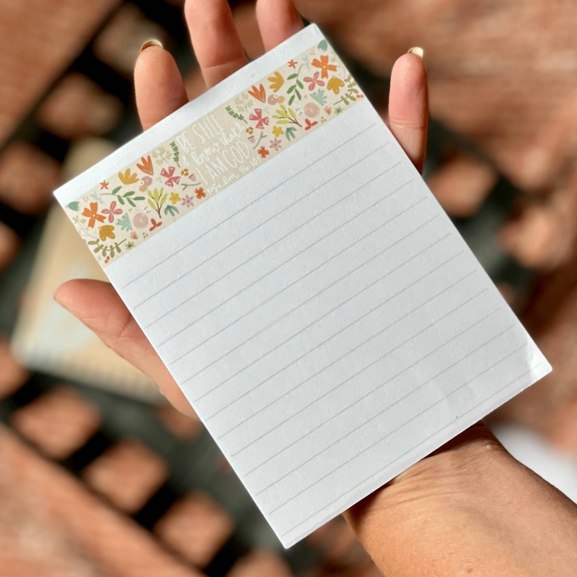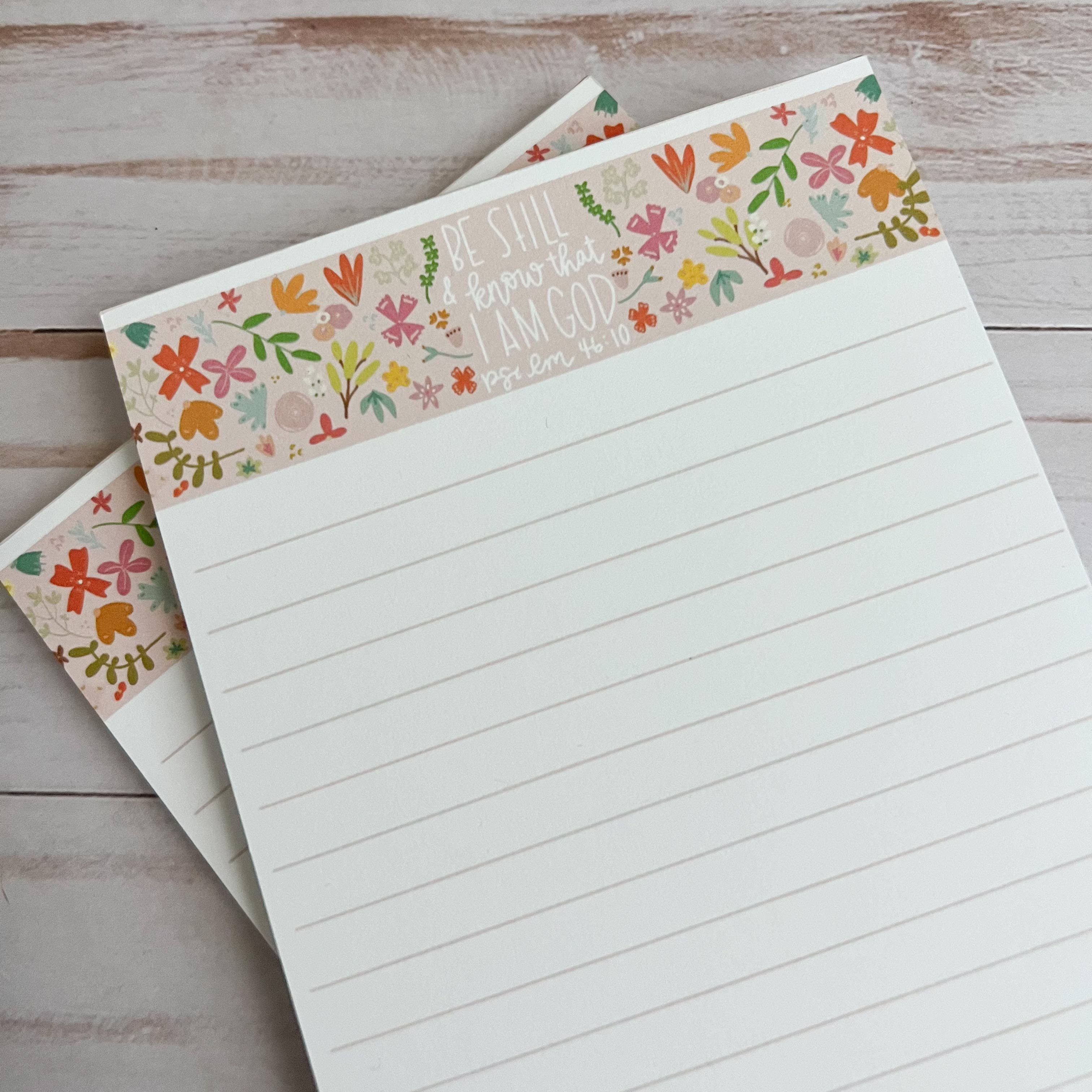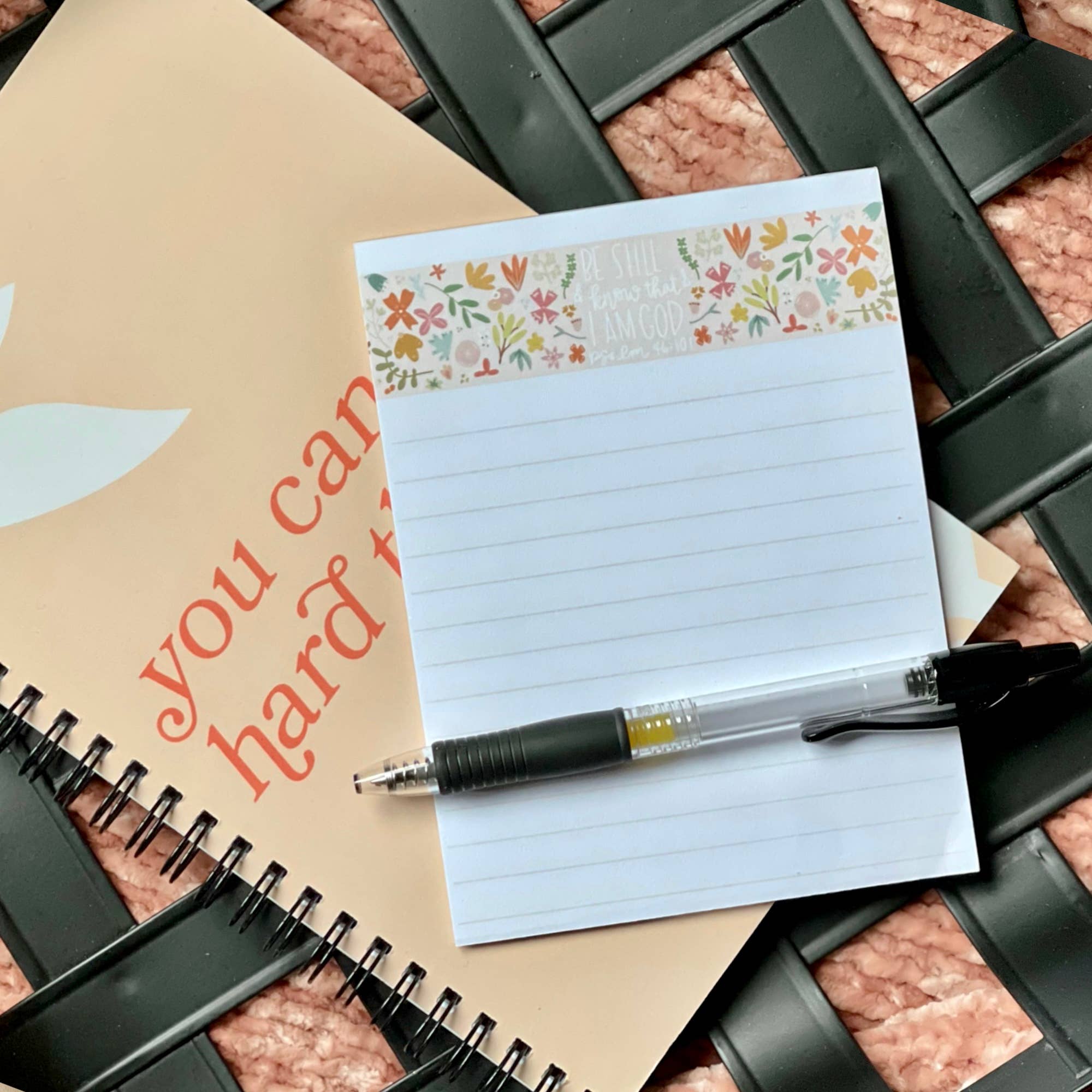 Notepads are all over my house as constant reminders for my to do list, so I decided I needed to at least make them look pretty. And this cutie has a good reminder that I need to see throughout the day - Be still and know that I am God from Psalm 46:101. Size (inches): 4.5 x 5.5 Notepad details - 50 tear off sheets.