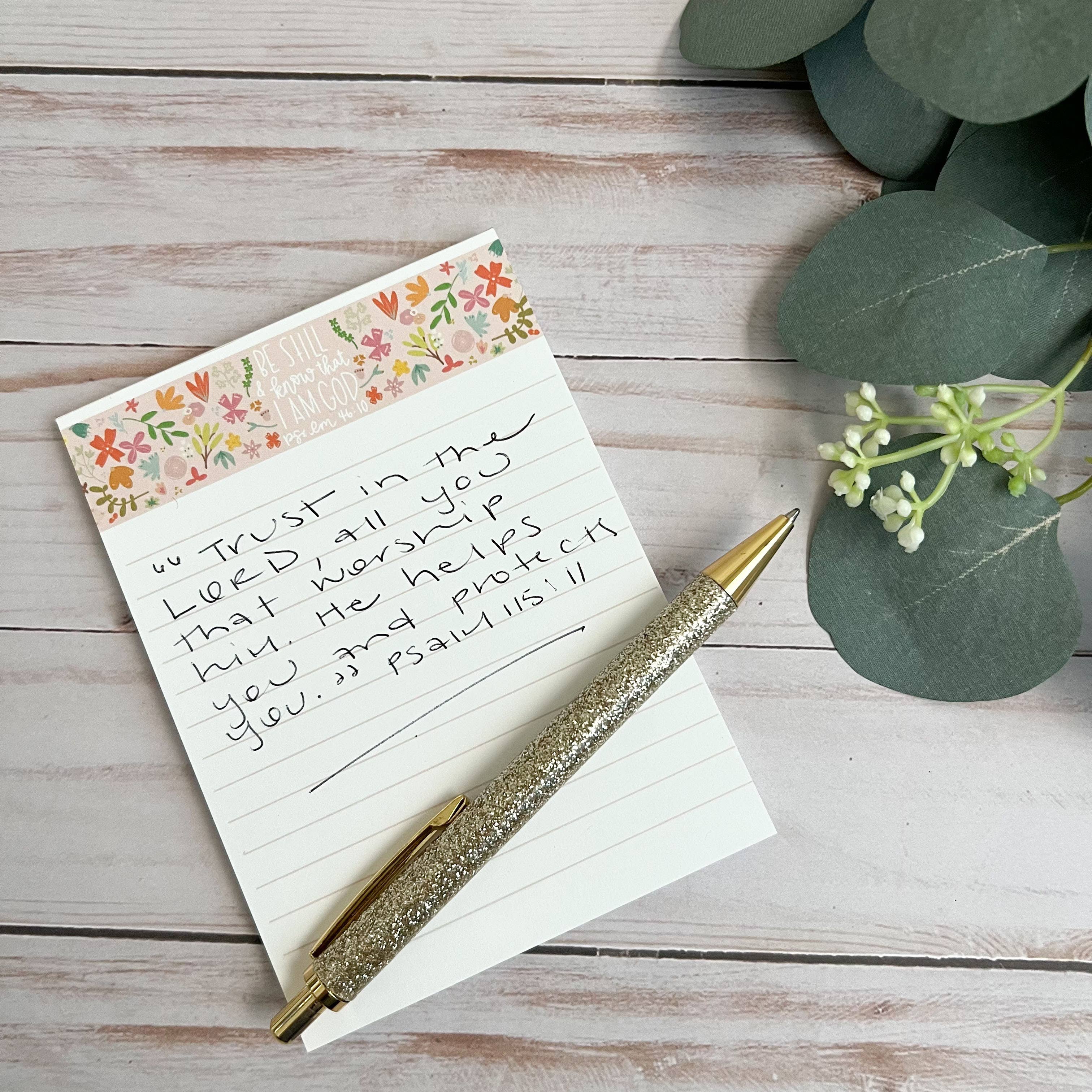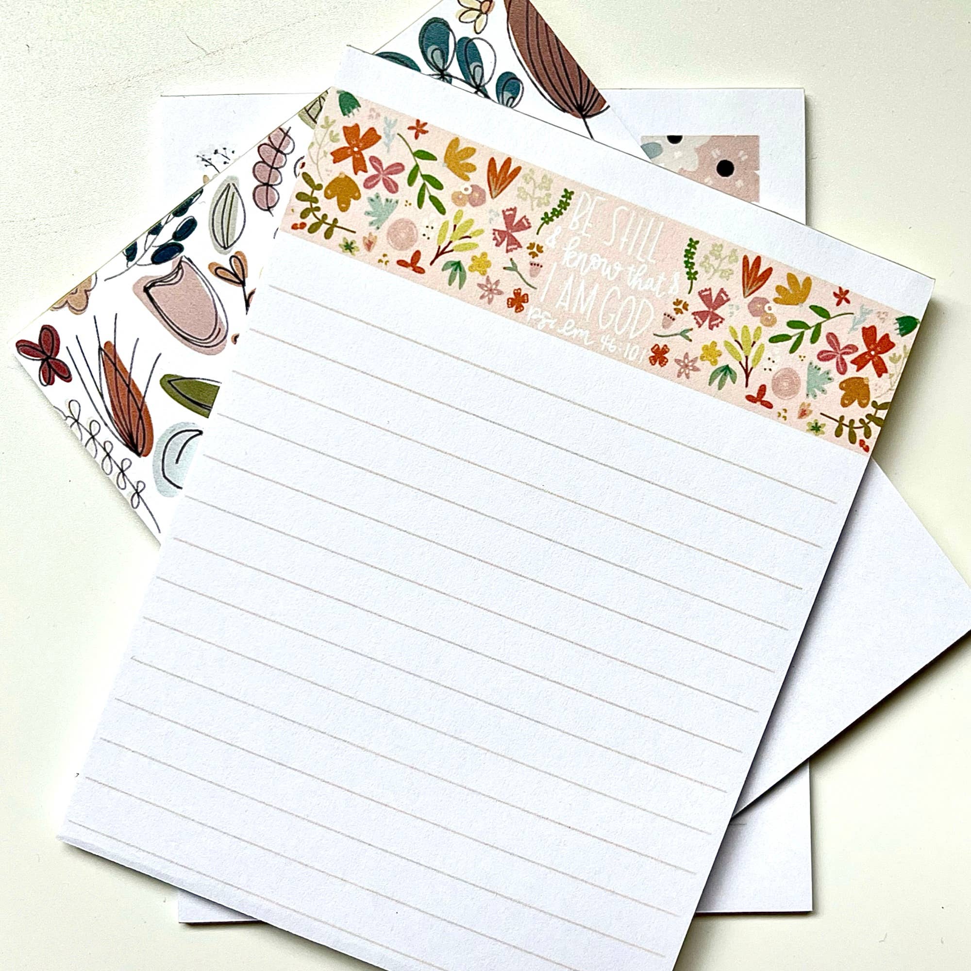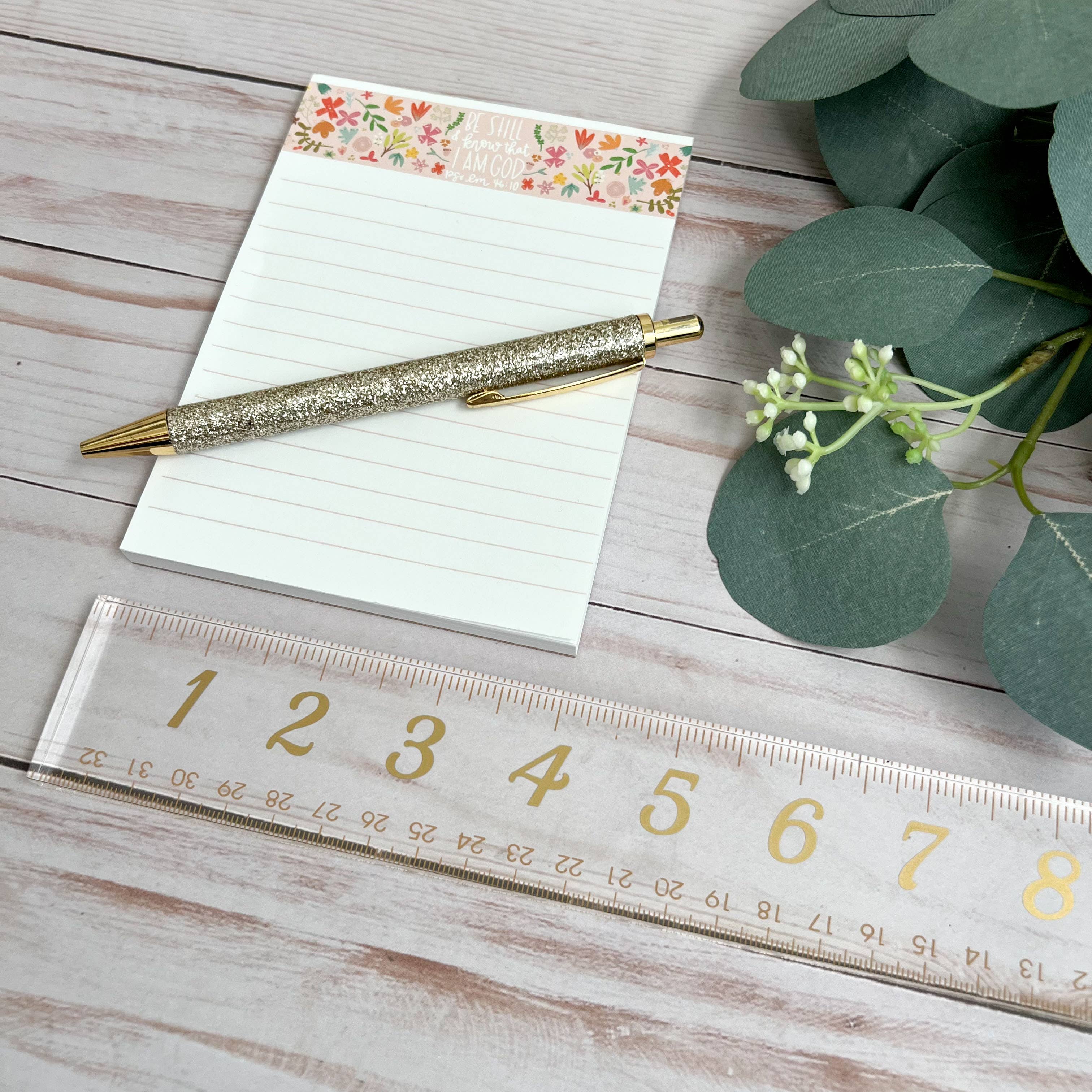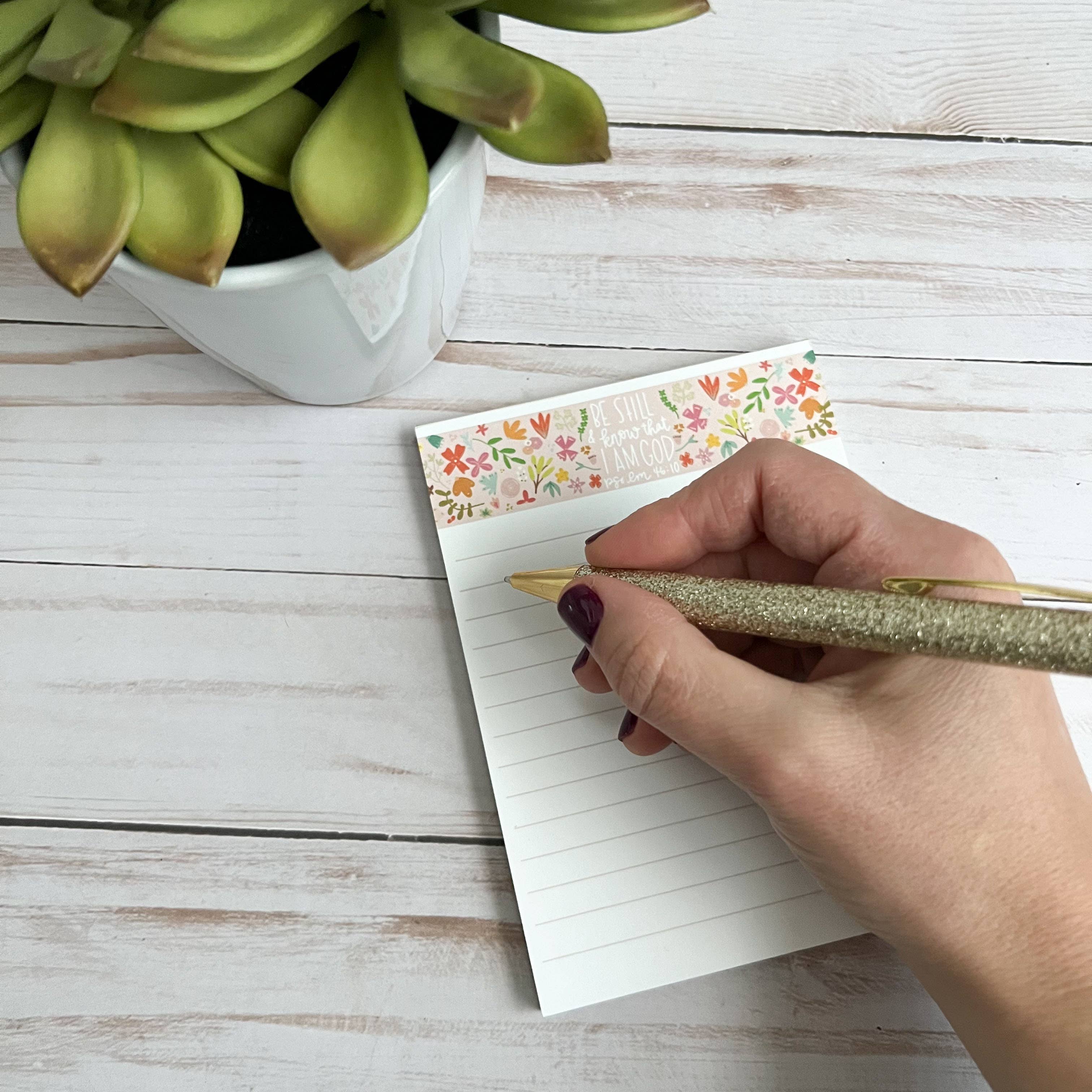 Notepads are all over my house as constant reminders for my to do list, so I decided I needed to at least make them look pretty. And this cutie has a good reminder that I need to see throughout the day - Be still and know that I am God from Psalm 46:101. Size (inches): 4.5 x 5.5 Notepad details - 50 tear off sheets.