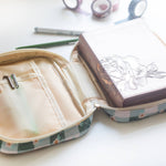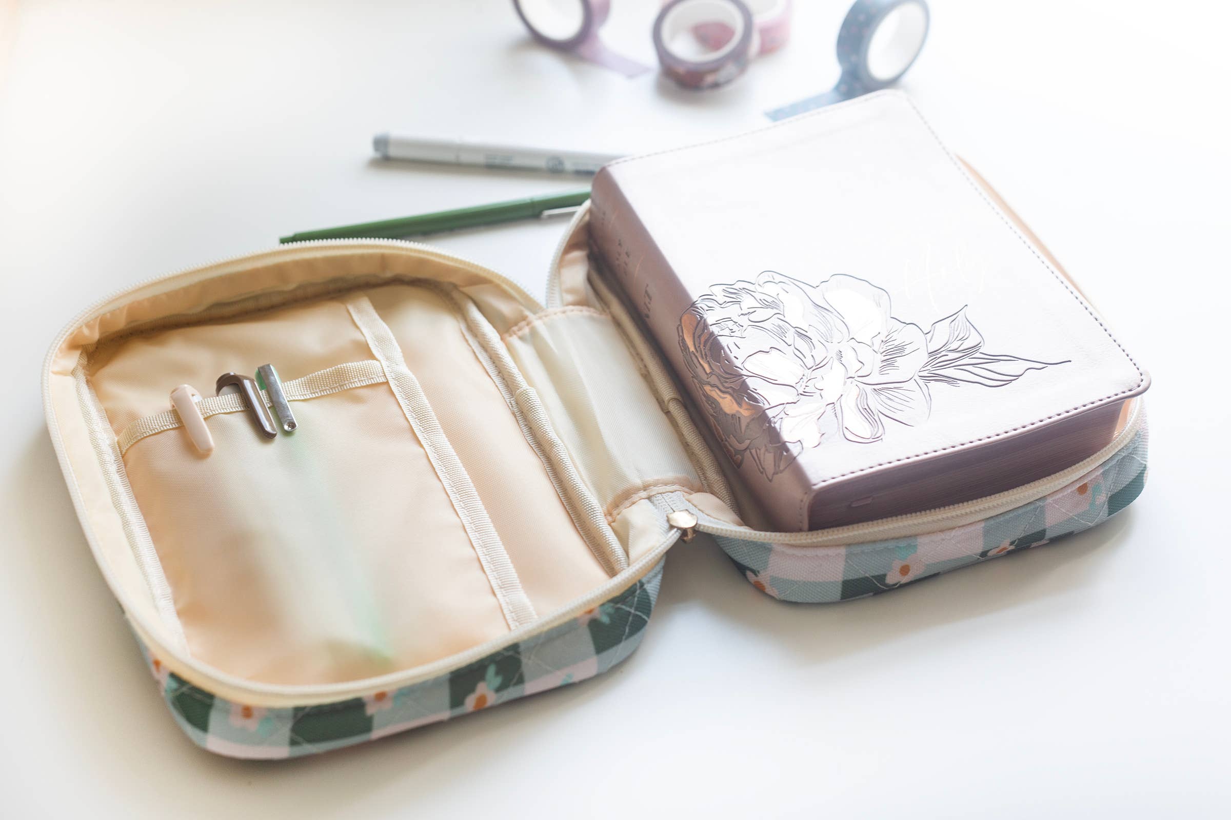 Details: Quilted oilcloth fabric Sized at 5.5" X 8" and 2" depth Inside liner includes a pocket for highlighters/pens Fits these compact Bibles: NLT Giant Print Bible NASB Large Print Compact Bible ESV Value Large Print Compact Bible CSB Large Print Compact Bible ESV Compact Bible