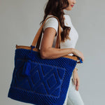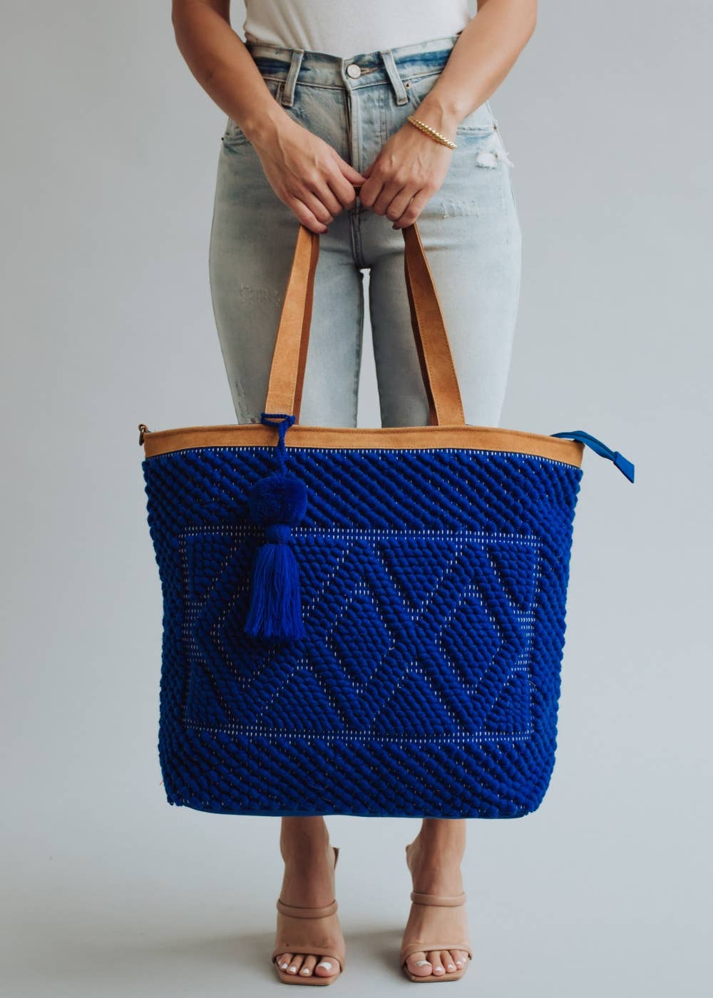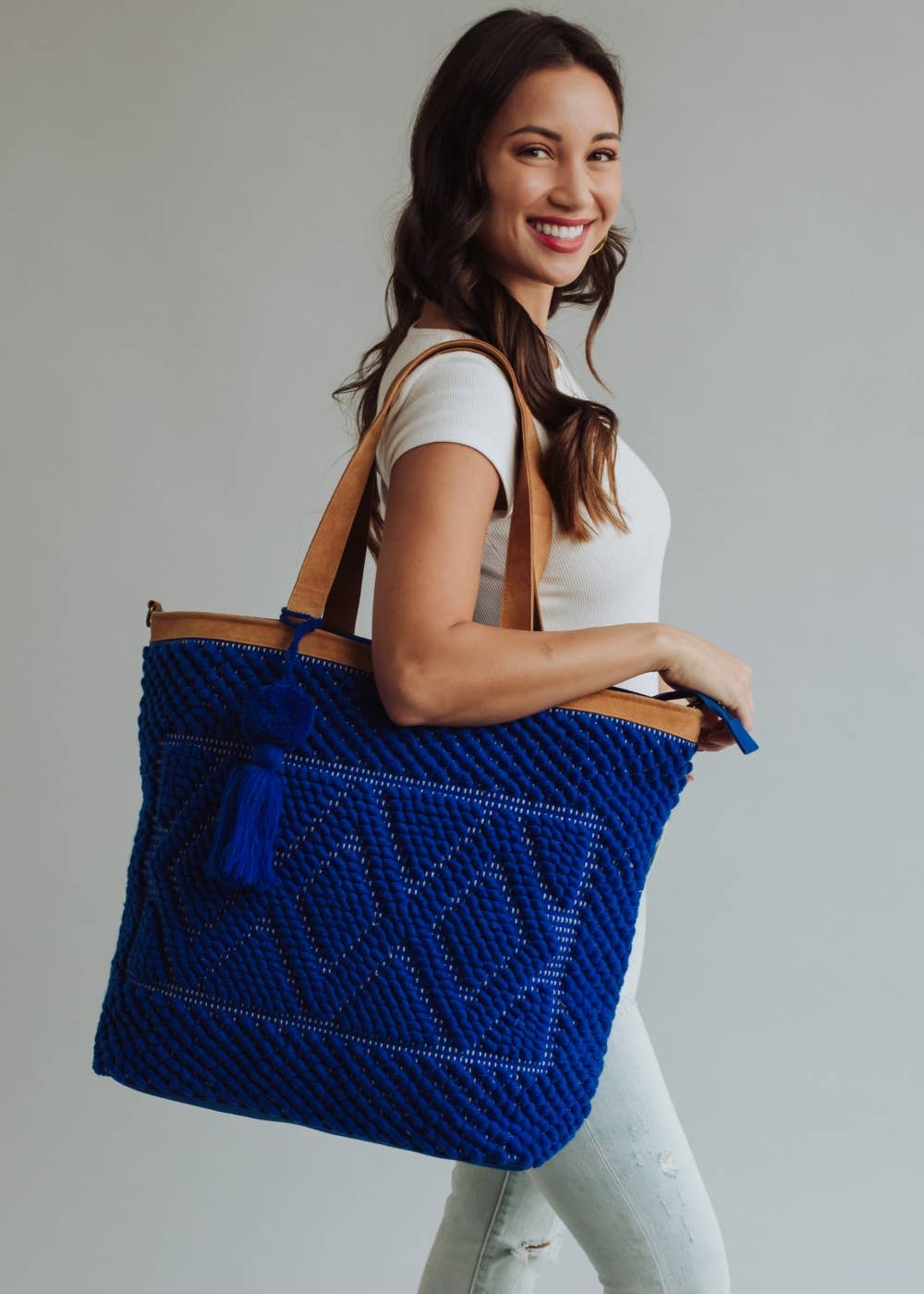 Electric blue textured diamond pattern tote Electric blue pom tassel detail 16" x 18" x 7" 60% Acrylic/35% Cotton/5% Leather Min. Qty. 2
