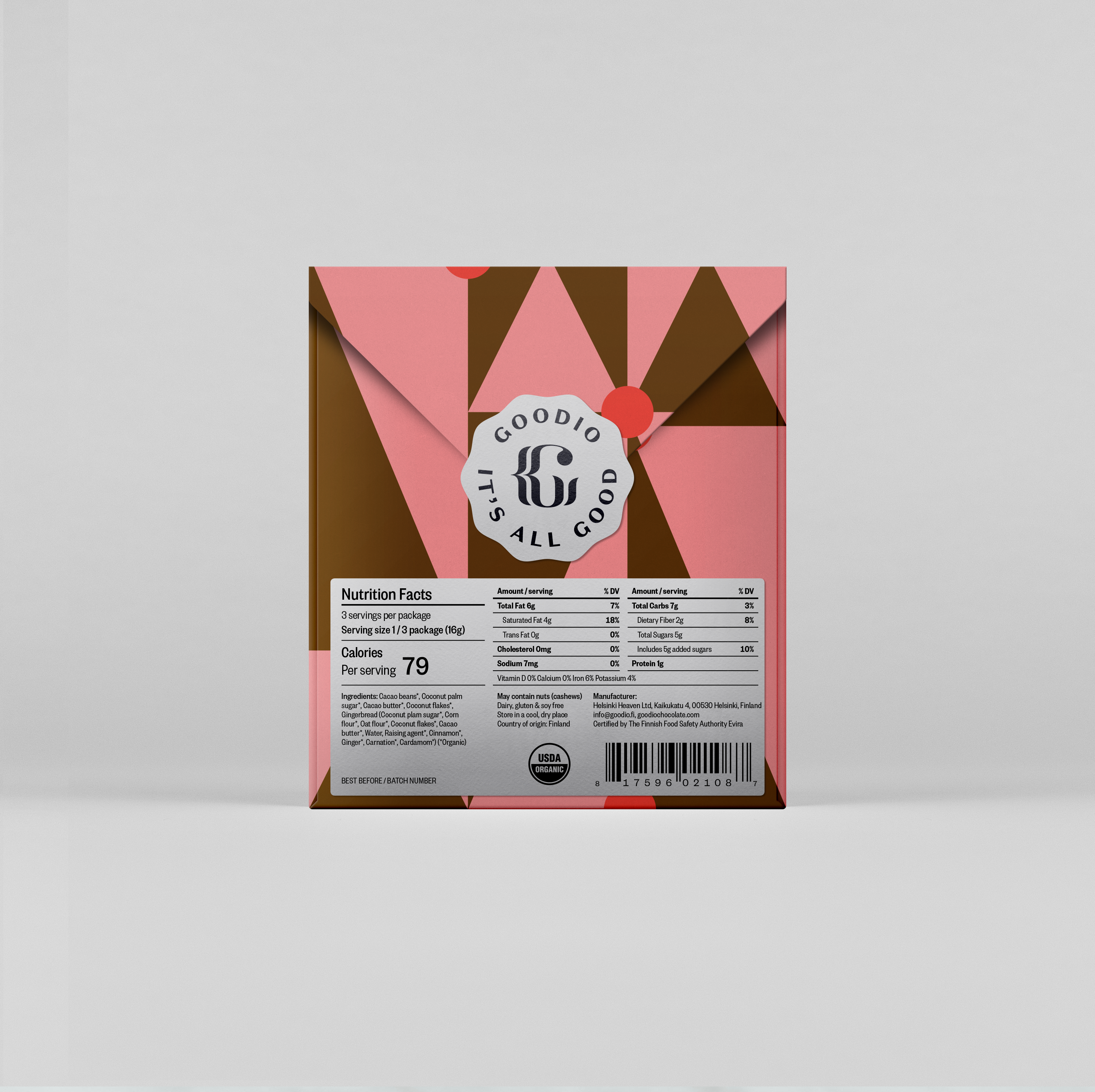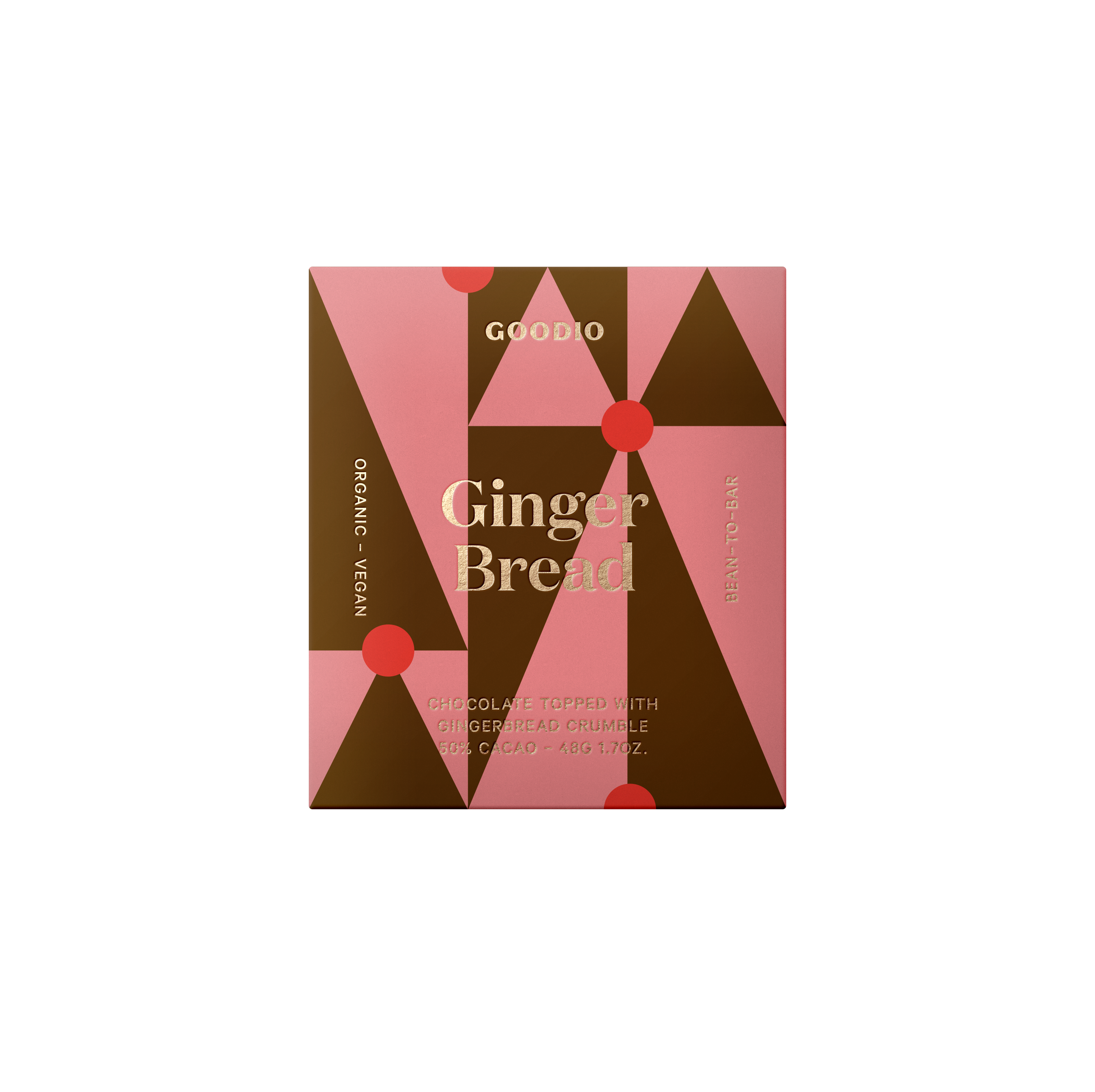 NGREDIENTS: Cacao beans*, Coconut palm sugar*, Cacao butter*, Coconut flakes*, Gingerbread* (Coconut palm sugar*, Corn flour*, Oat flour*, Coconut flakes*, Cacao butter*, Water, Raising agent*, Cinnamon*, Ginger*, Clove*. May contain traces of nuts (cashew). Chocolate, minimum 49% cacao content. Store in a cool, dry place. Vegan, dairy-free, organic, gluten-free and soy-free. Net weight: 48g / 1.7oz