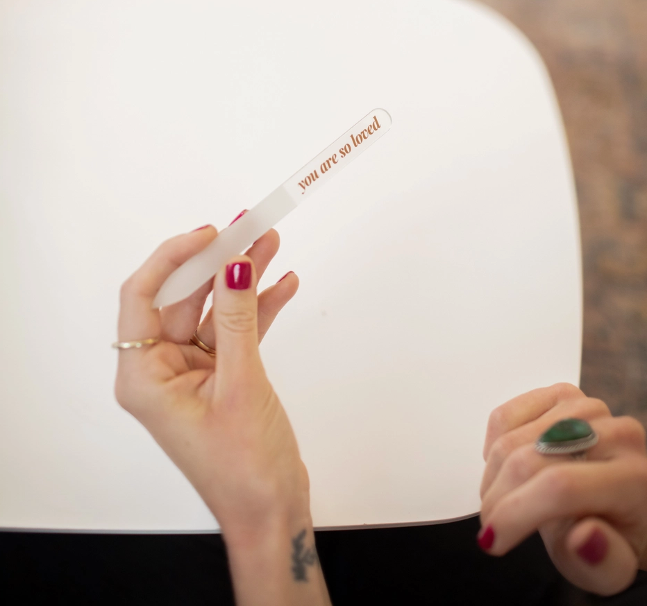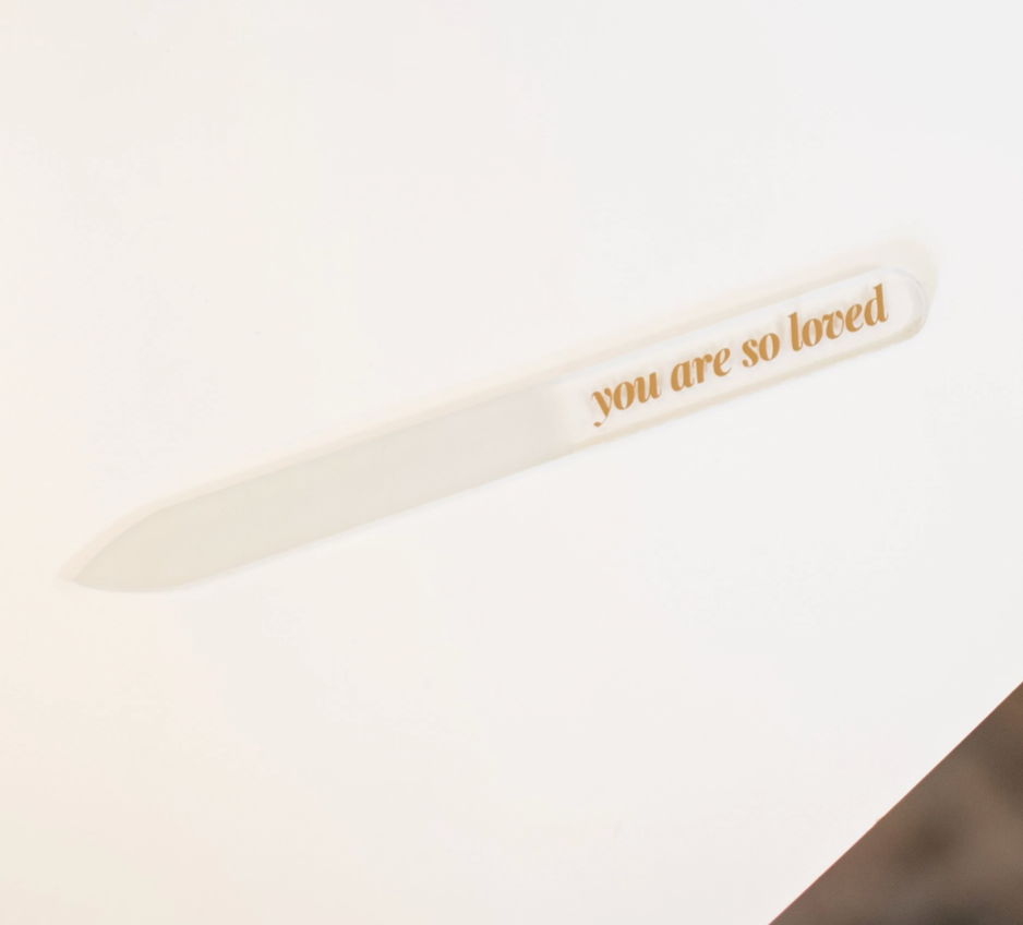 It's not just a tool, it's a perfect gift. "you are so loved" is imprinted on the handle, serving as an encouraging reminder. Crafted with precision and care, this contour-shaped glass nail file is designed for effortless use, delivering salon-quality results.