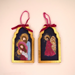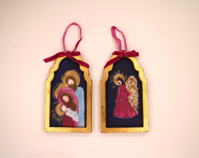 5x8" Glittered gold framed ornament, Holy Family and Angel.