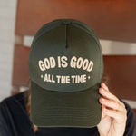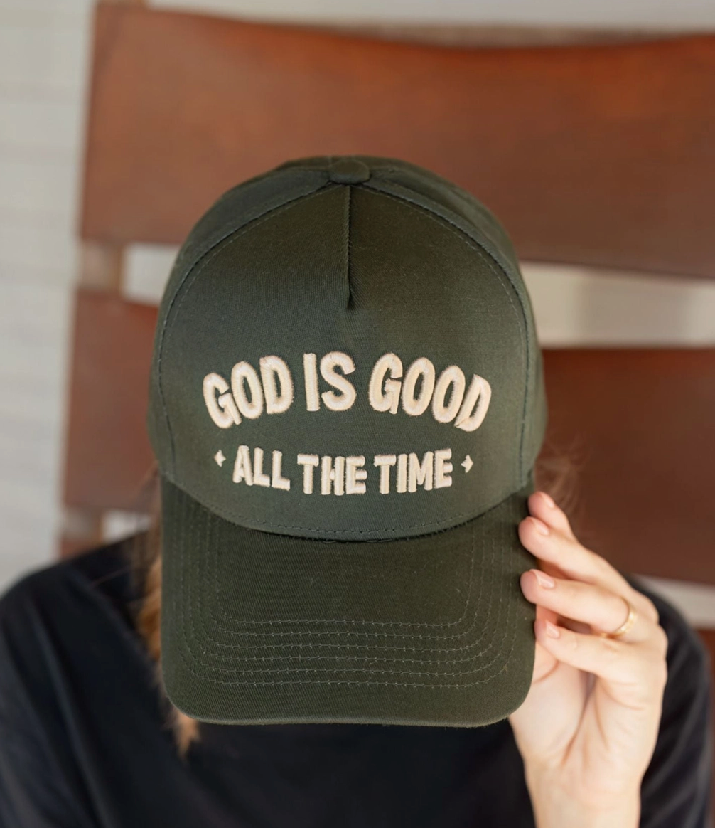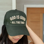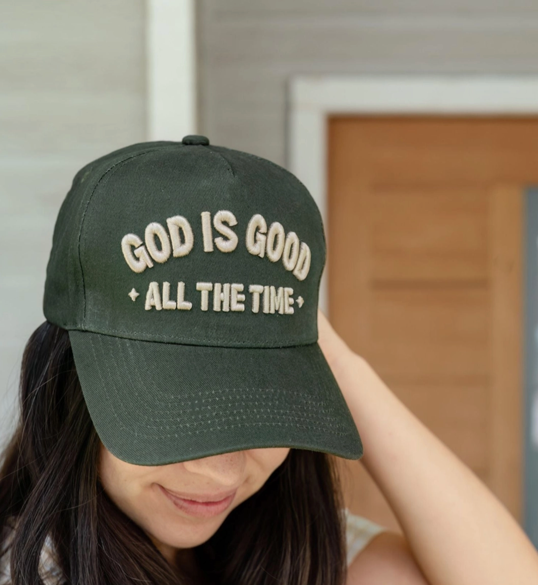 "God is good all the time " Embroidered Hat Product Details: * Material: 100% Cotton * Color: Dark Green with cream wording * Adjustment: Adjustable snapback * Fit: Unisex Our hat features the declaration "God is good all the time" beautifully embroidered, serving as a daily declaration of the goodness of God. Made from 100% cotton, it provides a soft and comfortable fit, perfect for everyday wear.