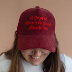 "A Joyful heart is good medicine" Embroidered Hat Product Details: * Material: 100% Cotton * Adjustment: Adjustable snapback * Fit: Unisex