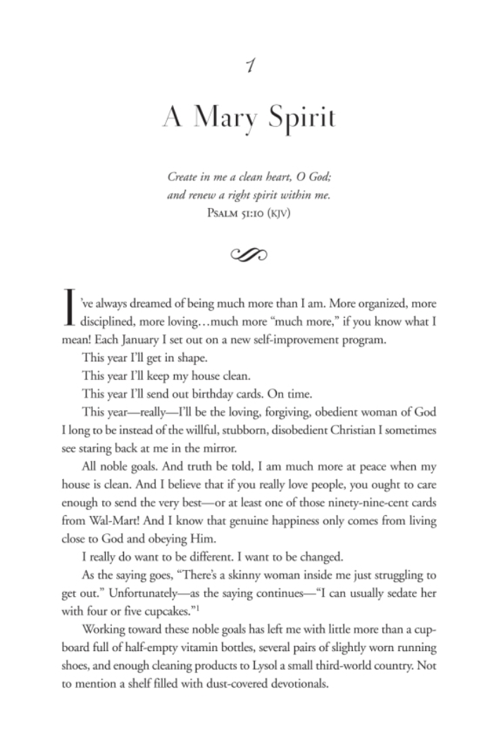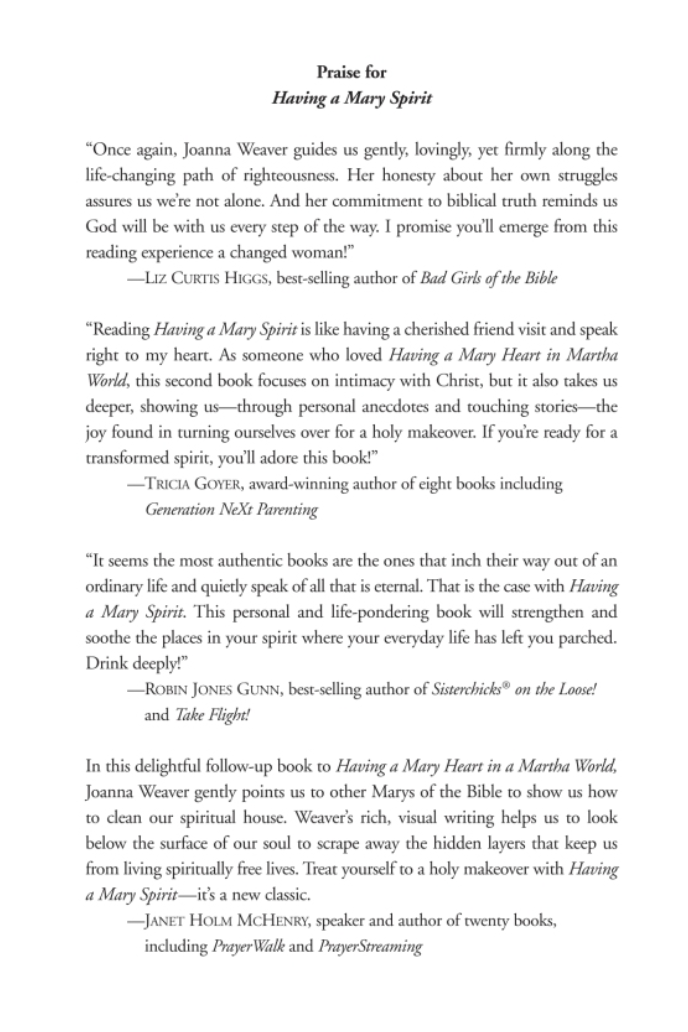 In Having a Mary Spirit, Joanna Weaver directs your gaze past your own shortcomings to the God who stands ready, willing, and able to make a new woman out of you. She equips you with biblical insights and practical tools to partner with Christ, inviting Him into the hidden places of your soul and giving Him full permission to redeem and renovate. Drawing on the stories of the biblical Marys (Mary, mother of Jesus; Mary, sister of Martha; and Mary Magdalene) and others whose experience with God transformed their lives, Joanna points you toward lasting personal transformation—soul-deep change that results in a complete makeover—from the inside out.