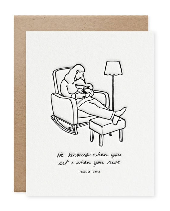 This letterpress printed card combines the truth of God’s Word in Psalm 139:2 with a scene common to mothers in the throw of babies that wake and feed throughout the night.