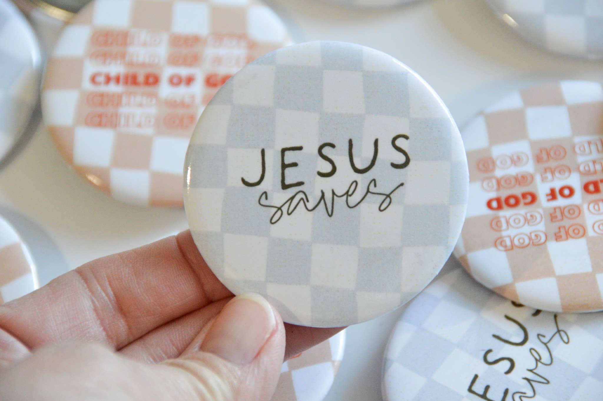 Durable & weatherproof with a smooth, weather-resistant laminate and a durable, tin plate steel back Design: Checkers with red Jesus Saves print Attachment: Safety pin back closure made from durable steel This button makes a wonderful gift for Sunday school students, church groups, or anyone looking for a faith-based accessory. Add a personal touch to your everyday style while sharing a message of hope and love. All buttons come on the "Flair" card as shown in the photos.