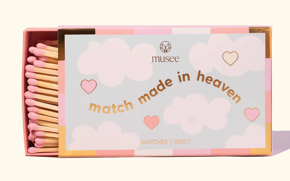 Add a spark of joy with our Valentine's Day themed matches! These oversized matches come in a colorful, cheerful box that’ll brighten up any space. The perfect addition for lighting Musee's luxurious soy candles! Crafted with extra-long sticks for effortless candle lighting.