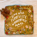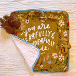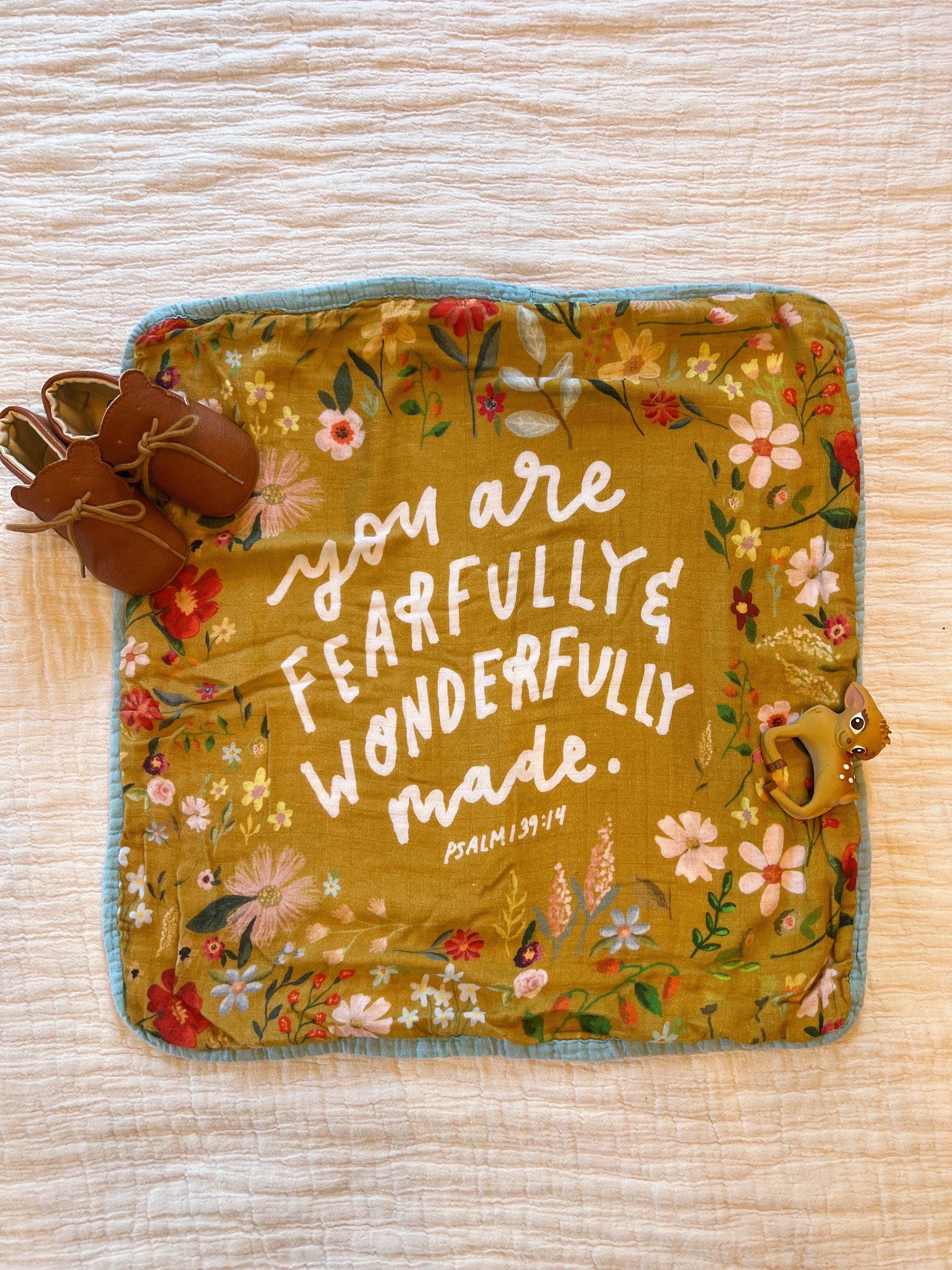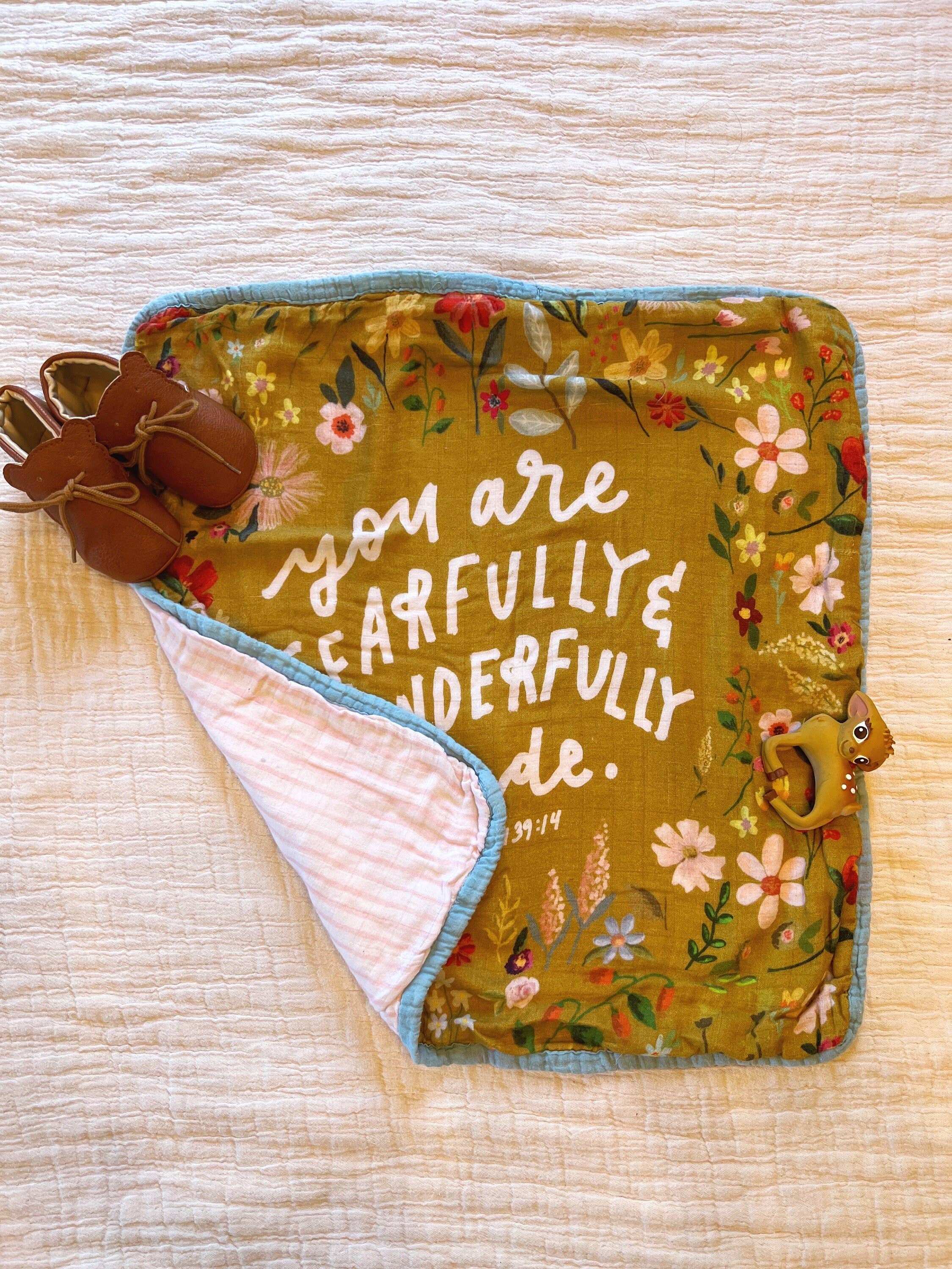 Mini* Fearfully And Wonderfully Made Bamboo/Cotton Mini Blanket These are a mini size 8-layer blanket perfect for car seats, strollers, as a lovey blanket, or to lay baby down when out and about. They are the same 30% cotton 70% bamboo made with 8 layers. These are designed with both parents and babies in mind. The mini quilt blankets measure 22”x22”. This design “You are fearfully and wonderfully made” with florals and pink stripes is inspired by the awesome beauty and design of every human being. the florals reflect that and the soft pink stripes are a nice contrast from the florals. Machine Wash in Cold water. These blankets are hand drawn.