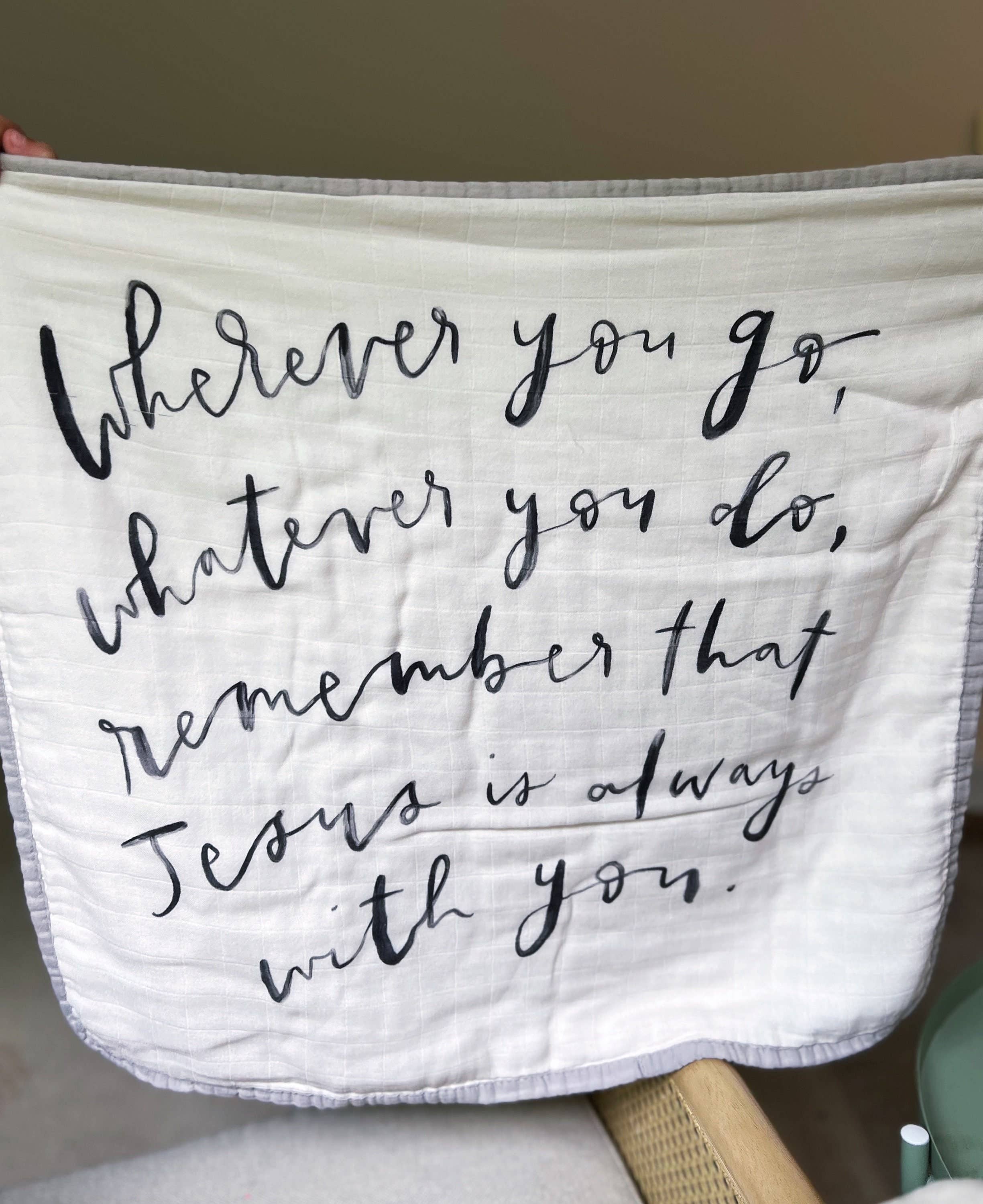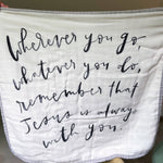 Mini* Trucks/Wherever You Go 8-Layer Bamboo Cotton Muslin Mini Blanket These are a mini size 8-layer blanket perfect for car seats, strollers, as a lovey blanket, or to lay baby down when out and about. They are the same 30% cotton 70% bamboo made with 8 layers. These are designed with both parents and babies in mind. The mini quilt blankets measure 22”x22”. This design was inspired by my now 5 year old when he was a toddler and was fascinated by all things that go! The automobiles and the hand lettered words “Wherever you go whatever you do, remember that Jesus is always with you,” remind each little one that Jesus is with them always wherever they go. Machine Wash in Cold water. These blankets are hand drawn.