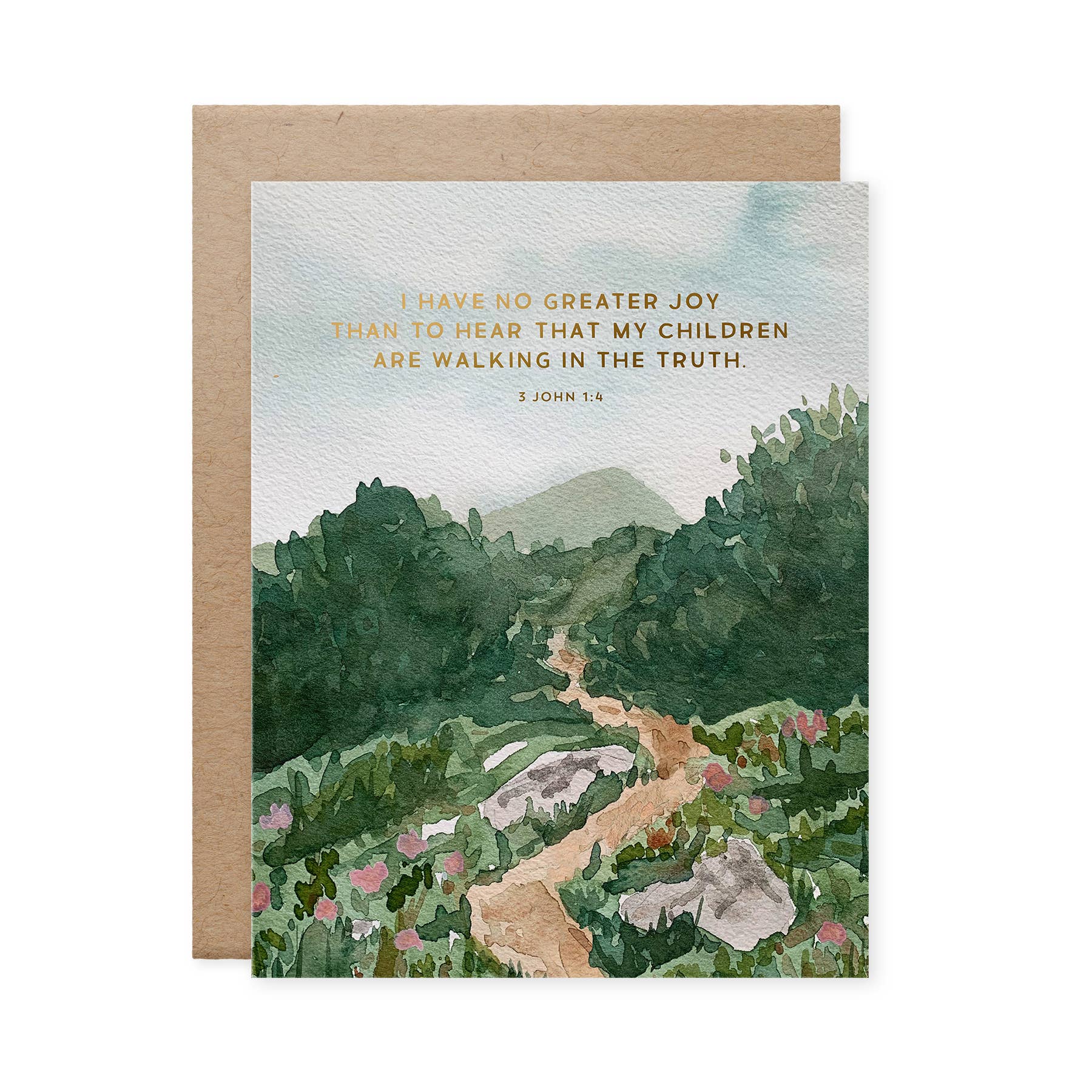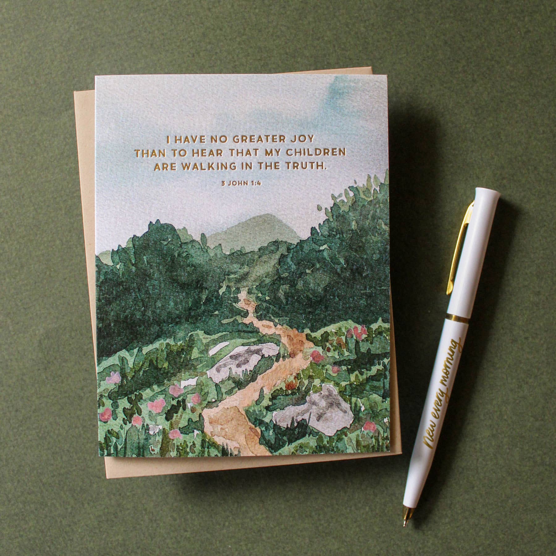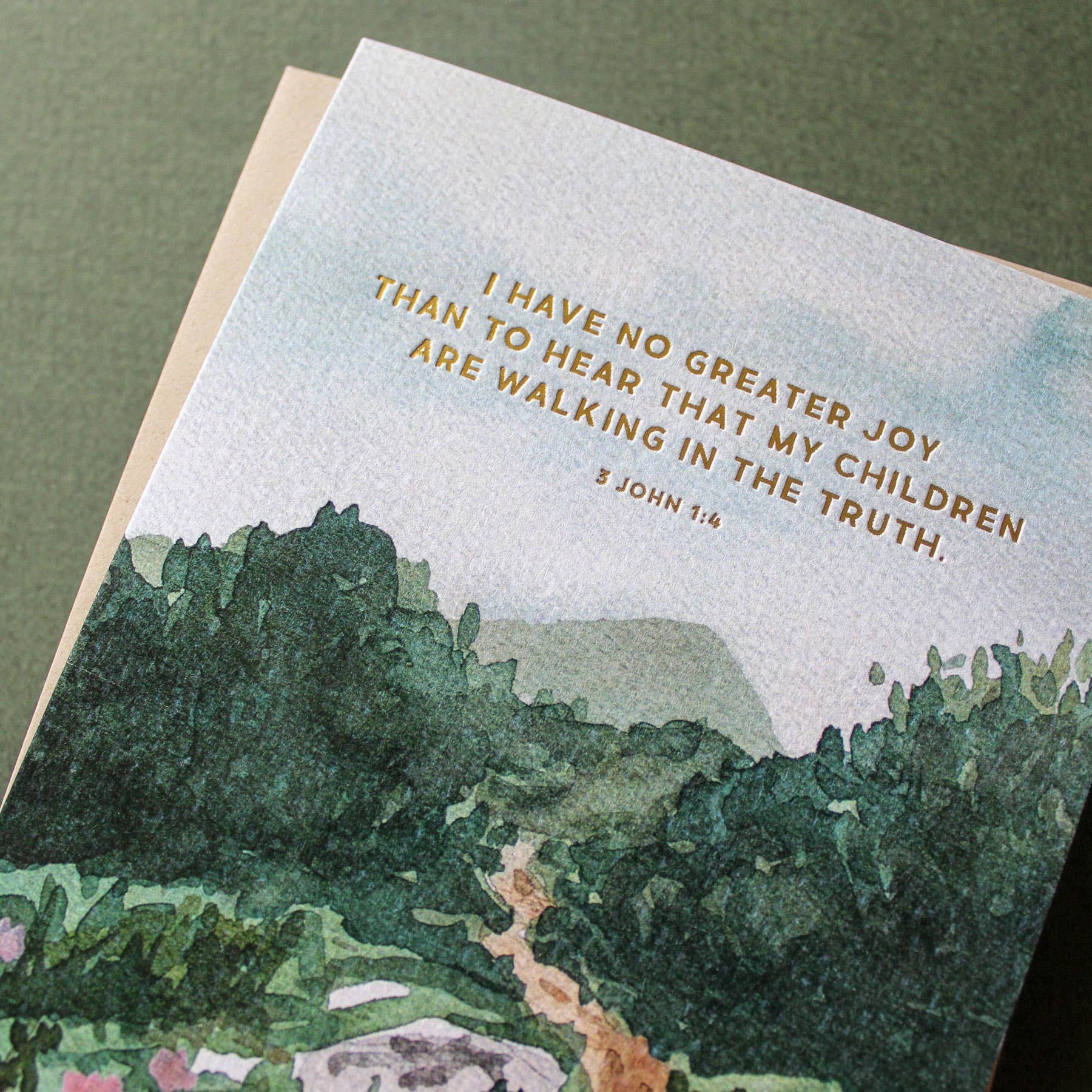 This original watercolor painting paired with this foil pressed encouraging verse from 3 John make this card a beautiful & heartfelt way to encourage a young person as they continue their walk in the faith through the "narrow path" that leads to everlasting life!
