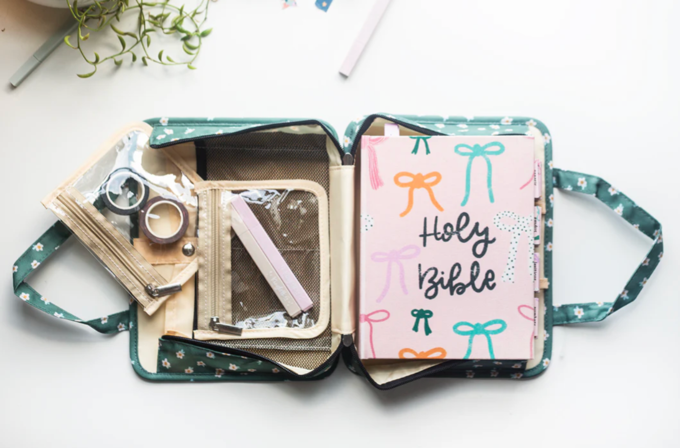 Looking for the perfect Bible bag? The Olive Mini Daisy Bible Bag is thoughtfully designed to meet all your needs, whether you're heading to church, a Bible study, or a prayer group. Its just-right size ensures it’s not too big or too small, and the multiple pockets make it easy to carry all your essentials—your Bible, journaling pens, pencils, keys, and phone—while staying organized.