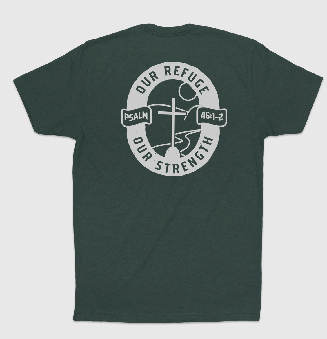 This shirt was created not just to raise funds—but to stand in faith and support with those affected. The cross design is inspired by the one overlooking Camp Mystic, and the verse Psalm 46:1-2 is a reminder that even in disaster, “God is our refuge and strength, an ever-present help in trouble.”