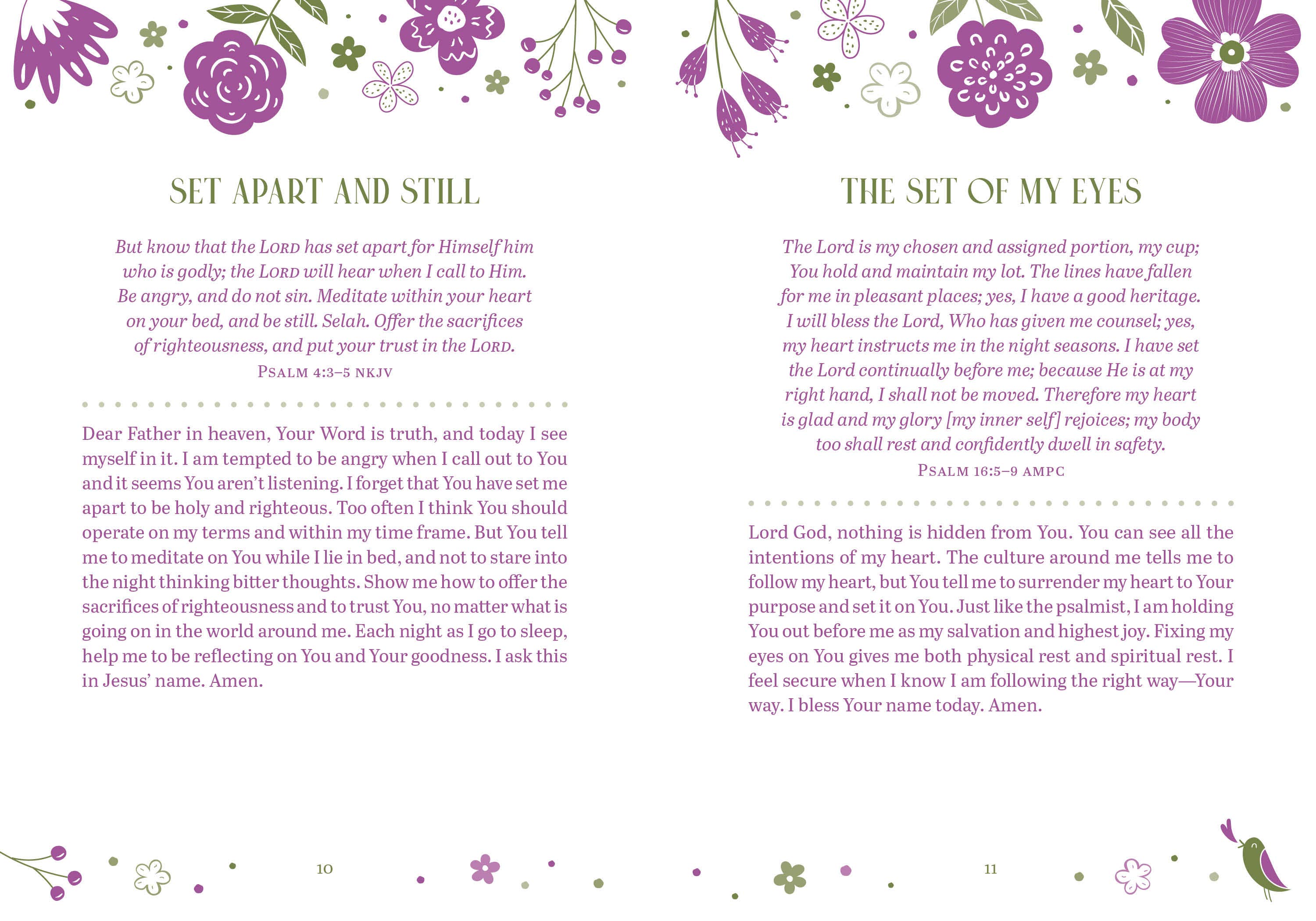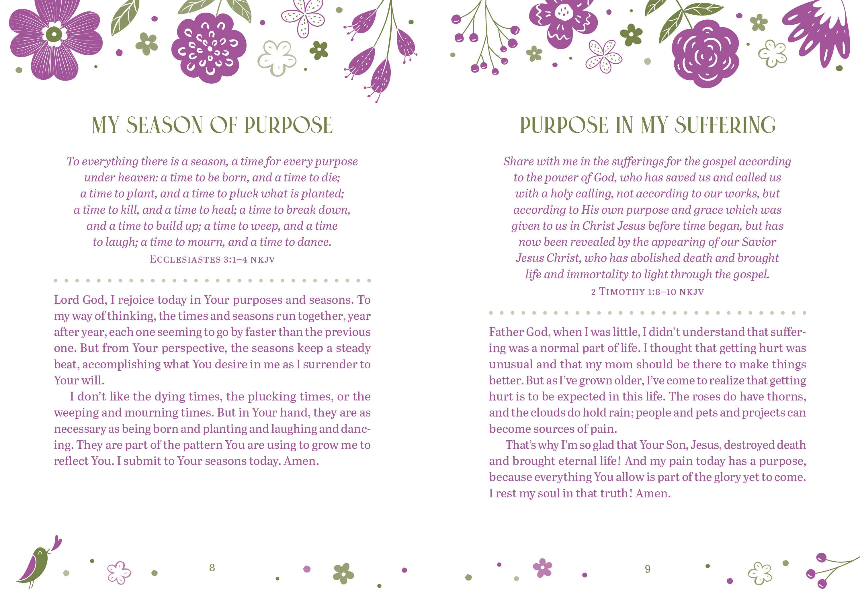 These 200 devotional-like prayers will encourage you to be mindful and pray as you encounter encouragement and hope for everyday living. Each prayer begins with a relatable scripture selection to help clear your mind as you begin your one-on-one time in the heavenly Father's presence. Whether you are overworked, overstressed, overwhelmed, or just "over" the craziness of life, you will welcome the peace and comfort this delightful prayer book brings to your daily quiet time.