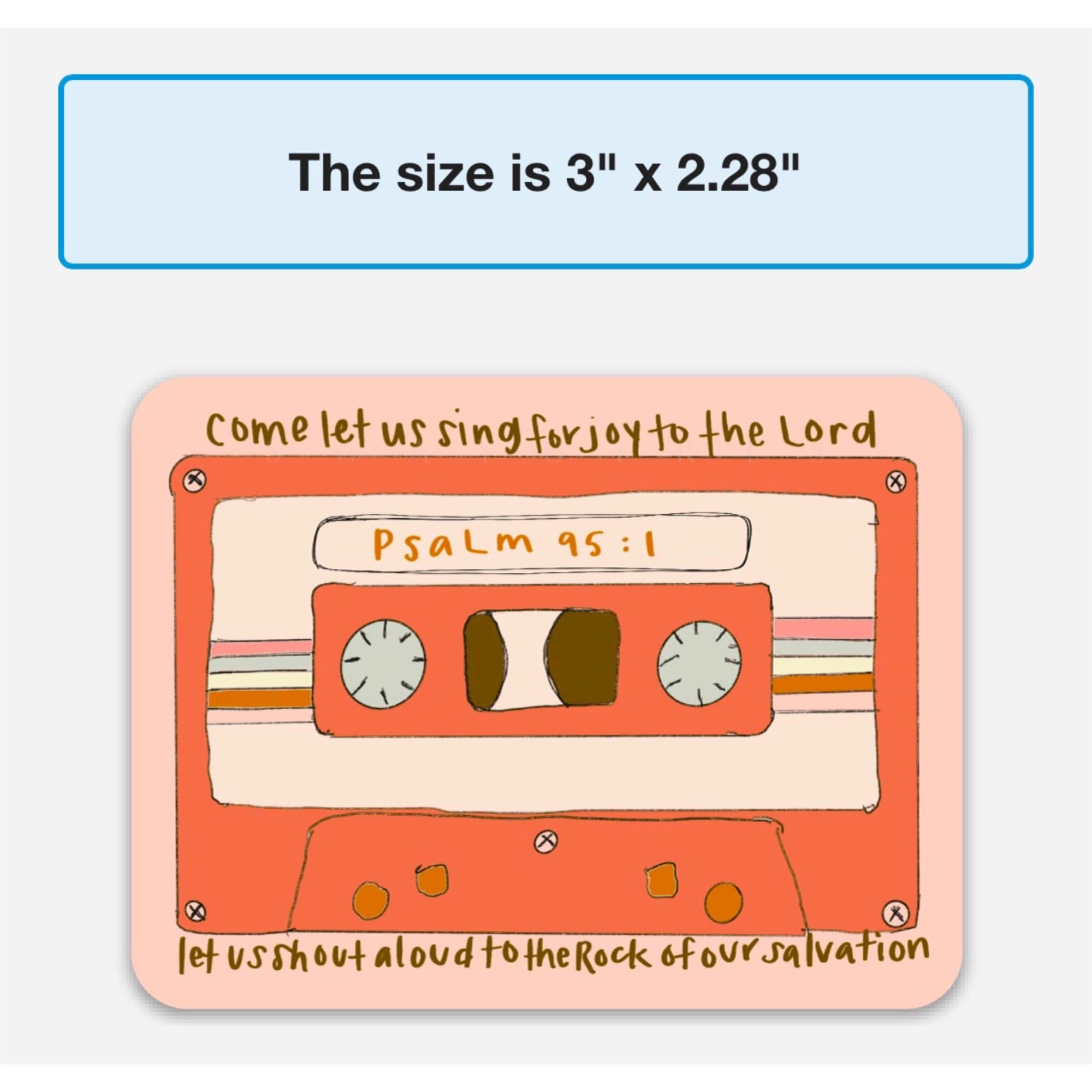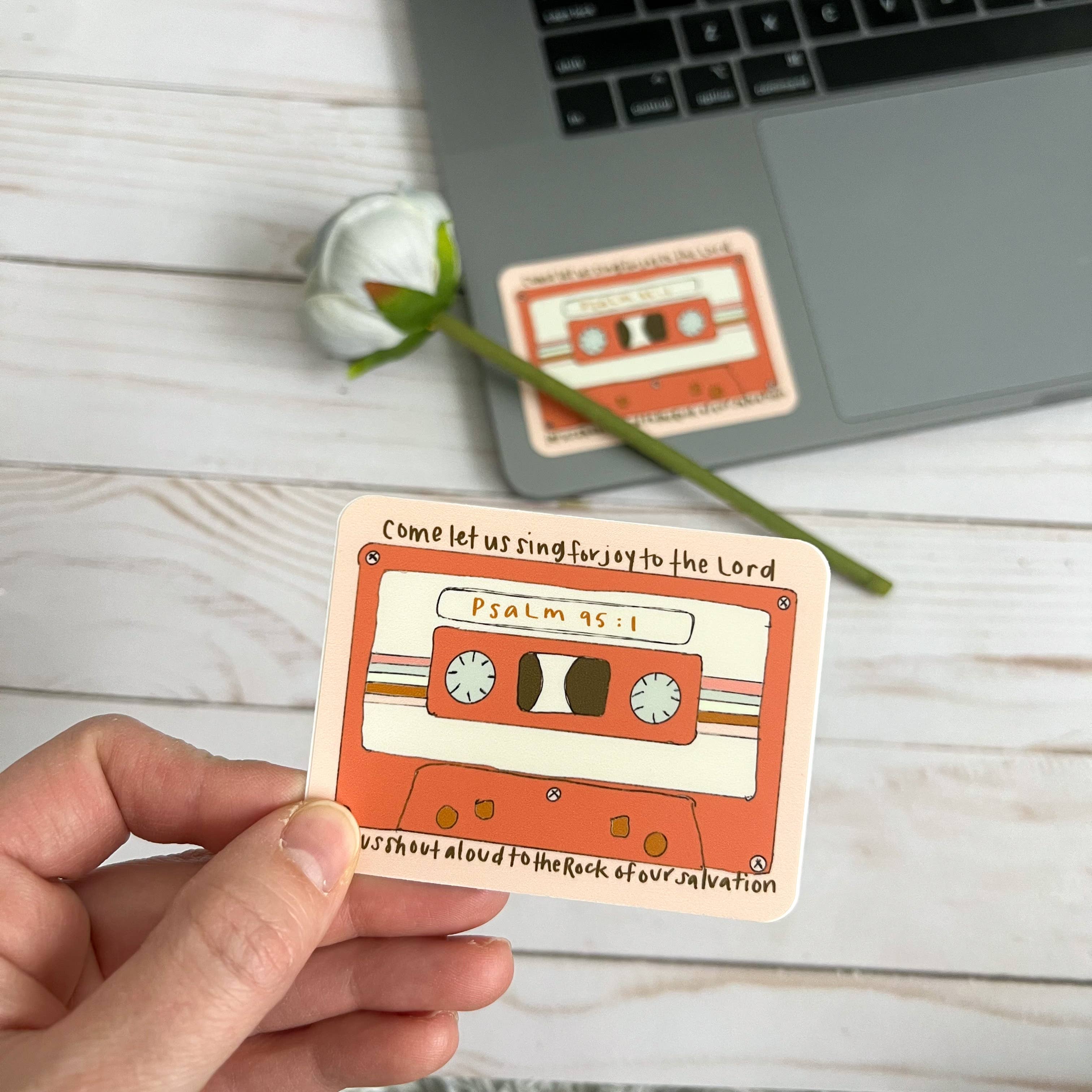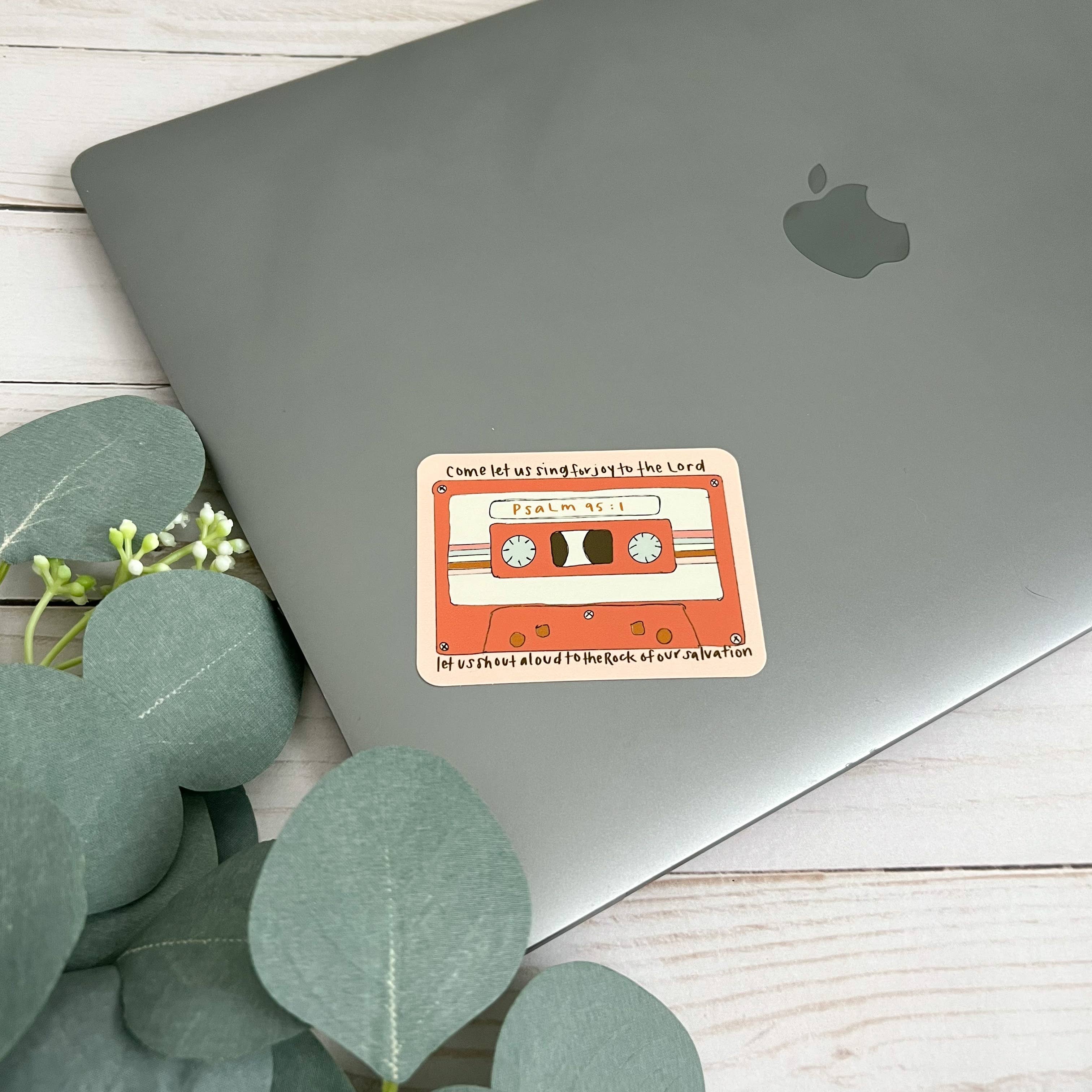 This Christian faith sticker from the Bible verse quote Psalm 95:1 has such a cute old school tape backdrop.