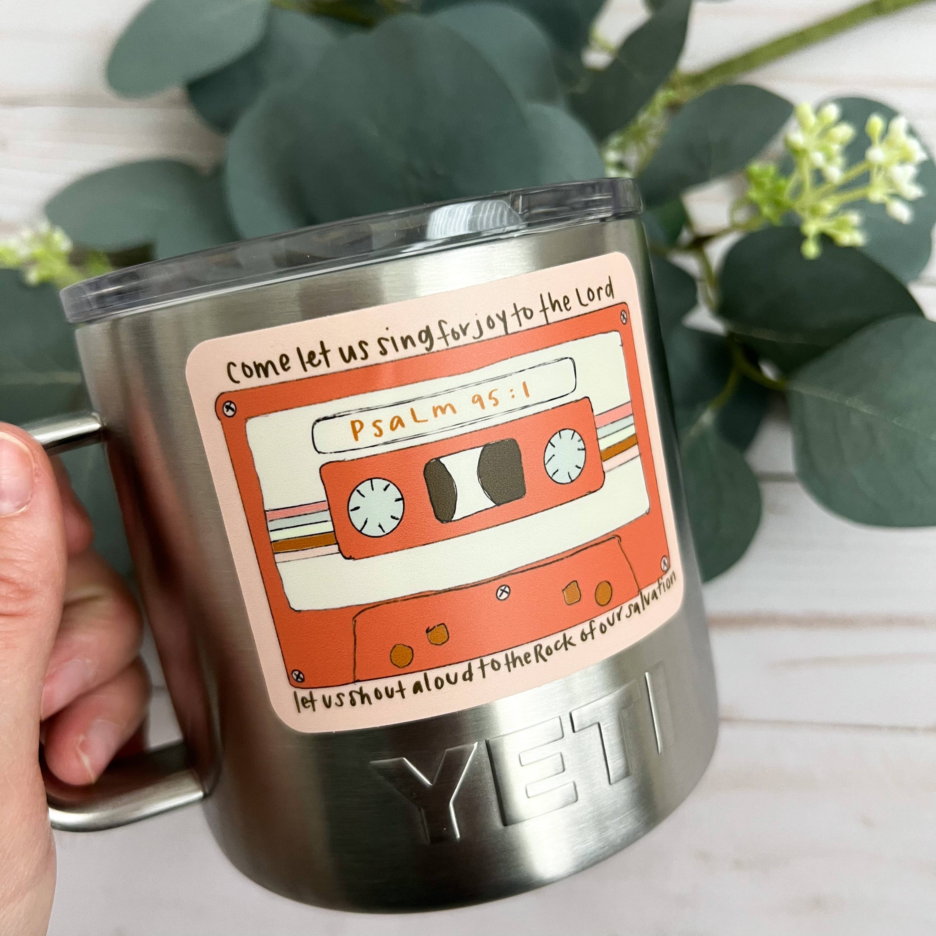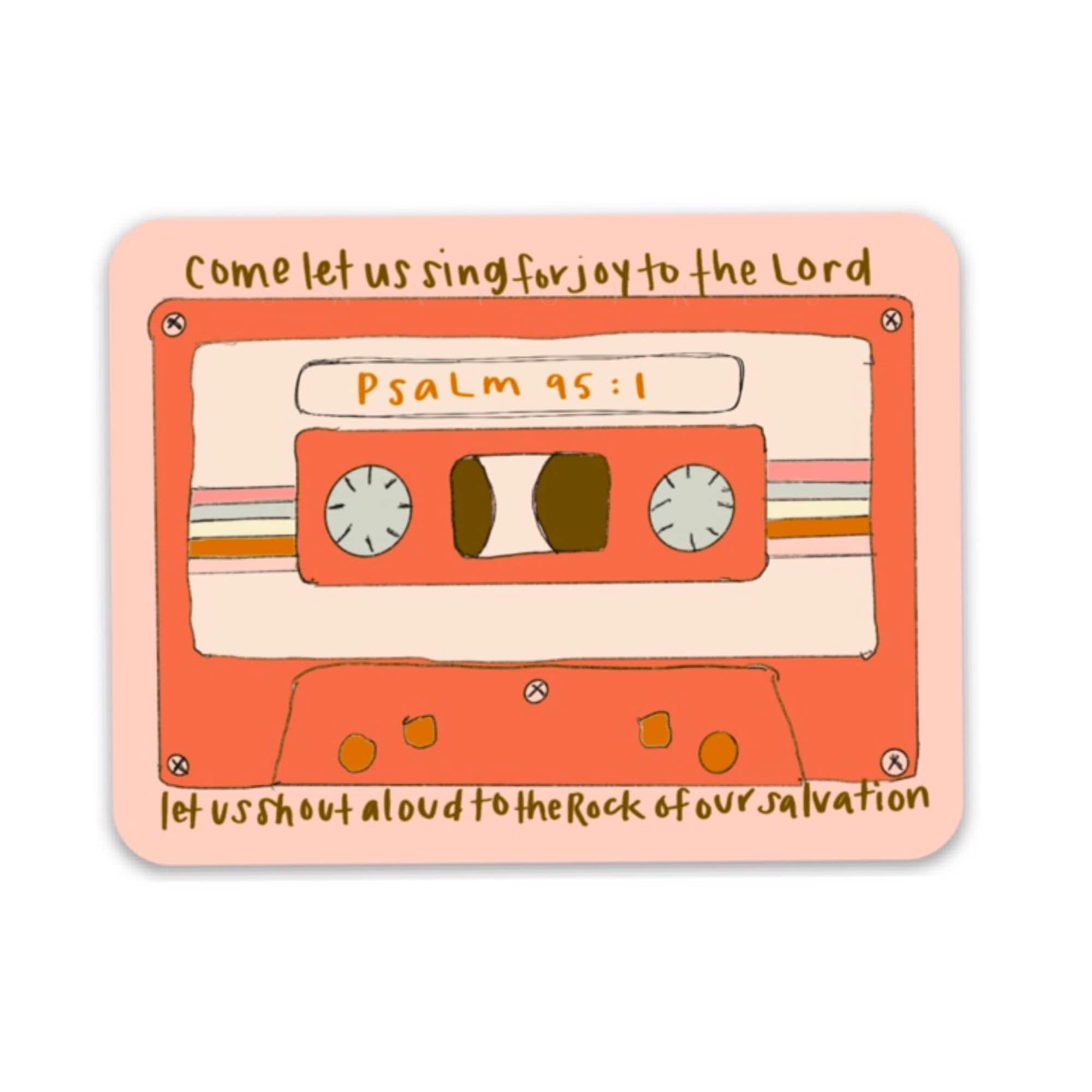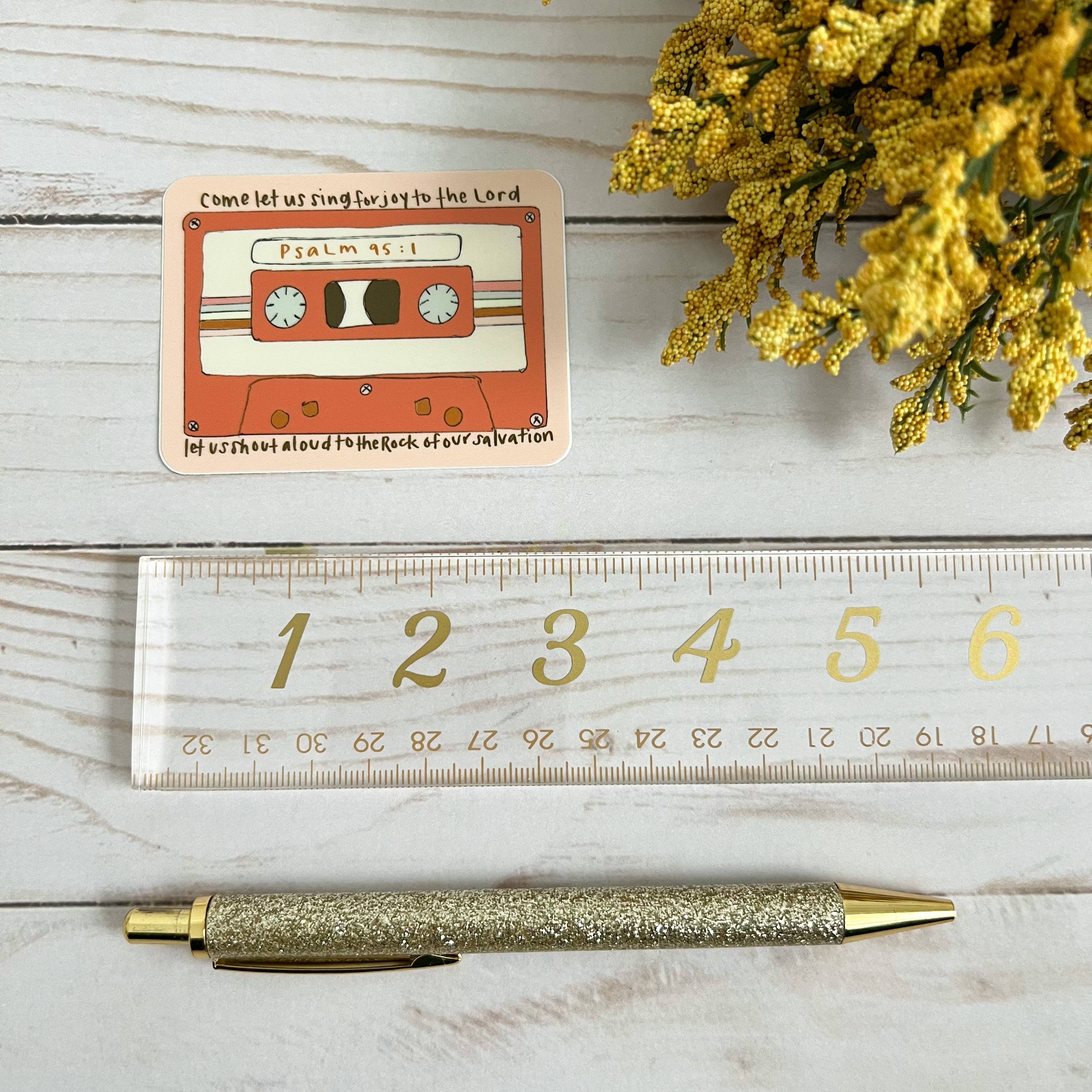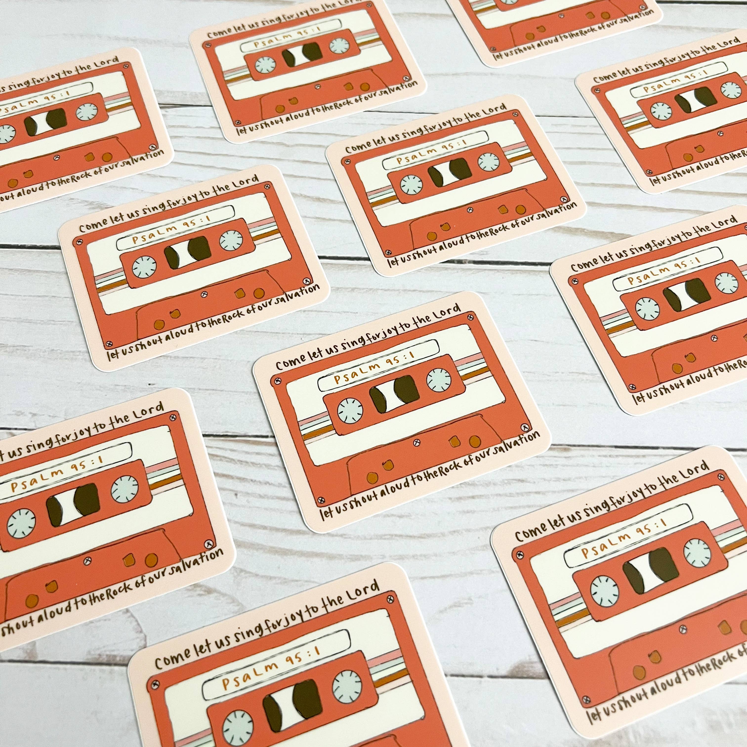 This Christian faith sticker from the Bible verse quote Psalm 95:1 has such a cute old school tape backdrop.