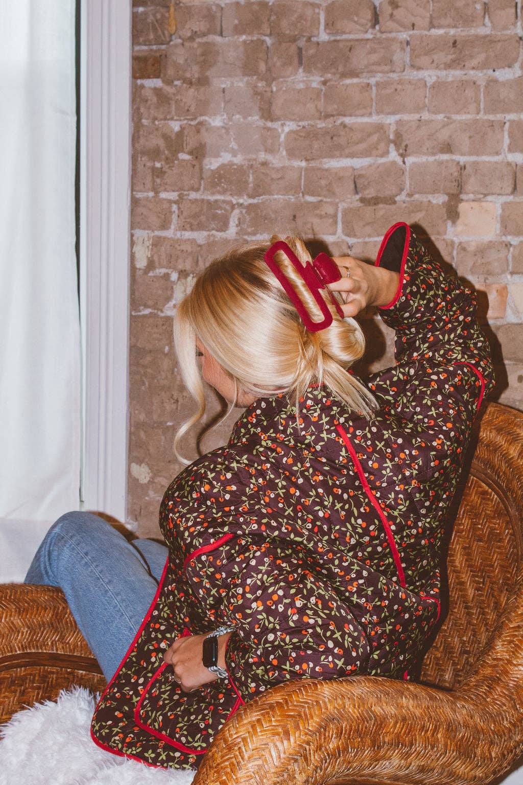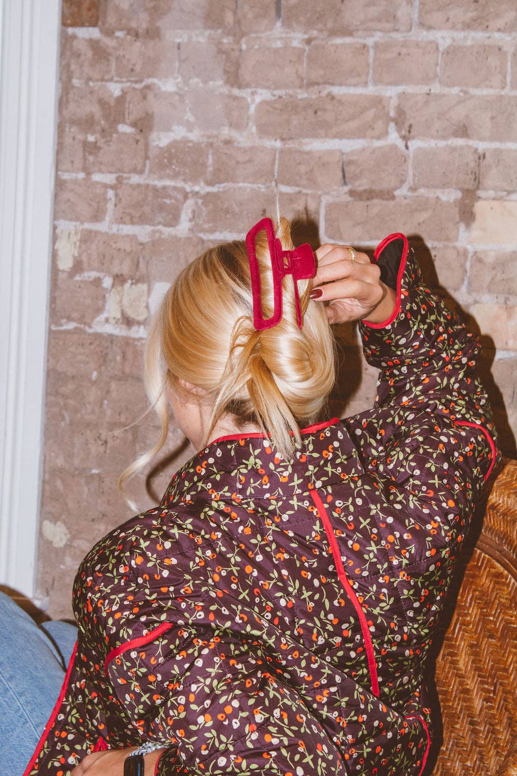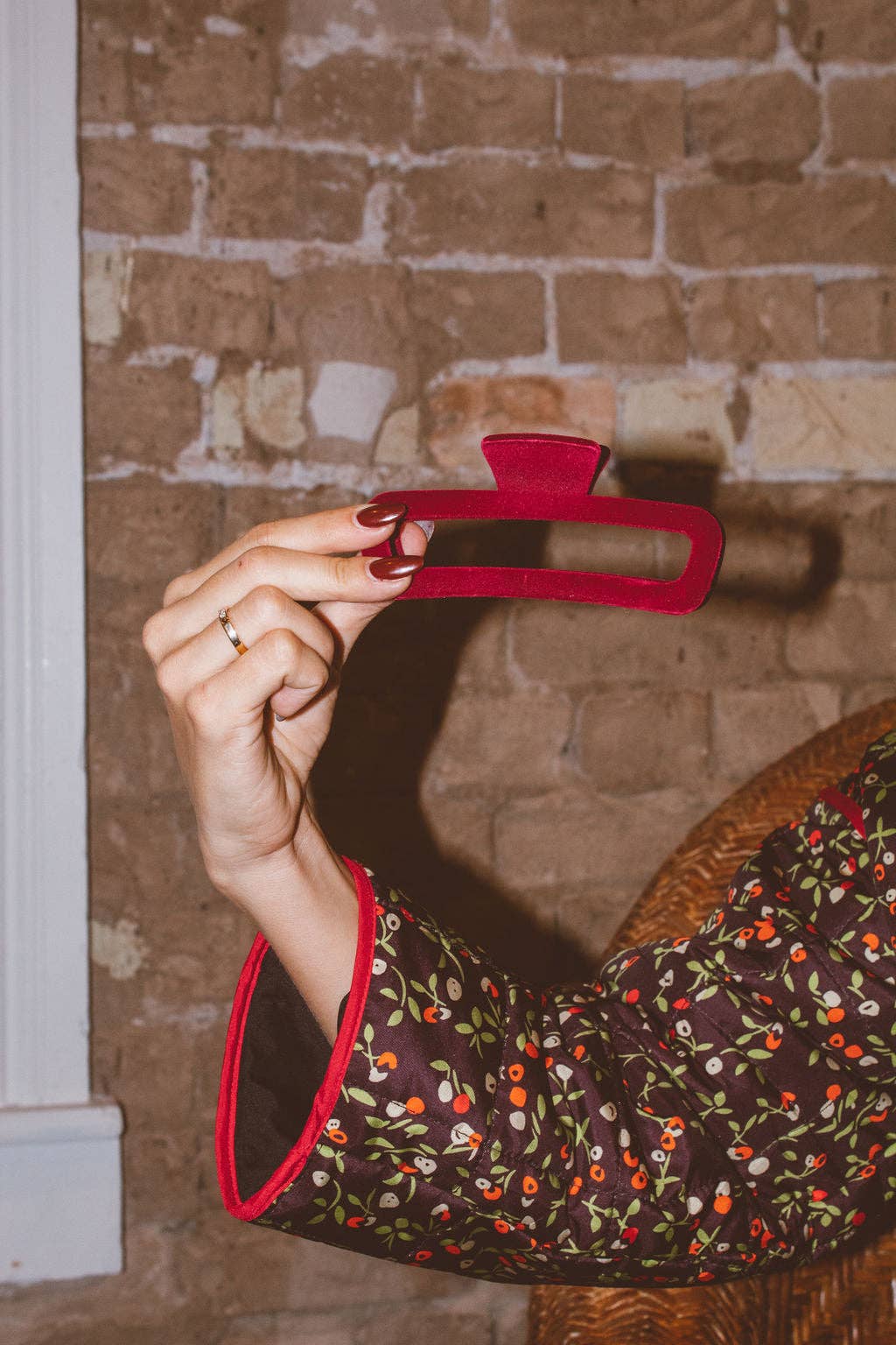 This ruby red, flocked velvet claw clip is going to be a season favorite! It has a long skinny rectangle shape, and is perfect for any hair type, with a tight and firm hold that will secure large amounts of hair. It is a 5-inch, XL claw clip.