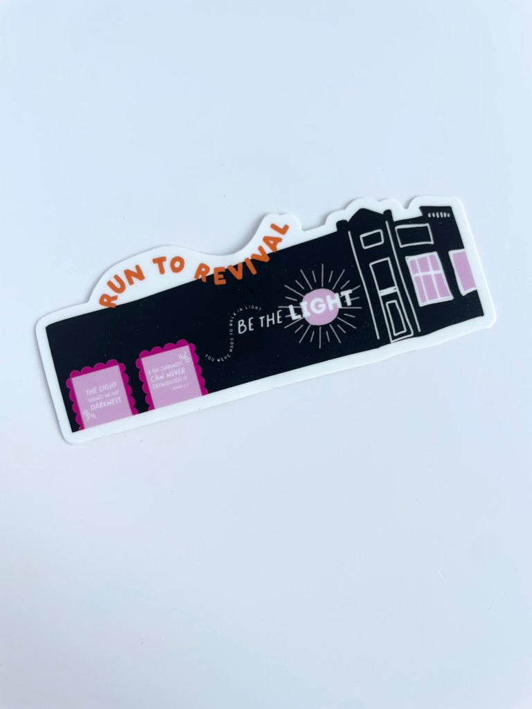 Enhance your style with our Run to Revival's Flagship Sticker. Made with durable vinyl, this 4"x1.5" custom sticker adds a touch of love to any surface. Perfect addition to any gift!