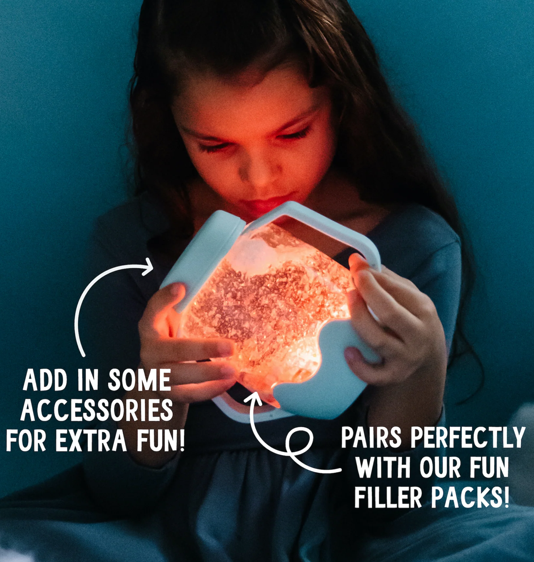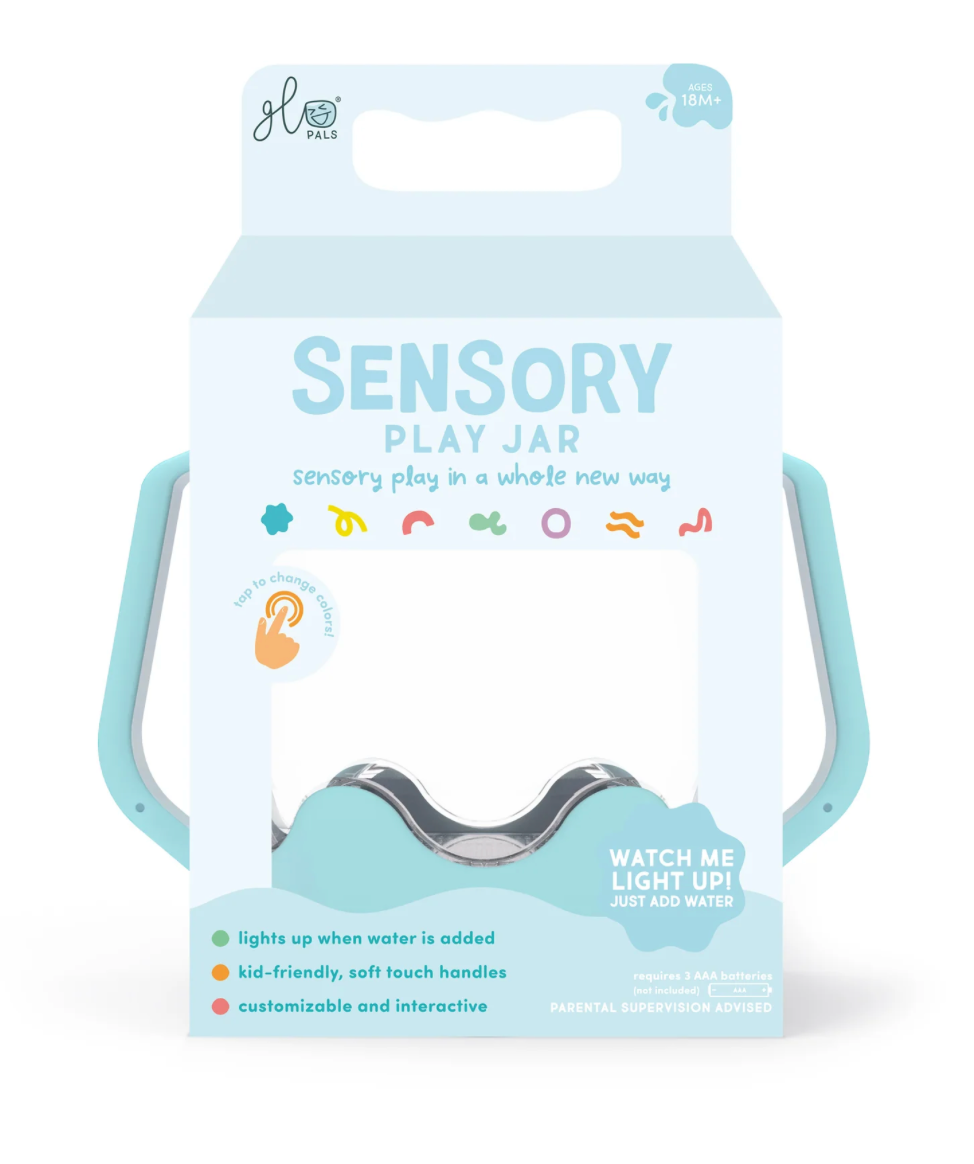 HOW TO CARE FOR YOUR SENSORY PLAY JAR: Remove all contents and liquid after play time. Hand wash ONLY with soap and water. Please keep the battery compartment dry and do not submerge your Jar in water. To turn Jar OFF, simply turn it over and rest it upside down. This will turn the liquid activation technology off, making your batteries last longer.
