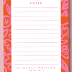 This is our lined page notepad, with a summery pattern around the edge of this notepad. With a colour palette of pink and orange. This notepad is a lovely way to record your shopping, leave a note or give as a gift for a birthday, Christmas present or just because you are thinking of someone. Each page of this notepad has the verse from Psalm 46:10, ‘Be still and know that I am God.’ What an encouragement to read daily on your notepad.