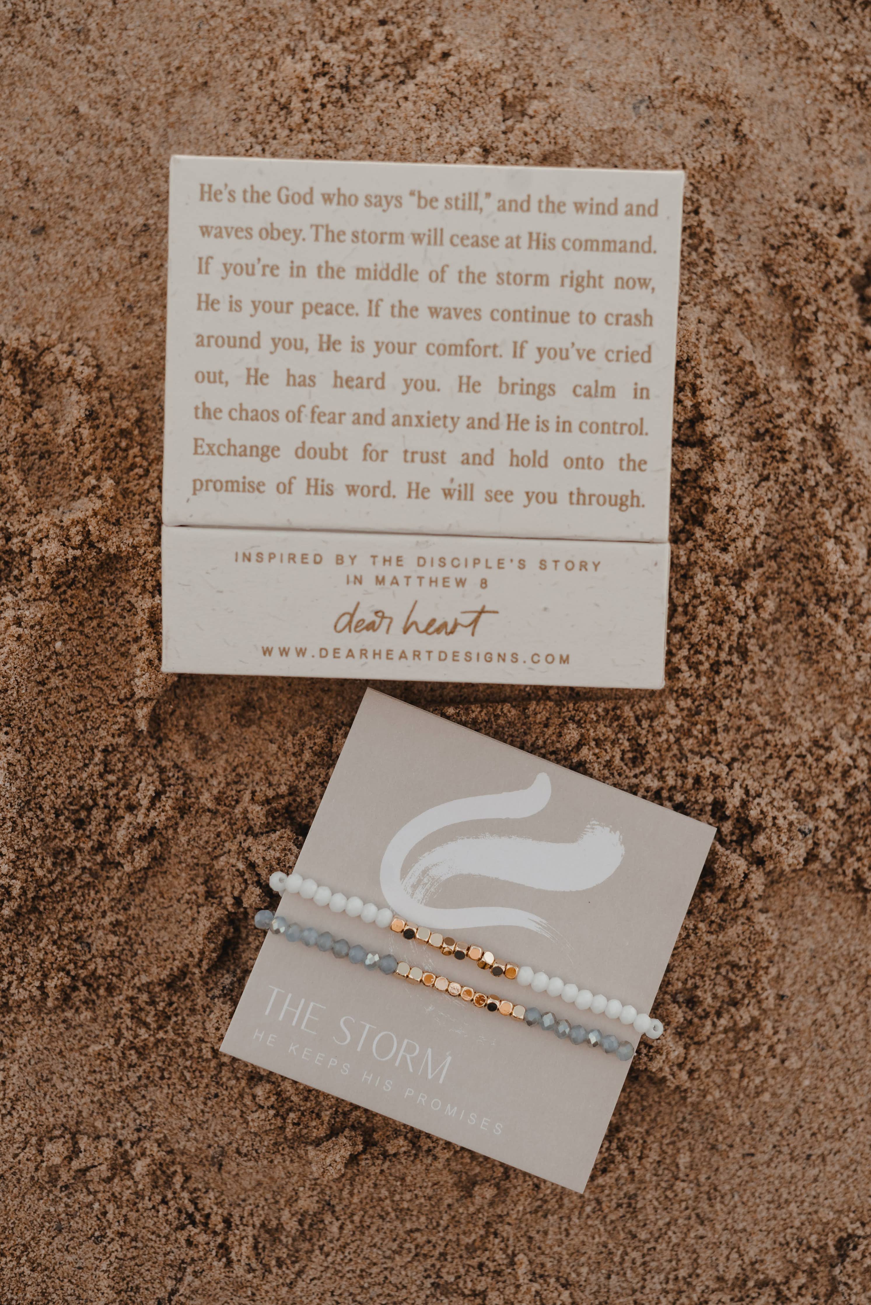 He's the God who says "be still", and the wind and waves obey. The storm will cease at His command. If you're in the middle of the storm right now, He is your peace. If the waves continue to crash around you, He is your comfort. If you've cried out, He has heard you. He brings calm in the chaos of fear and anxiety and He is in control. Exchange doubt for trust and hold onto the promise of His word. He will see you through. Inspired by the Disciple's story in Matthew 8 The misty blue bracelet represents the storm that surrounded the disciples in the boat, while the white bracelet represents Jesus calming the storm around them. We believe these bracelets can truly change the world by creating conversations about Jesus. Our prayer is that they can bring hope to the lost, revival to the weary, and courage for the believer.