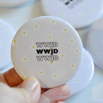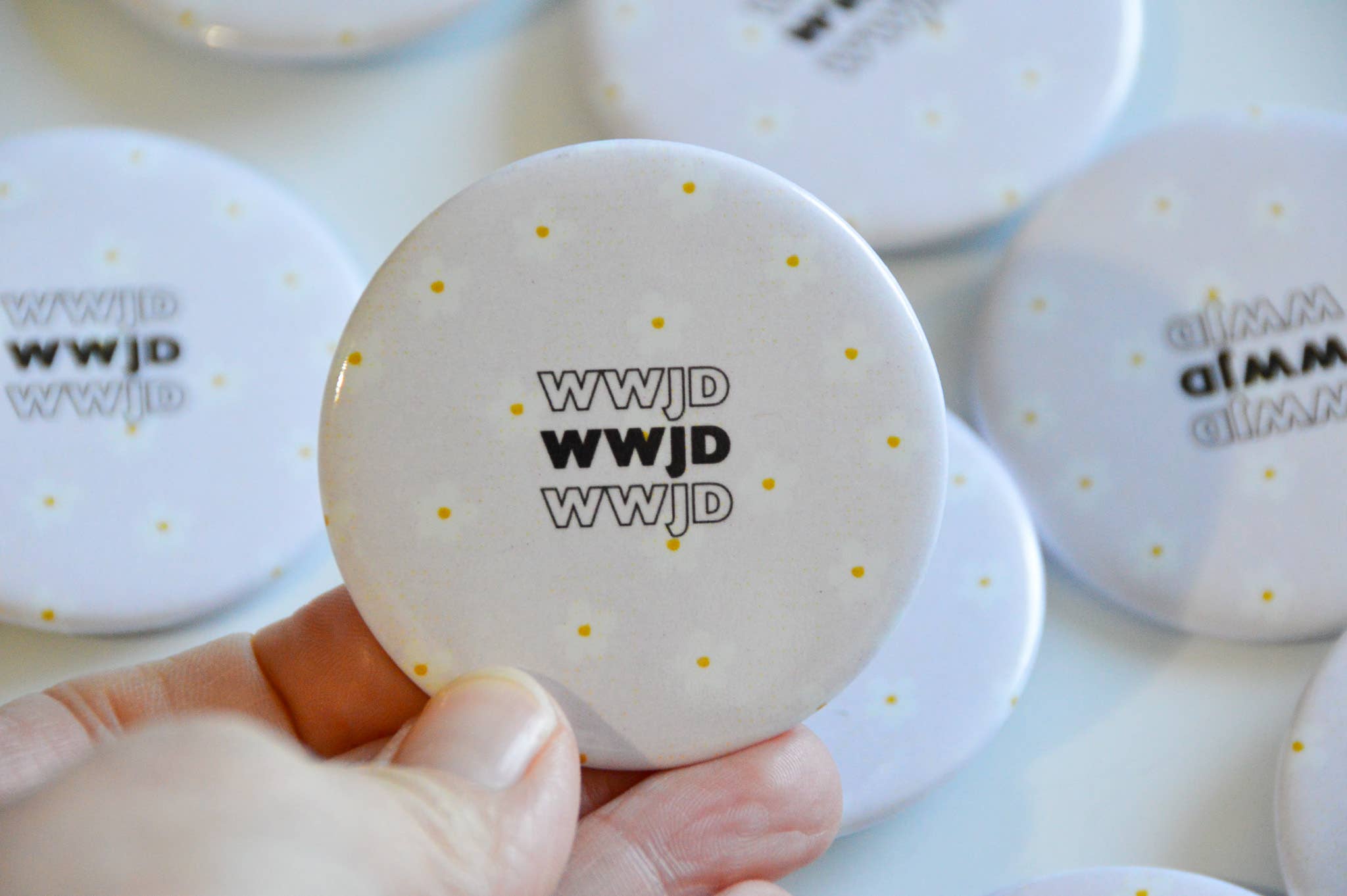 Celebrate your faith with this beautifully designed "WWJD" button! Perfect for anyone who wants to share a subtle yet powerful reminder of their identity in Christ. Whether you attach it to your bag, jacket, or lanyard, this pinback button is a meaningful accessory for everyday wear.
