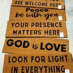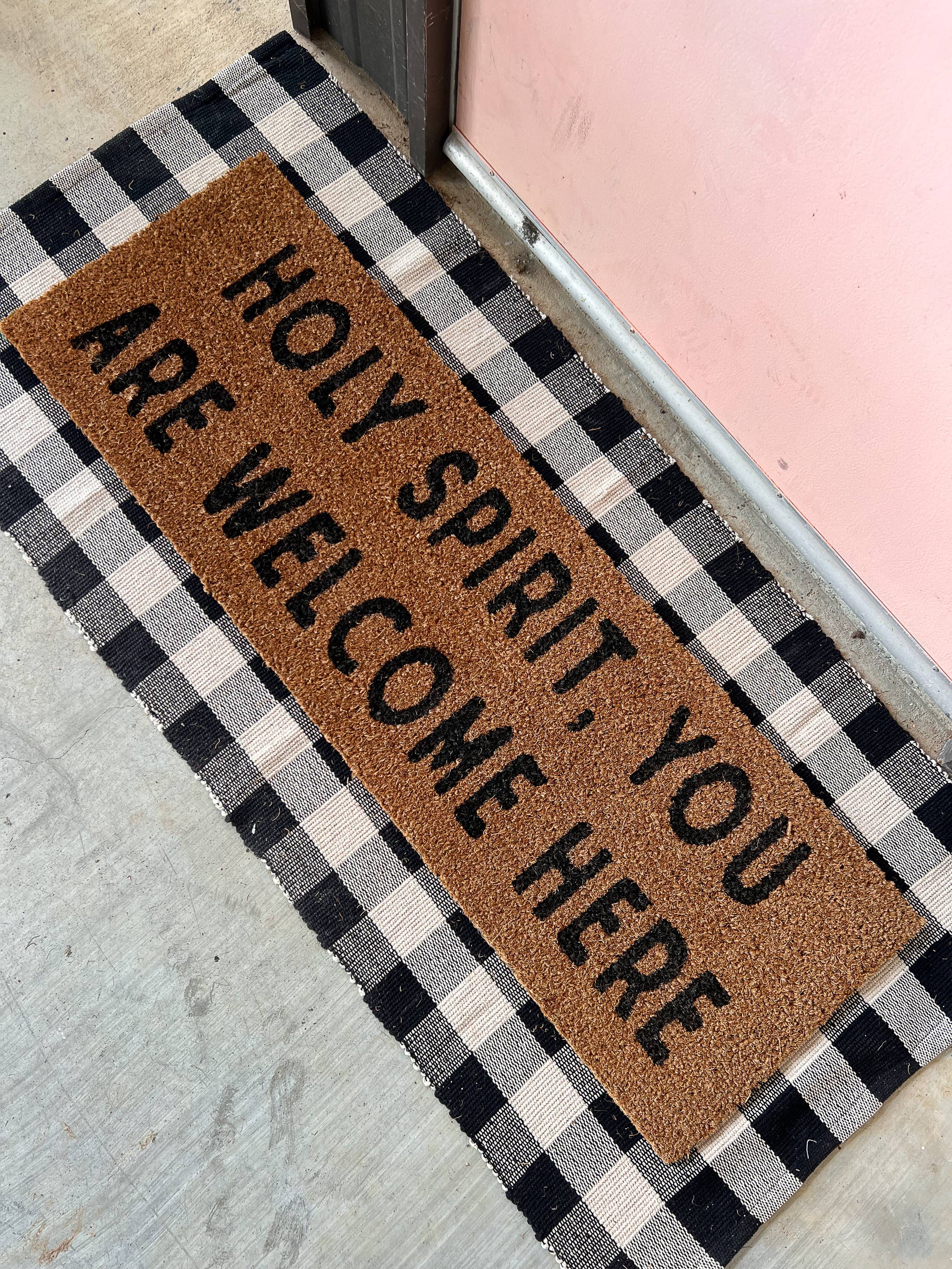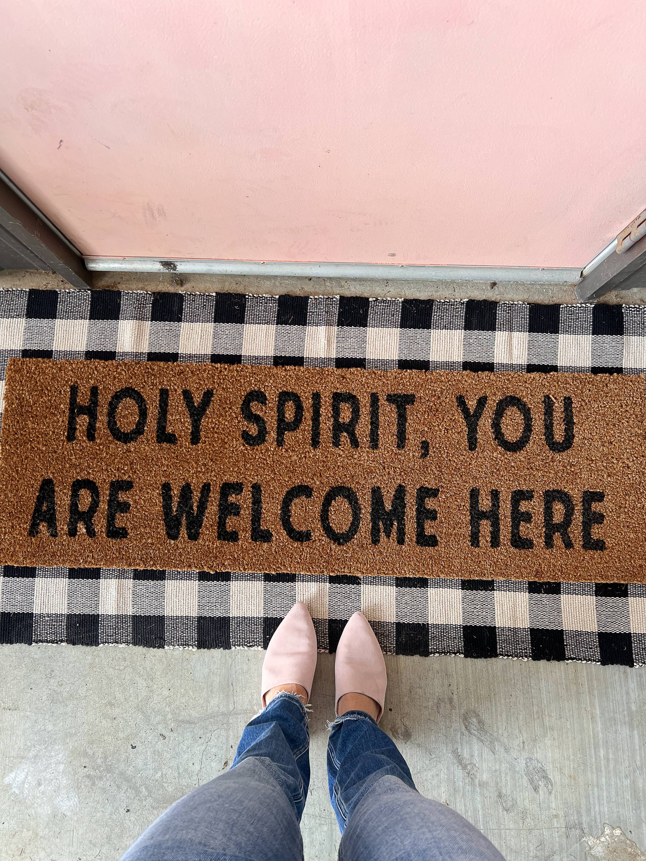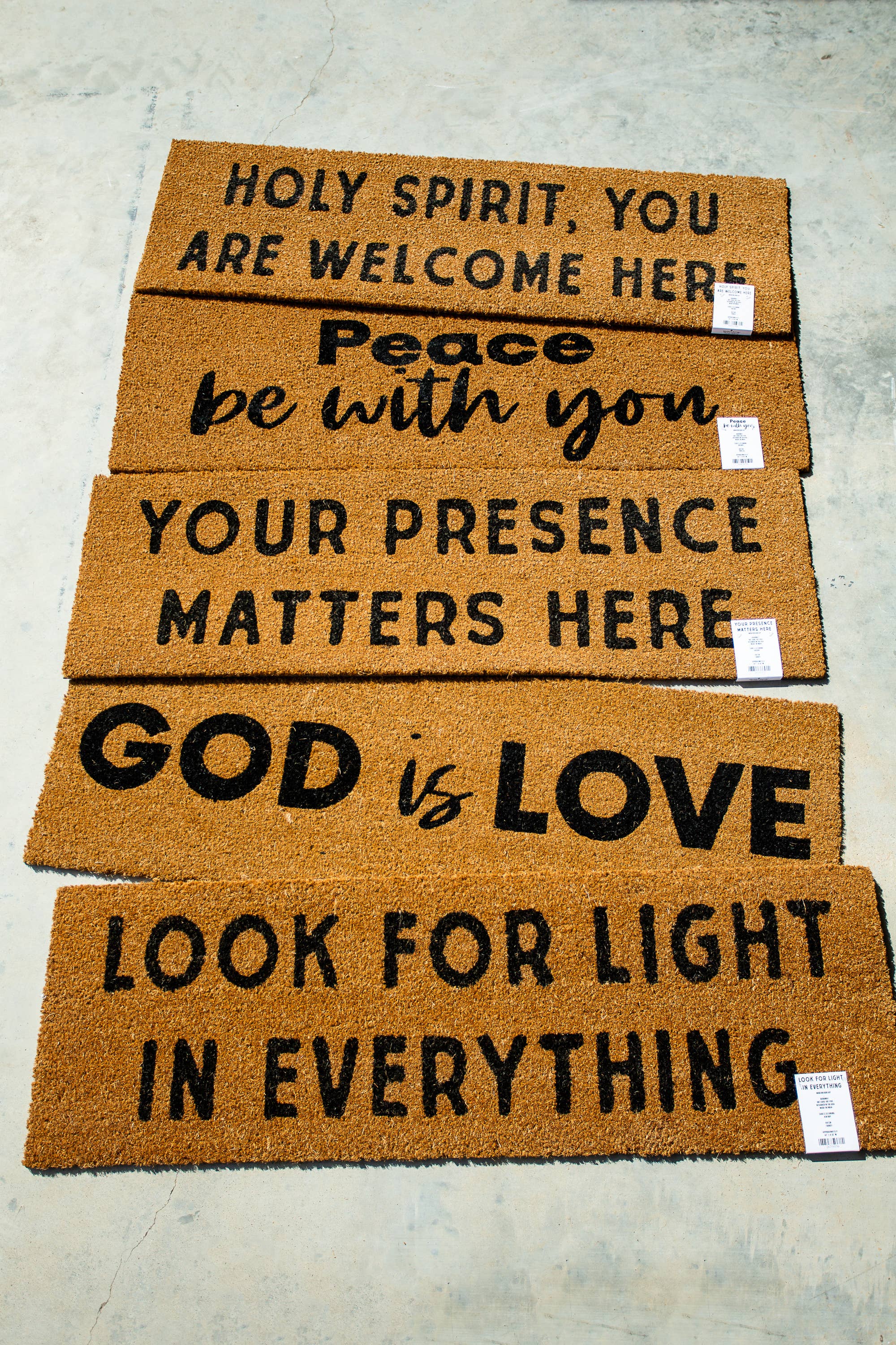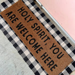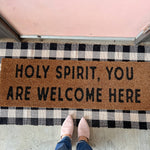 This doormat showcases the words "Holy Spirit, you are welcome here" to encourage everyone who enters or exits to turn to God, welcome His presence, and journey with Him every day.