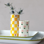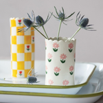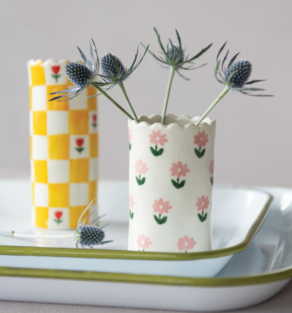 This handcrafted stoneware vase is a perfect blend of modern design and timeless elegance. The unique checkered pattern adds a contemporary touch to any space, while the neutral color palette ensures it will seamlessly fit into any decor style. With a diameter of 2-1/2" and a height of 5-3/4", this vase is ideal for displaying fresh flowers or greenery. Whether placed in your home or office, this vase will add a touch of sophistication and charm to your surroundings. Elevate your space with this stunning stoneware vase and enjoy its beauty for years to come.